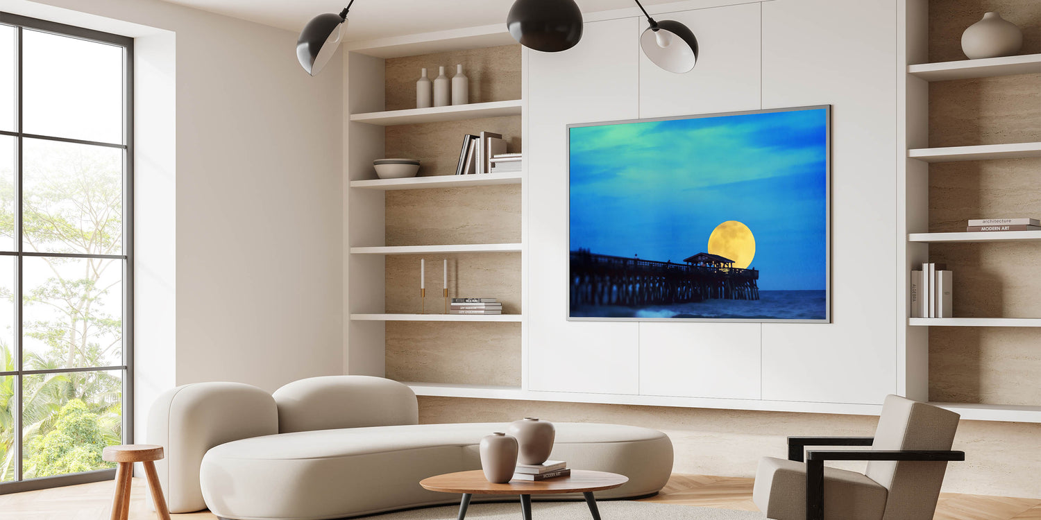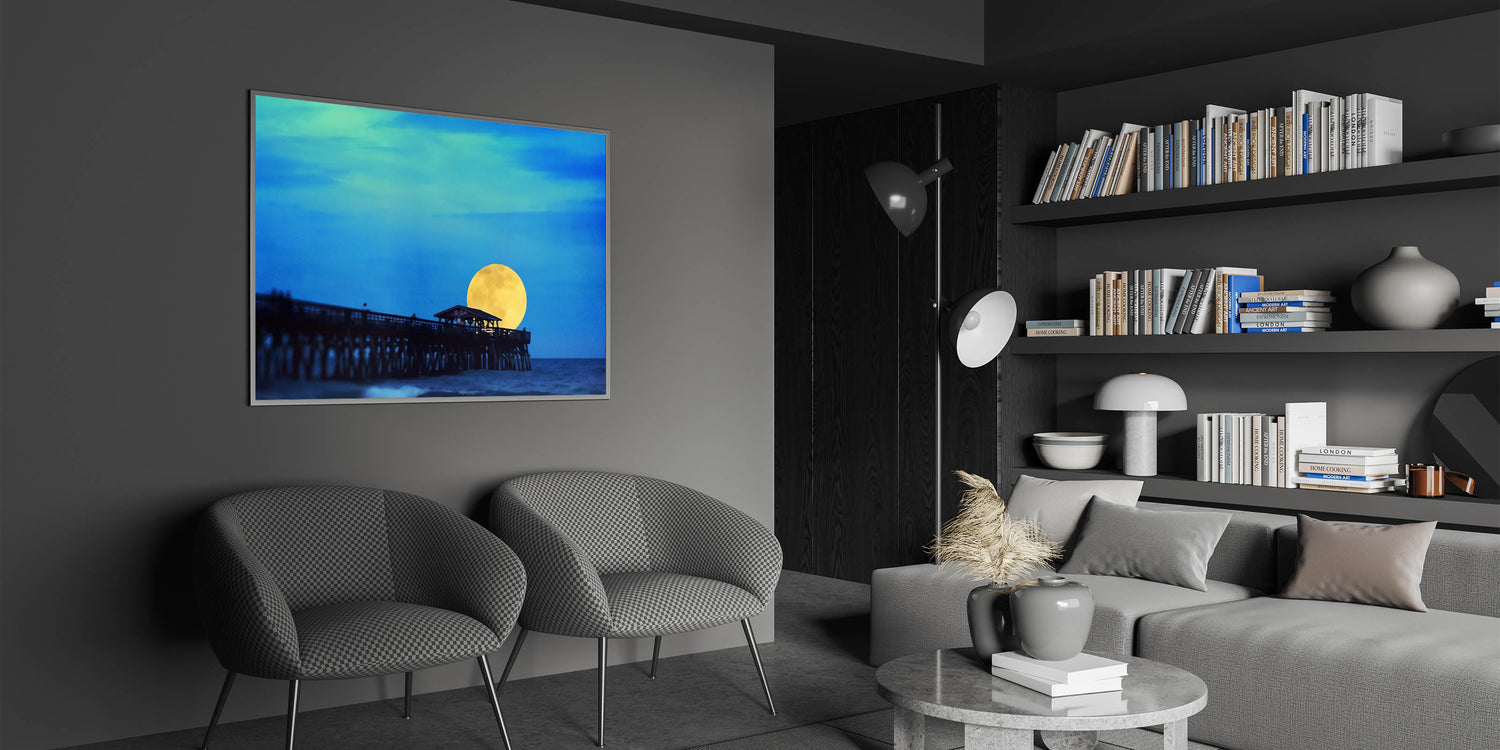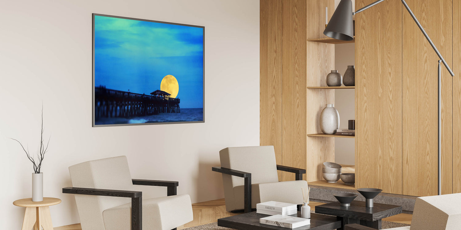 Illuminate your home with this mesmerizing Hilton Head art print, showcasing the enchanting moonrise over the famous Folly Beach Pier. This unique South Carolina wall art captures the serene beauty of the Lowcountry, with a glowing yellow moon rising against the rich blue night sky. Whether you’re a fan of coastal landscapes of South Carolina or looking for stunning Lowcountry art pieces, this high-quality canvas print will bring the tranquil essence of the Palmetto State right into your space.