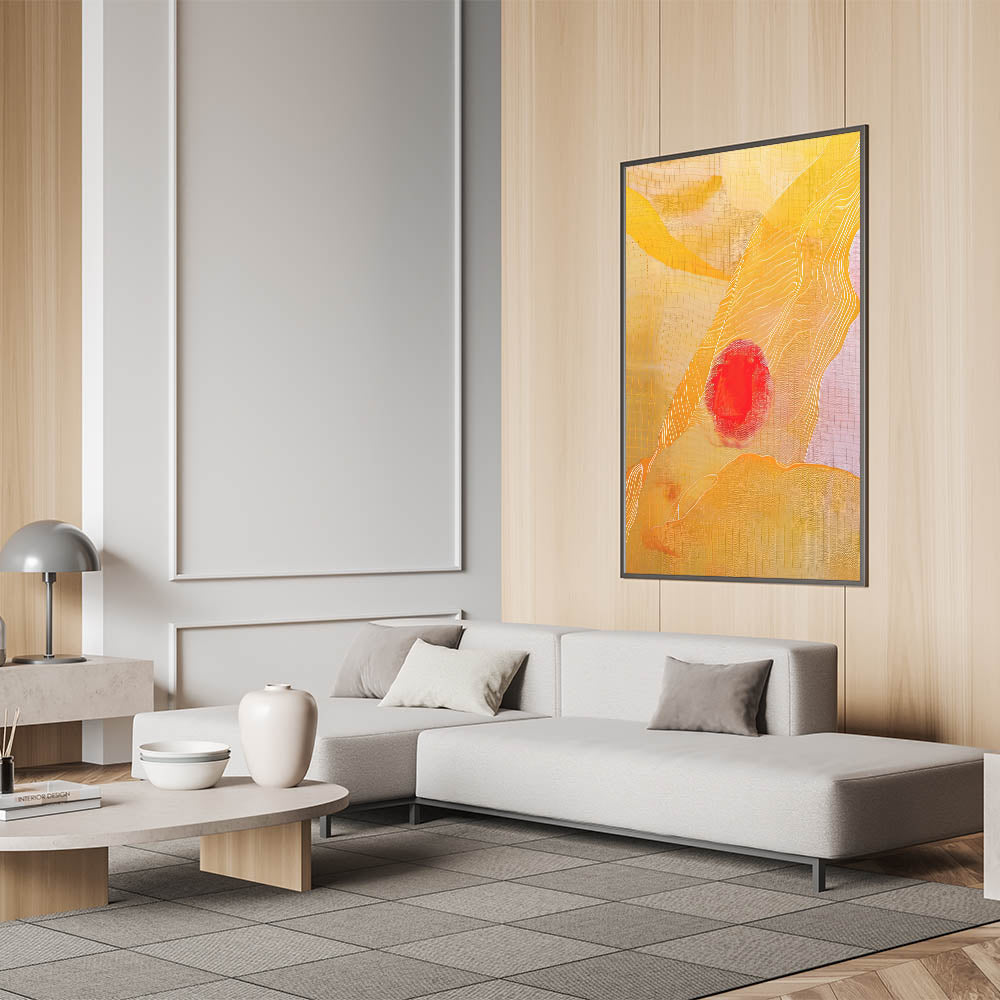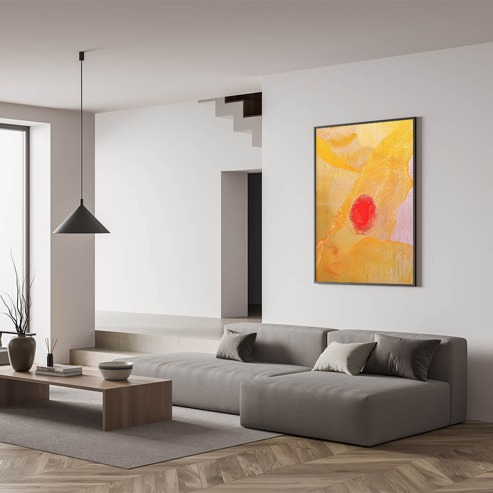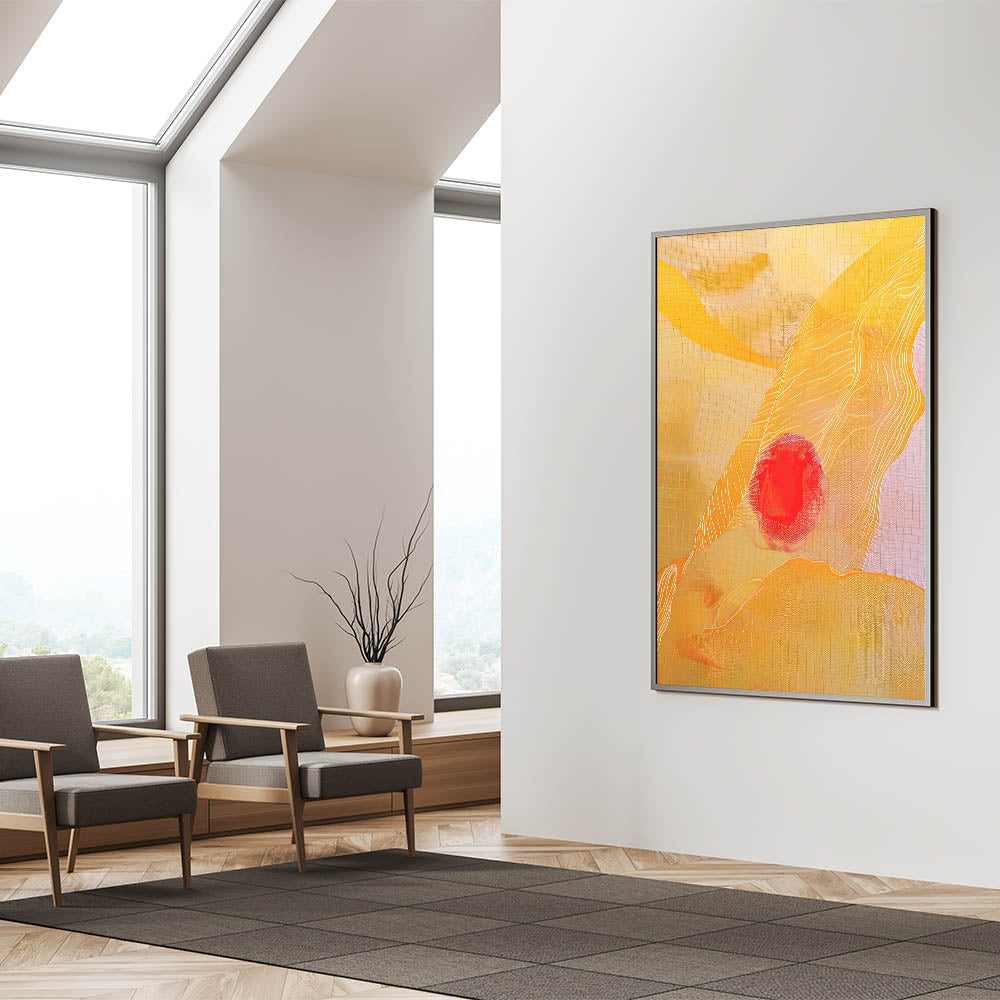 Brighten your space with this colorful abstract sunrise art, featuring warm tones of yellow, orange, and a bold red accent. The artwork’s intricate textures and flowing patterns evoke the feeling of sunlight spreading across a vibrant landscape, creating a joyful and energetic ambiance. This piece is perfect for adding a pop of color to modern and eclectic decor styles.