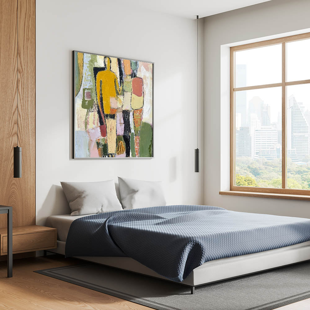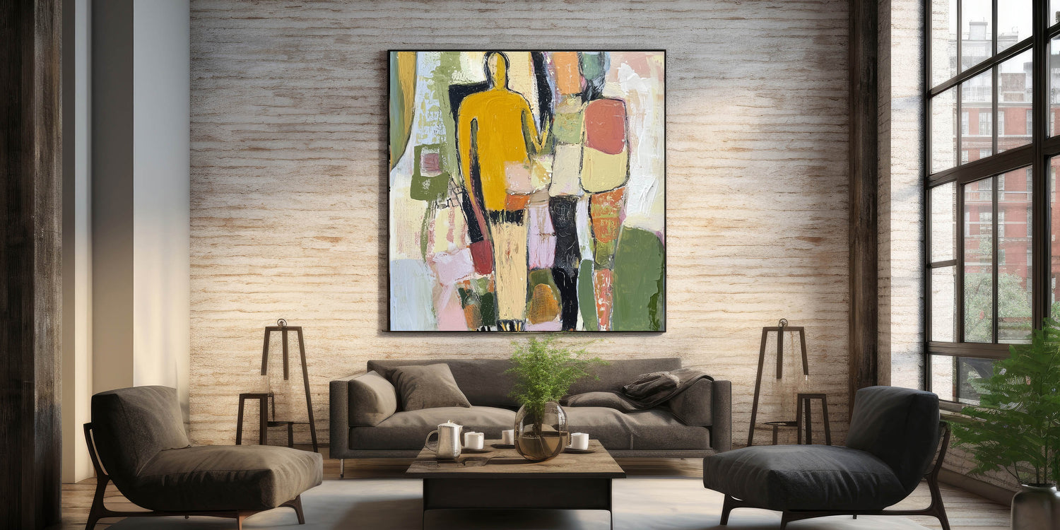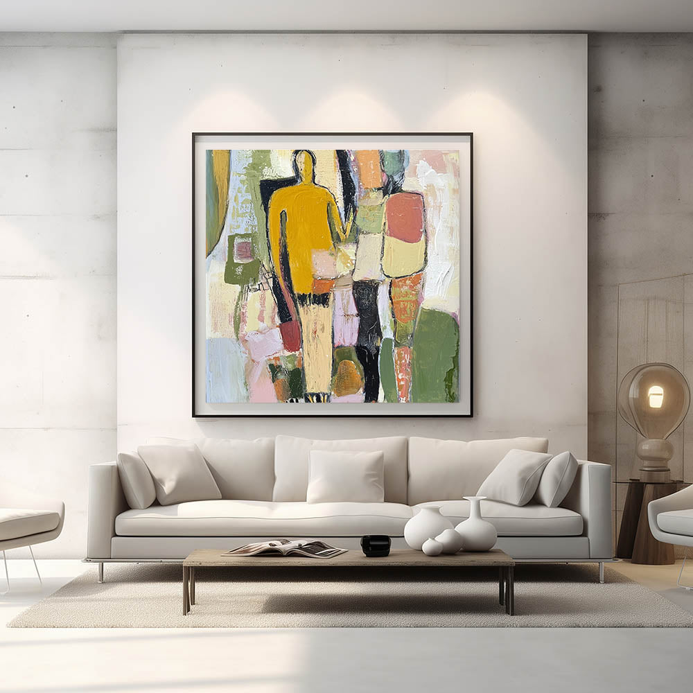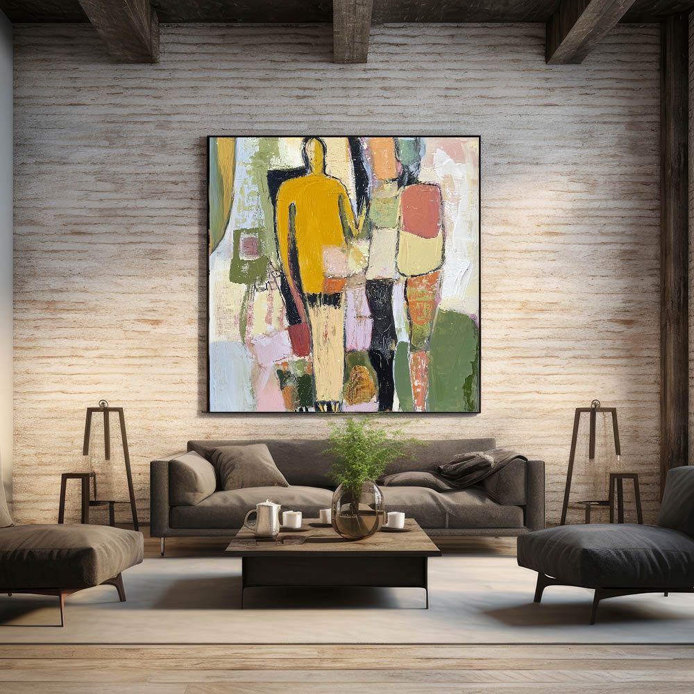 Enhance your space with this bold and expressive abstract figurative wall art. Featuring a striking composition of mustard yellow, olive green, and muted peach tones, this artwork combines dynamic brushstrokes with layered textures, creating a captivating visual statement. A perfect addition to modern living room decor, this canvas wall art brings a contemporary and artistic touch to any space.