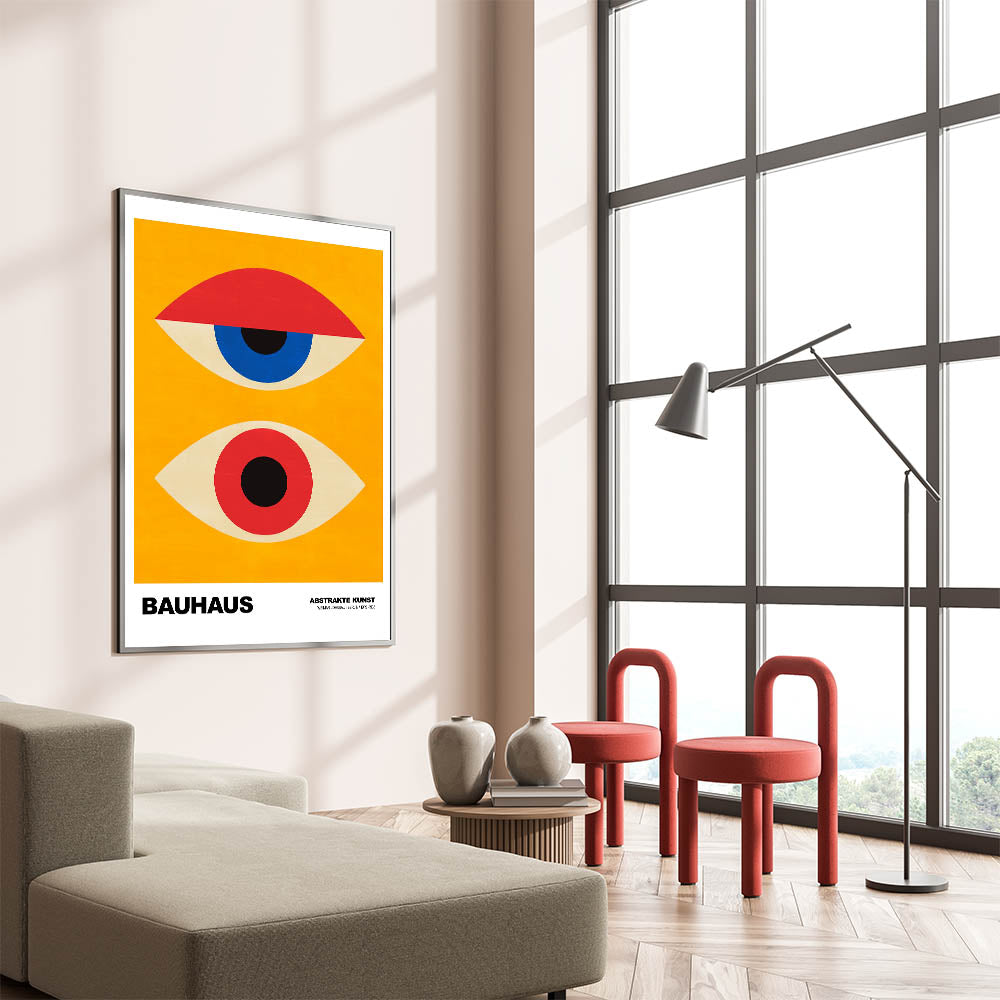 Add a touch of iconic modernism to your space with this captivating Bauhaus-inspired abstract art piece. Featuring a bold design of two geometric eyes in red, blue, and black set against a vibrant yellow background, this artwork embodies the timeless appeal of the Bauhaus movement. Perfect for enhancing the visual appeal of your home or office, this piece is available in various materials, such as stretched canvas, framed canvas, acrylic glass, and more, allowing for a customized look.