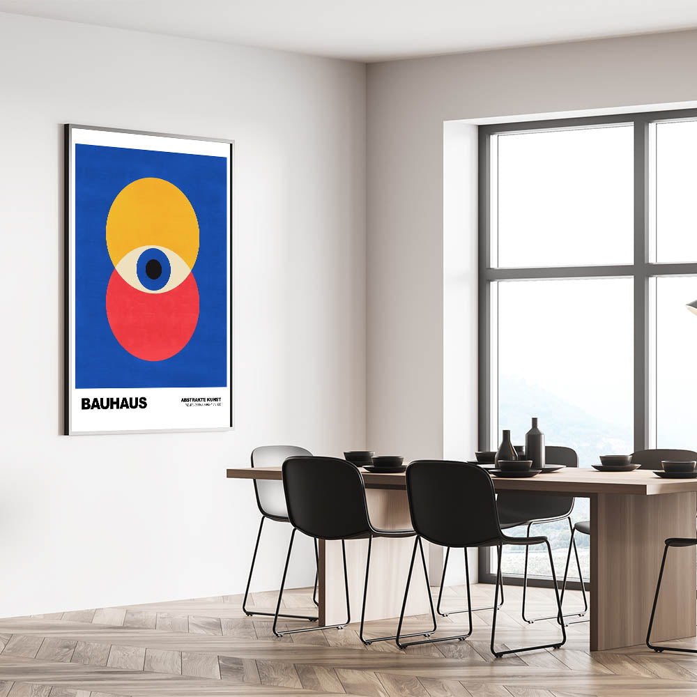 Embrace the spirit of modernism with this striking Bauhaus-inspired abstract art piece. Featuring bold geometric shapes with overlapping circles in yellow and red against a deep blue background, this artwork represents the iconic style of the Bauhaus movement. Its vibrant colors and eye-catching composition make it an ideal choice for those looking to add a dynamic element to their space. Available in various materials such as stretched canvas, framed canvas, acrylic glass, and more, this piece allows for a customized look that complements any decor.