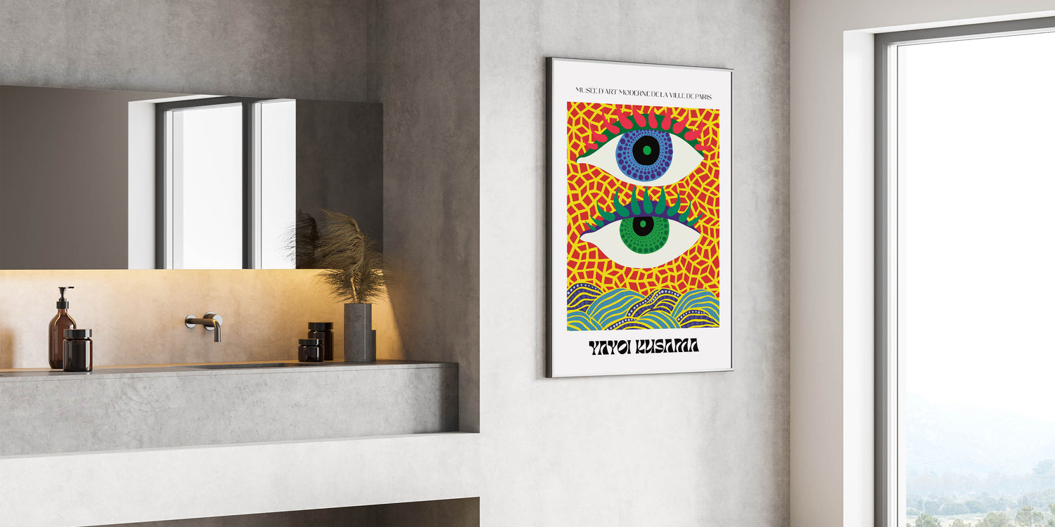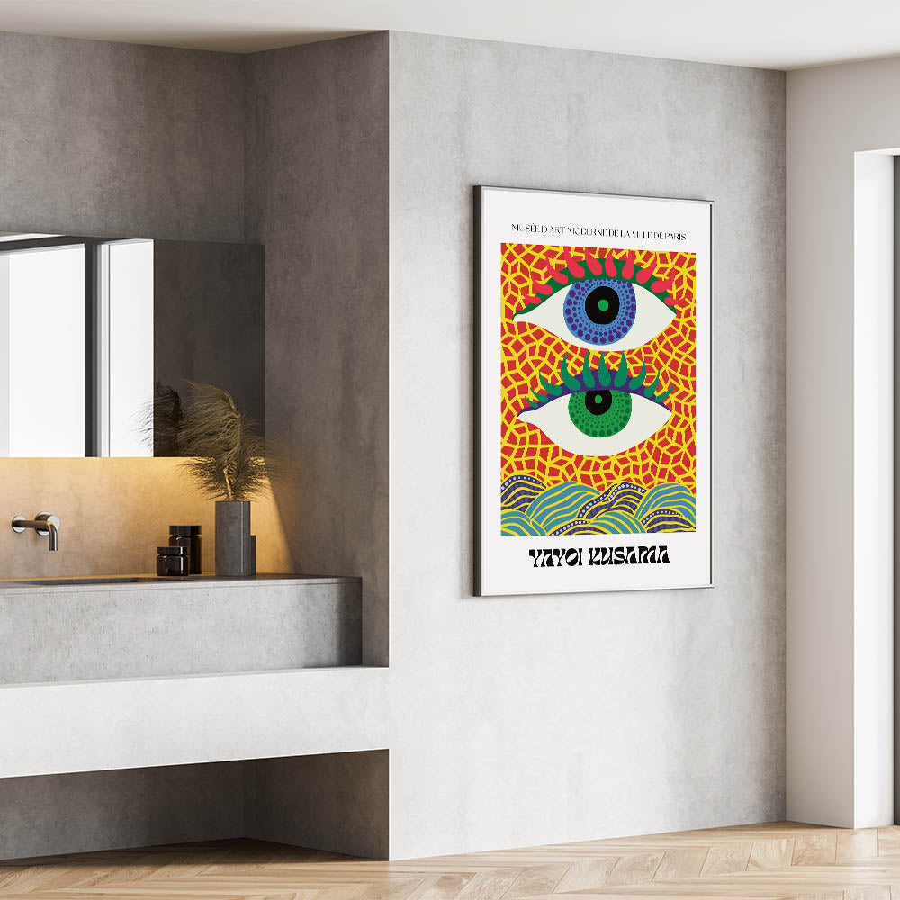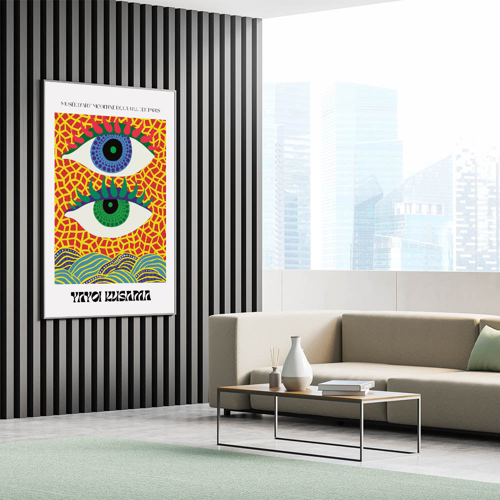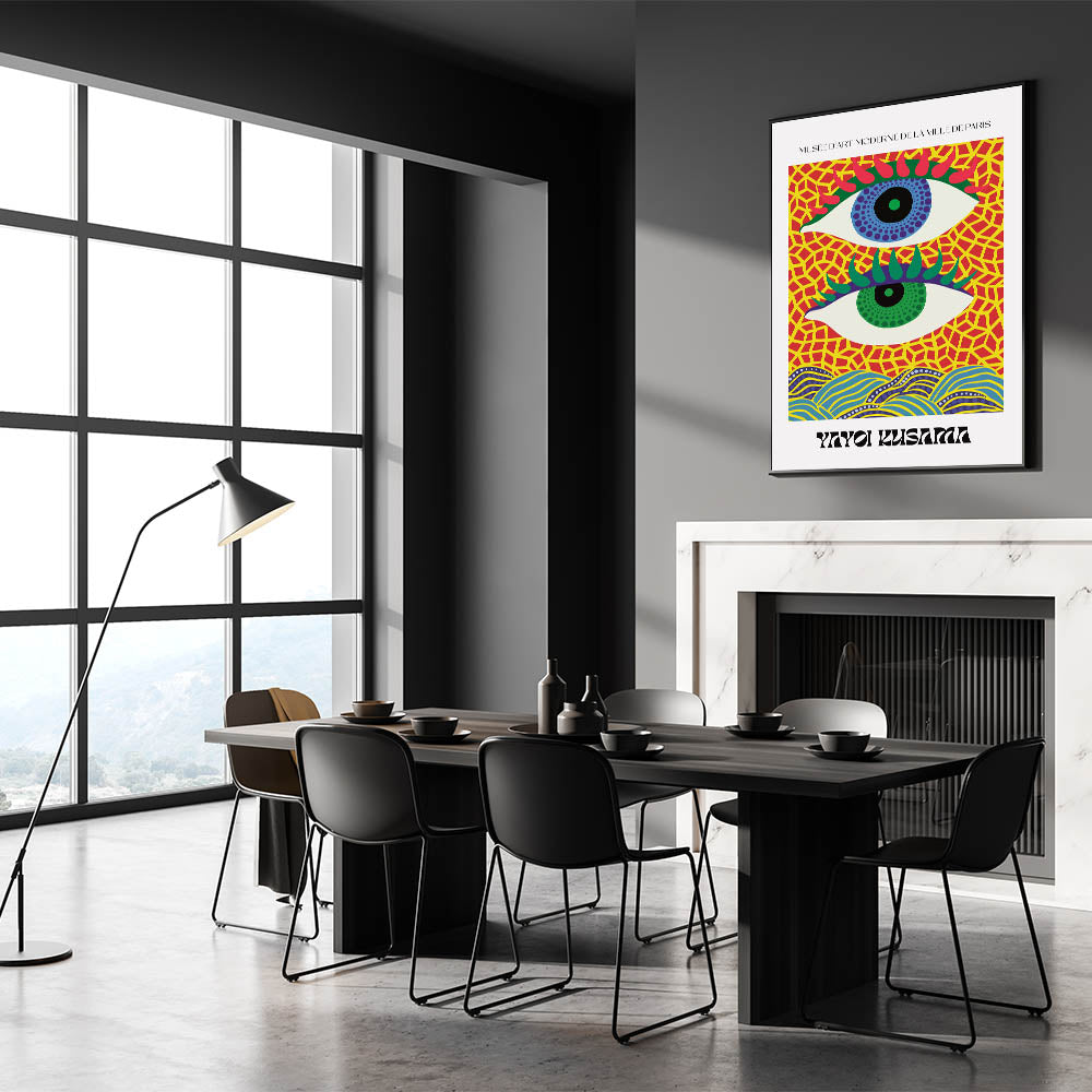 Add a bold and dynamic statement to your space with this contemporary canvas art featuring a vivid abstract design of eyes, inspired by Yayoi Kusama's eclectic style. The artwork combines bright colors and striking patterns, including a geometric yellow and red background, along with wavy blue and green lines. The captivating eyes are adorned with vibrant details, creating a sense of depth and movement. This piece is perfect for modern wall decor, providing a unique and artistic flair that instantly draws attention.