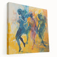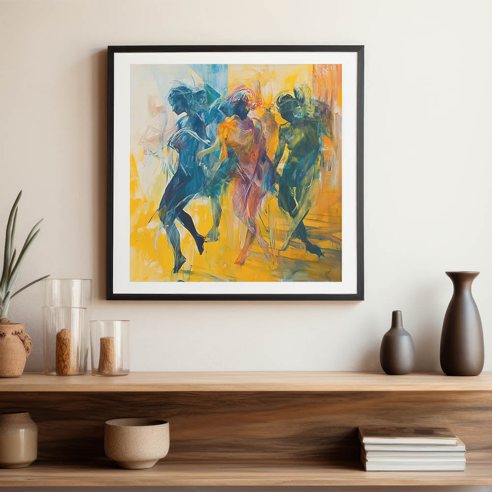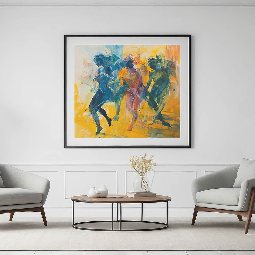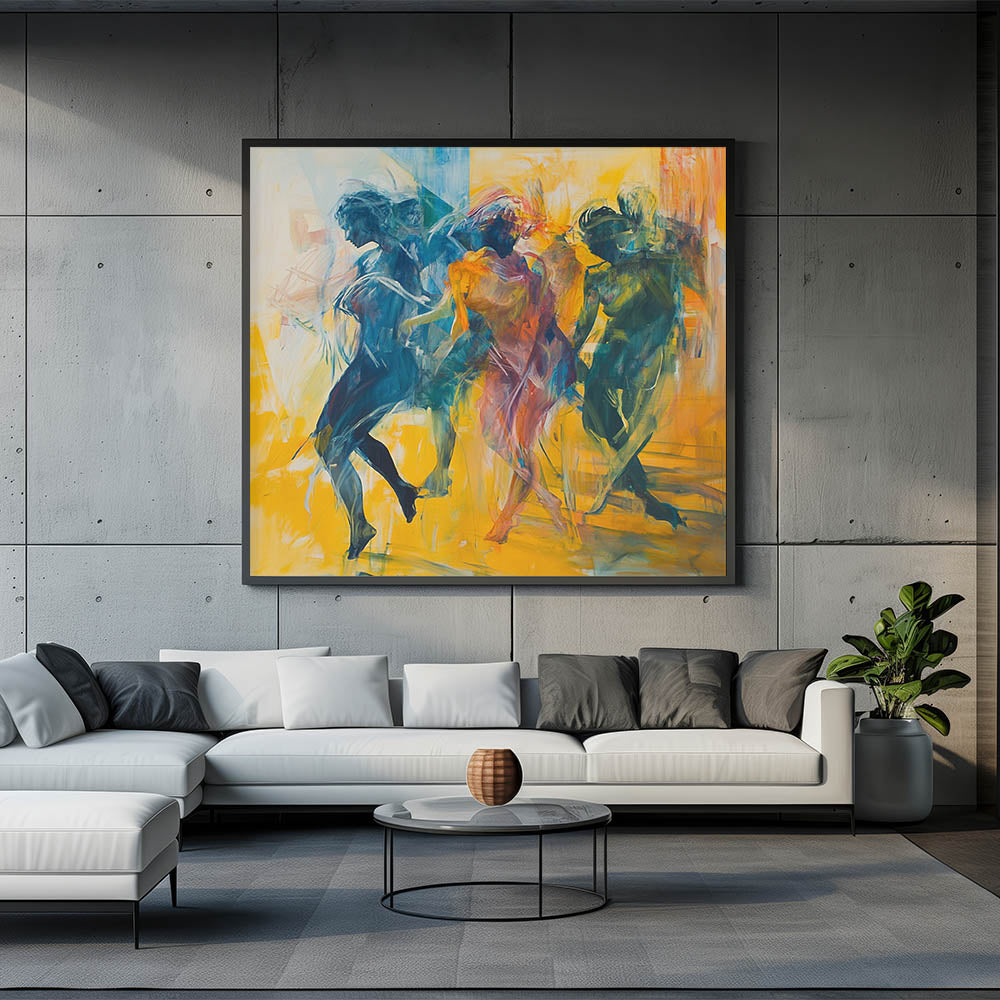 Infuse your space with energy and movement with this Abstract Figurative Art Collection piece. This contemporary human form painting captures the essence of motion, featuring layered brushstrokes that blend seamlessly into a vibrant display of warm yellows, deep blues, and fiery oranges. The fluid figures evoke a sense of passion and rhythm, making it a compelling addition to any modern interior.