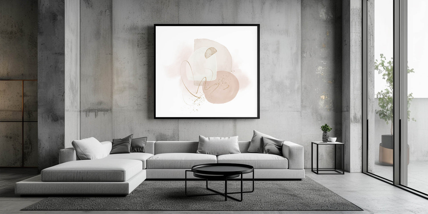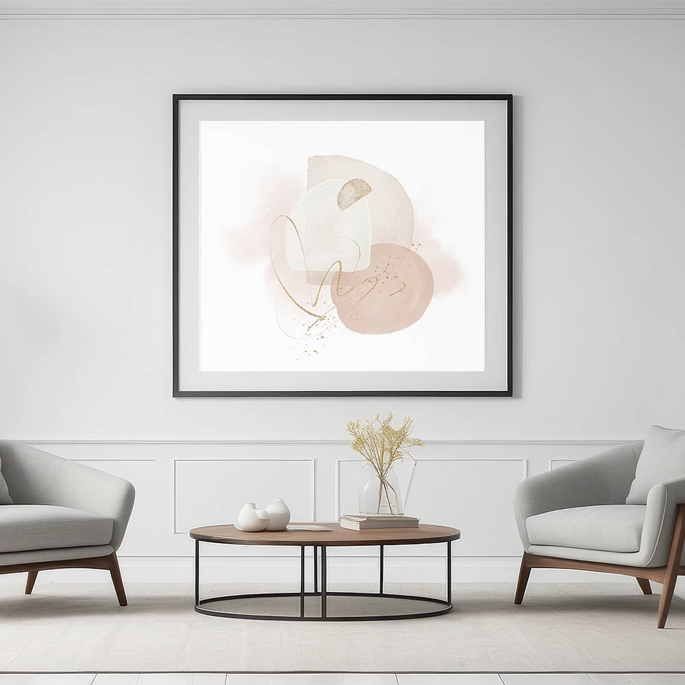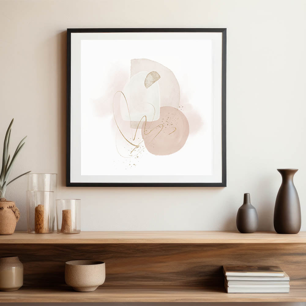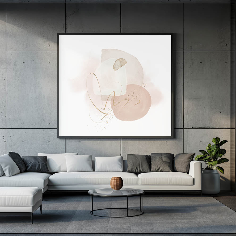 Serene and refined, this contemporary minimalist wall art brings soft elegance to any space. Designed in calming tones of beige, blush pink, off-white, and accented with shimmering gold, the piece features layered shapes and delicate linework. It’s a gentle yet artistic representation of modern geometric wall decor, ideal for light, airy interiors.