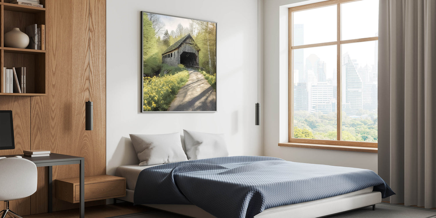 This Scenic Covered Bridge Decor piece is ideal for anyone who loves Vintage Bridge Art and Architecture Wall Art. The serene landscape and historic architecture make this Classic Bridge Decor a timeless focal point that adds warmth and depth to your space.
