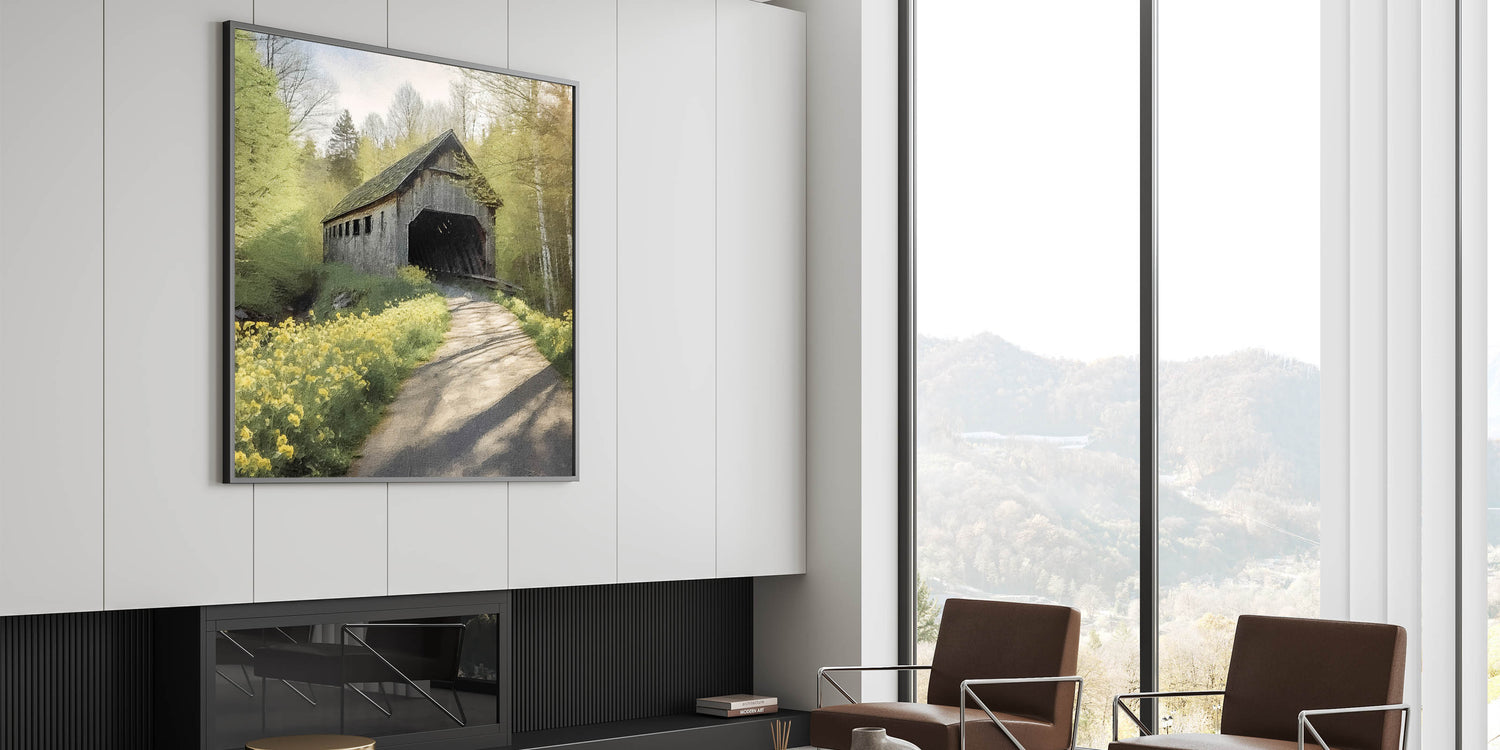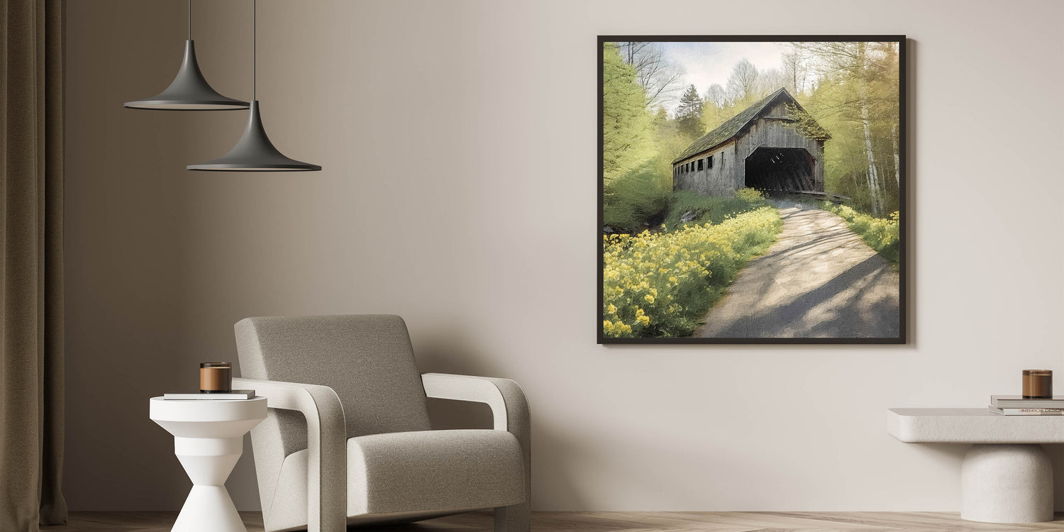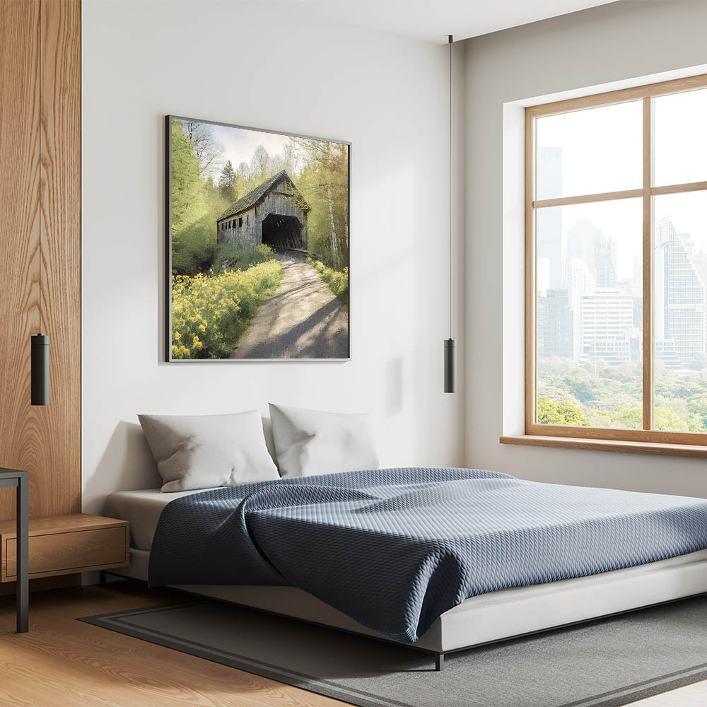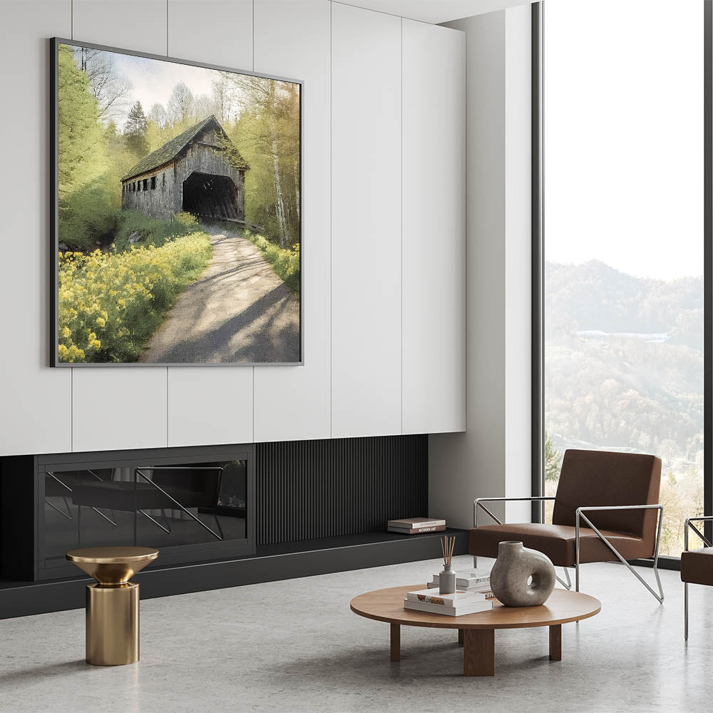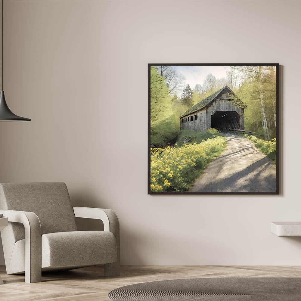 Bring a piece of history into your home with our Covered Bridge Wall Art, featuring a charming vintage bridge surrounded by vibrant greenery and a lush, flower-lined pathway. This artwork captures the timeless beauty of rustic architecture, making it a perfect addition to any room that embraces nature and classic decor elements.