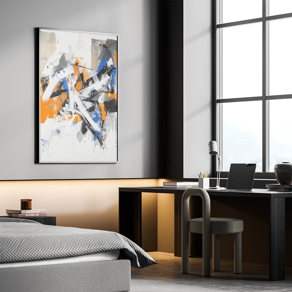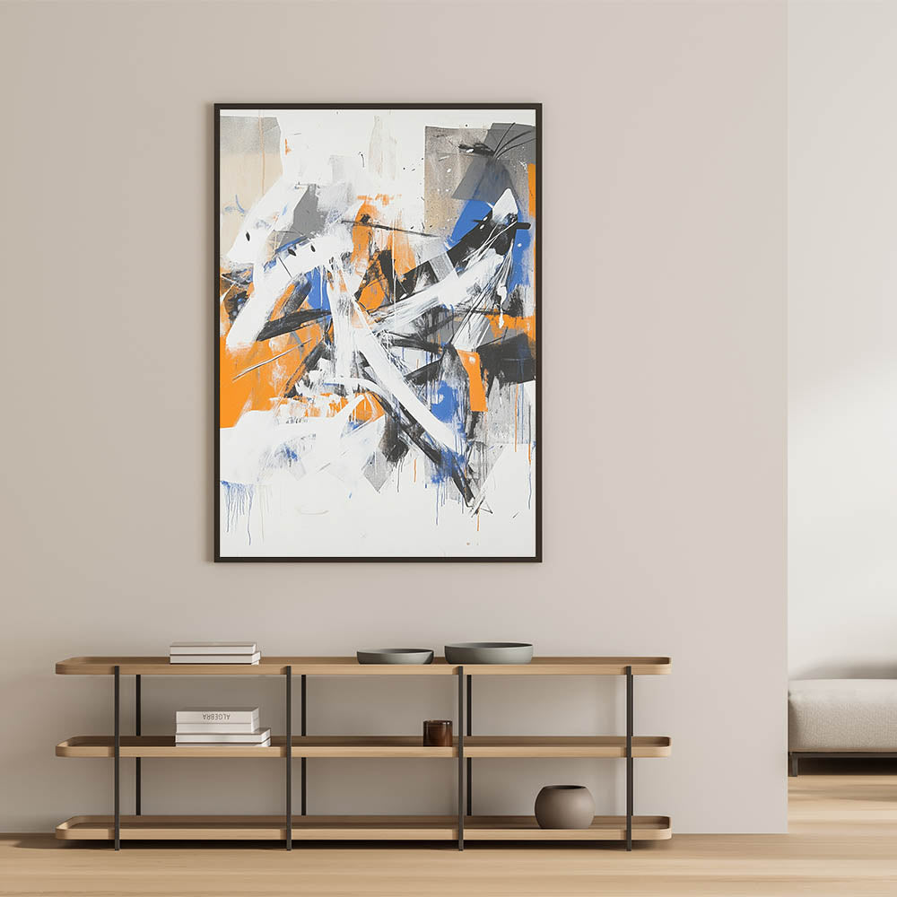 Add bold artistic energy to your space with this Abstract Expressionist Art for Home Decor. This Original Abstract Expressionist Painting features a striking mix of black, white, orange, blue, and gray, creating a sense of movement and raw expression. The dynamic brushstrokes and urban aesthetic of this Expressionist Canvas Wall Art make it a statement piece in any modern interior.