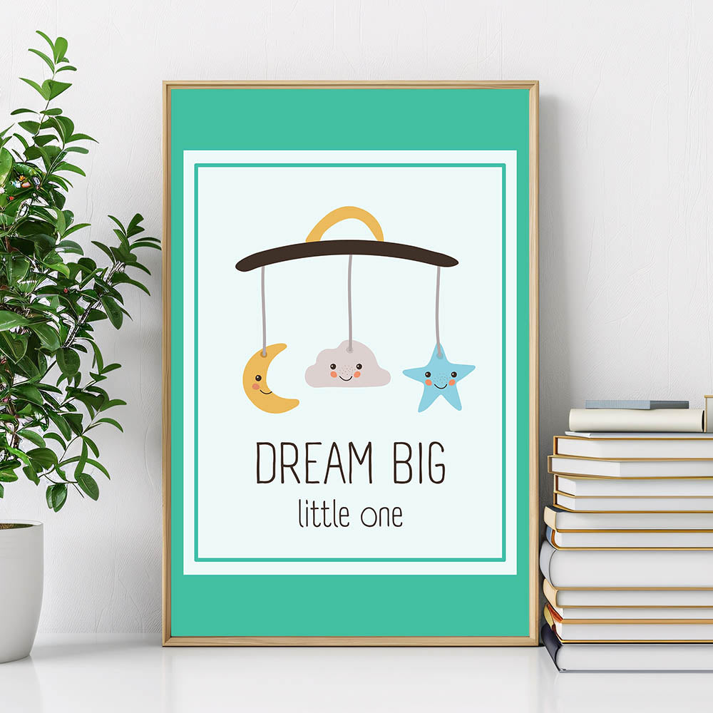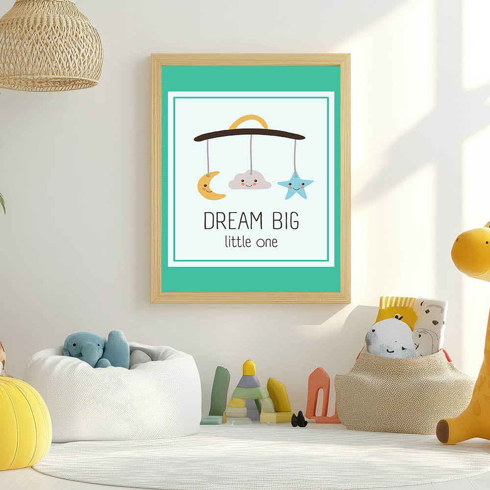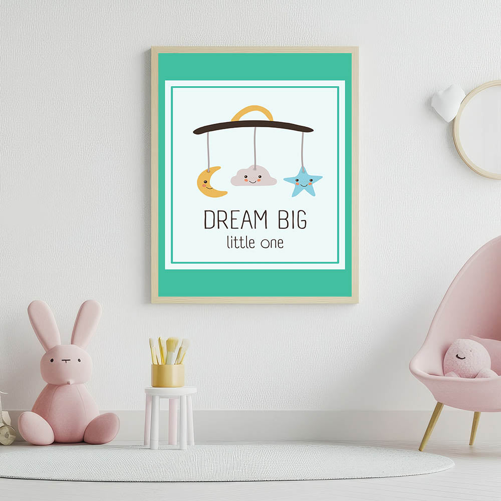 Create a soothing and inspiring space with this Educational Nursery Wall Decor, featuring an adorable Dream Big, Little One design. This Children’s Learning Art Print showcases a soft pastel mobile with a smiling moon, cloud, and star, making it a perfect Kids’ Room Learning Art piece for nurseries, playrooms, and early learning spaces.