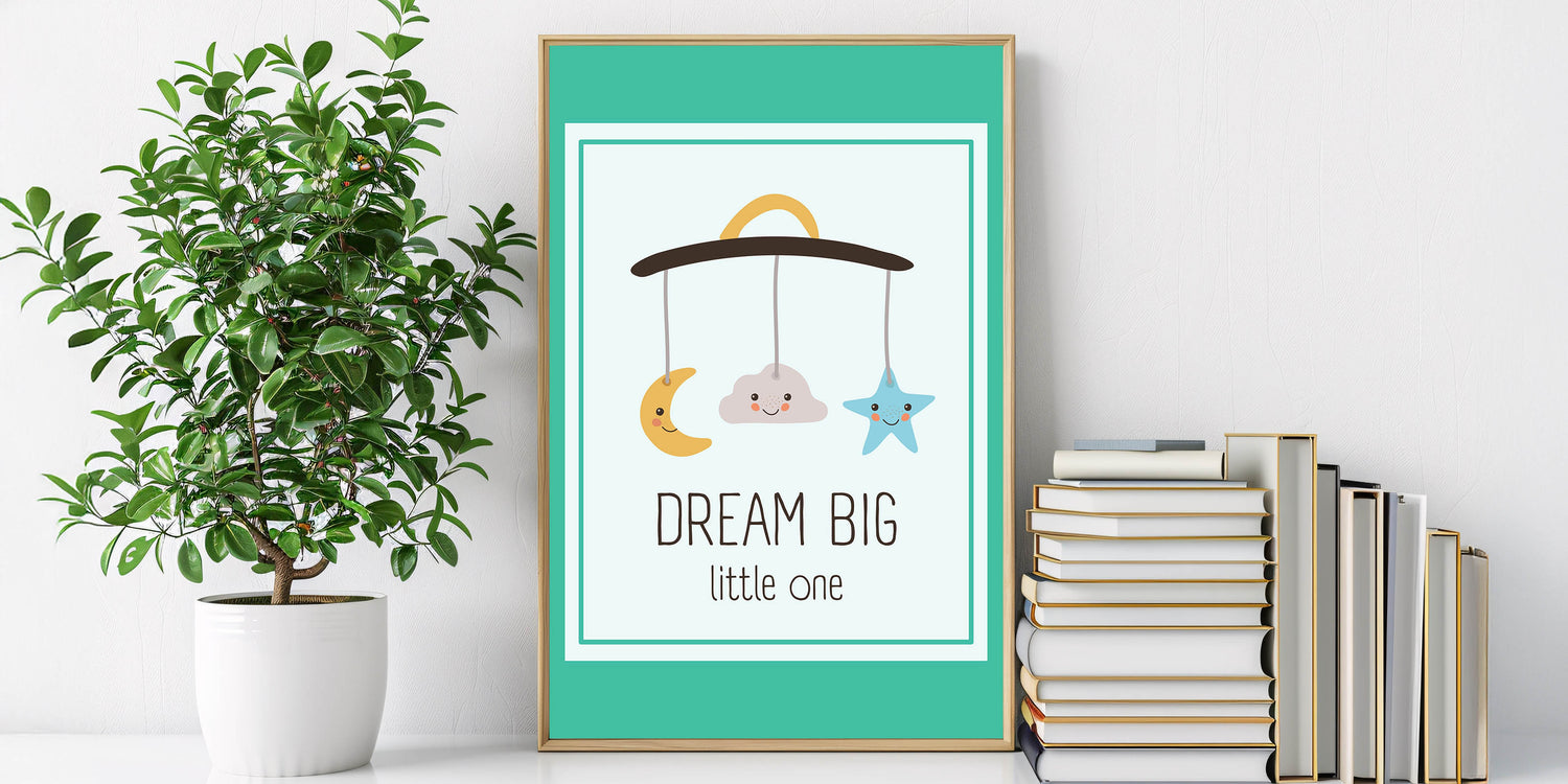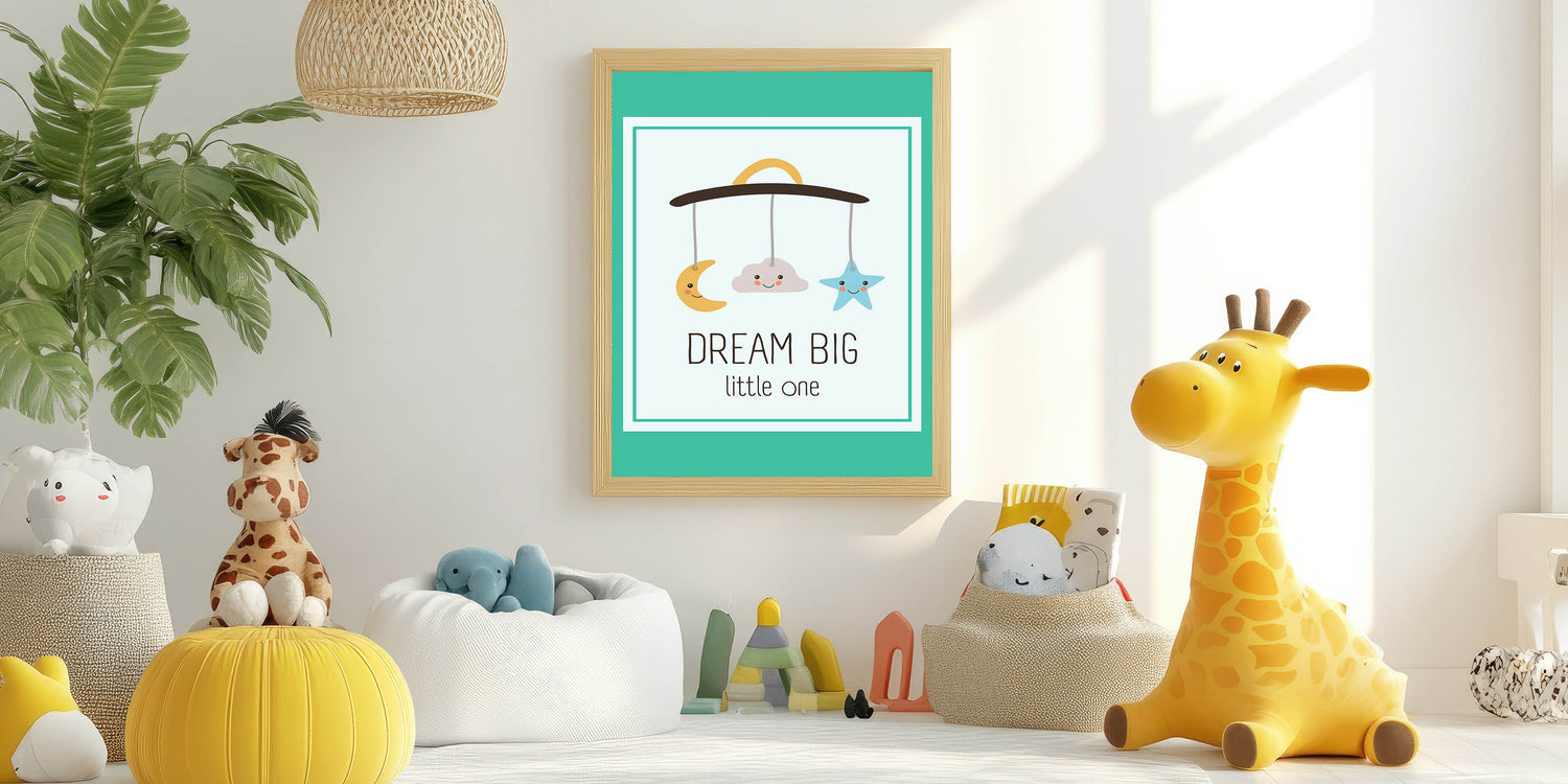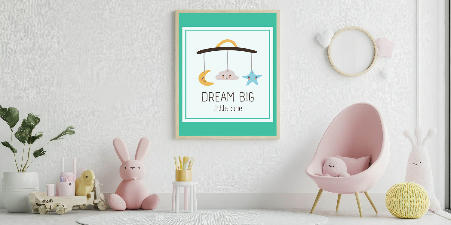 Create a soothing and inspiring space with this Educational Nursery Wall Decor, featuring an adorable Dream Big, Little One design. This Children’s Learning Art Print showcases a soft pastel mobile with a smiling moon, cloud, and star, making it a perfect Kids’ Room Learning Art piece for nurseries, playrooms, and early learning spaces.