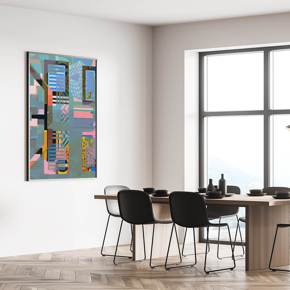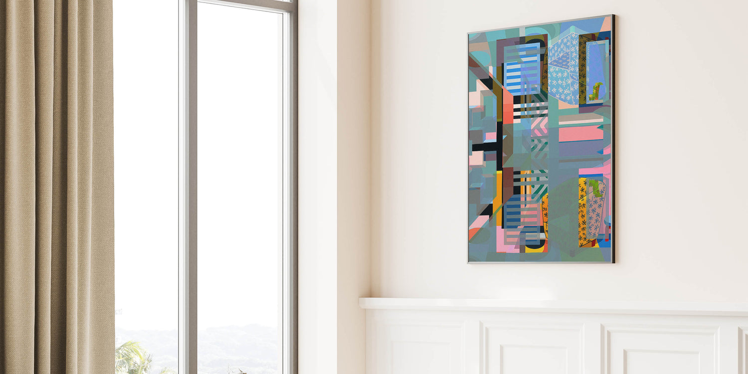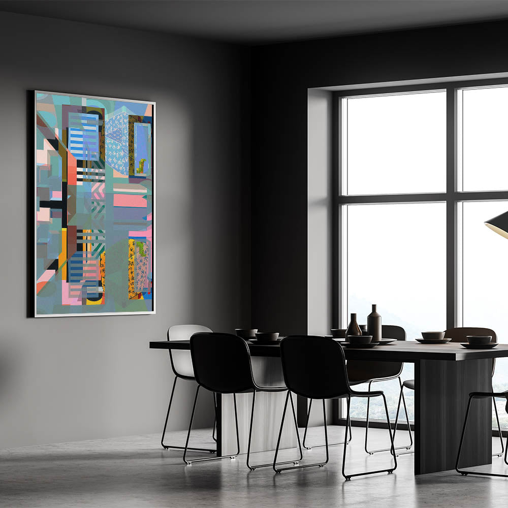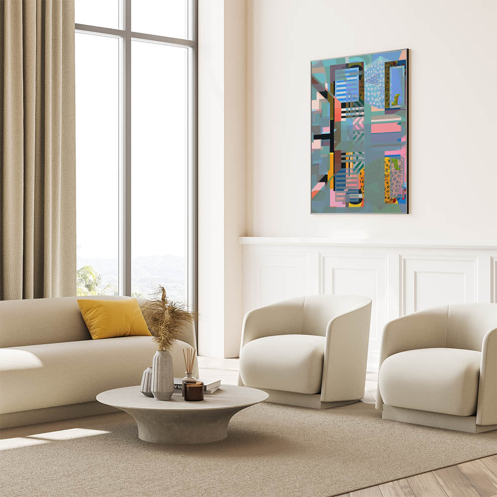 This captivating electric wall art piece features a complex abstract geometric design that blends various shapes, colors, and patterns to create a visually stunning composition. The layered elements in blues, greens, pinks, and yellows evoke a sense of depth and movement, making this electric-themed art perfect for contemporary interiors looking to add a bold and dynamic touch. The intricate interplay of colors and forms draws the viewer in, making this artwork ideal for living rooms, offices, or creative spaces.