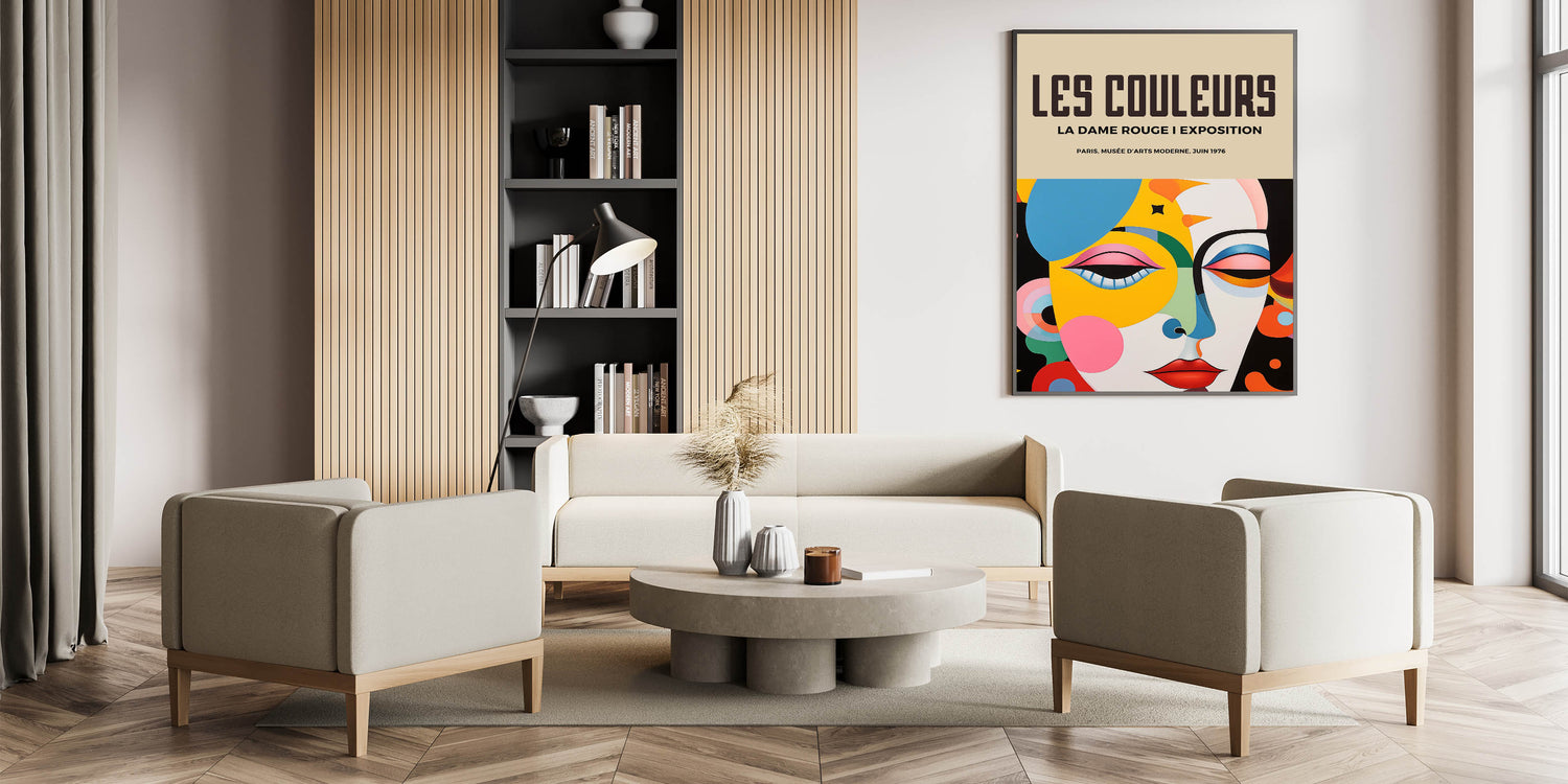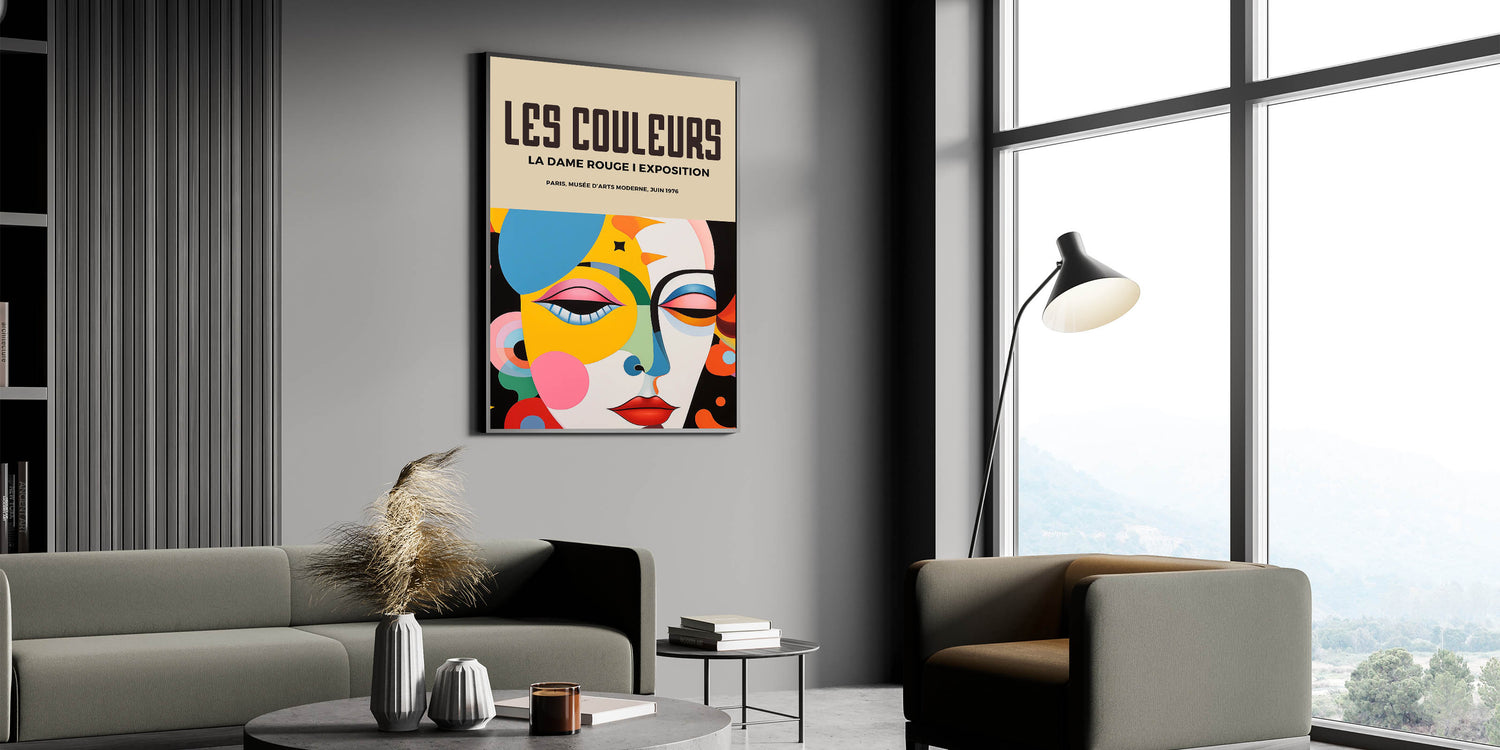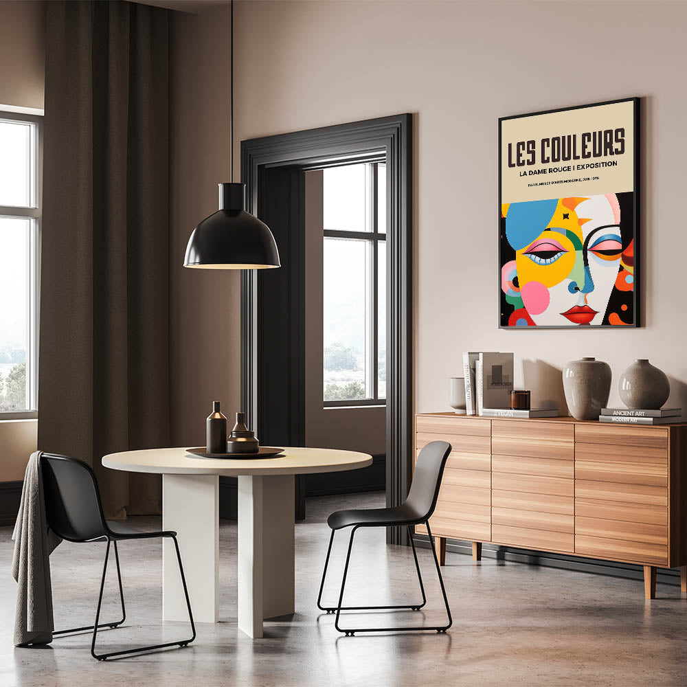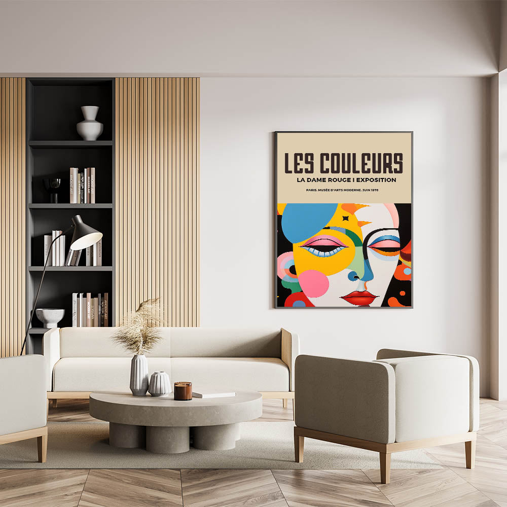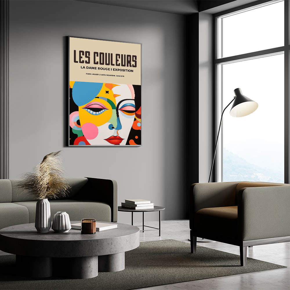 This electric wall art features a vibrant poster-style design for "Les Couleurs – La Dame Rouge I Exposition," capturing the essence of a 1976 modern art exhibition in Paris. The bold abstract face is composed of striking geometric shapes and vivid colors, creating a captivating visual that embodies the electric energy of modern art. The artwork combines cultural and artistic flair, making it perfect for eclectic interiors.