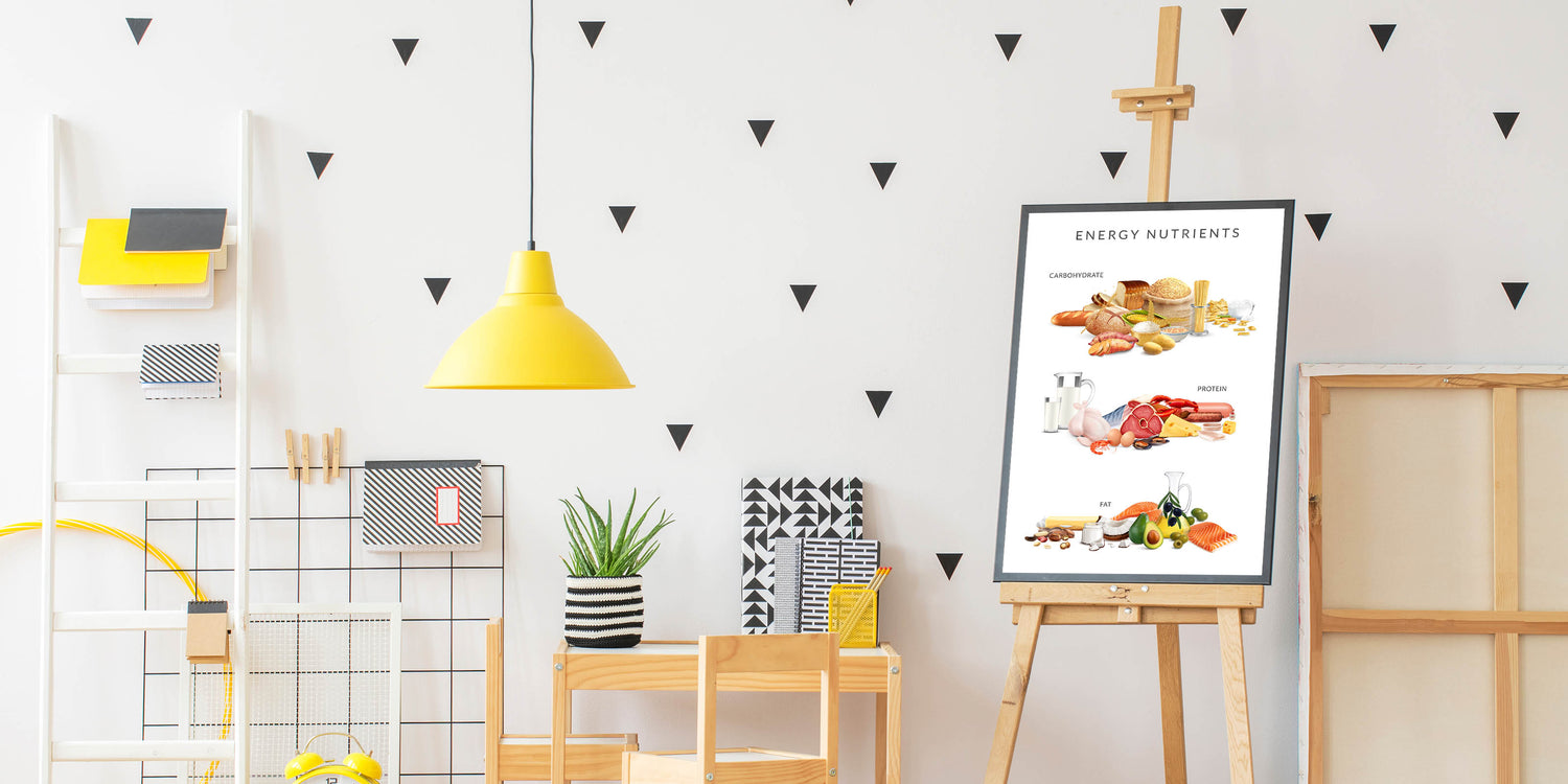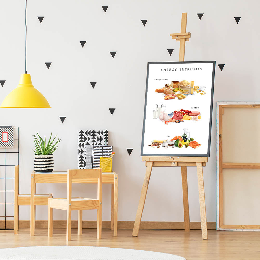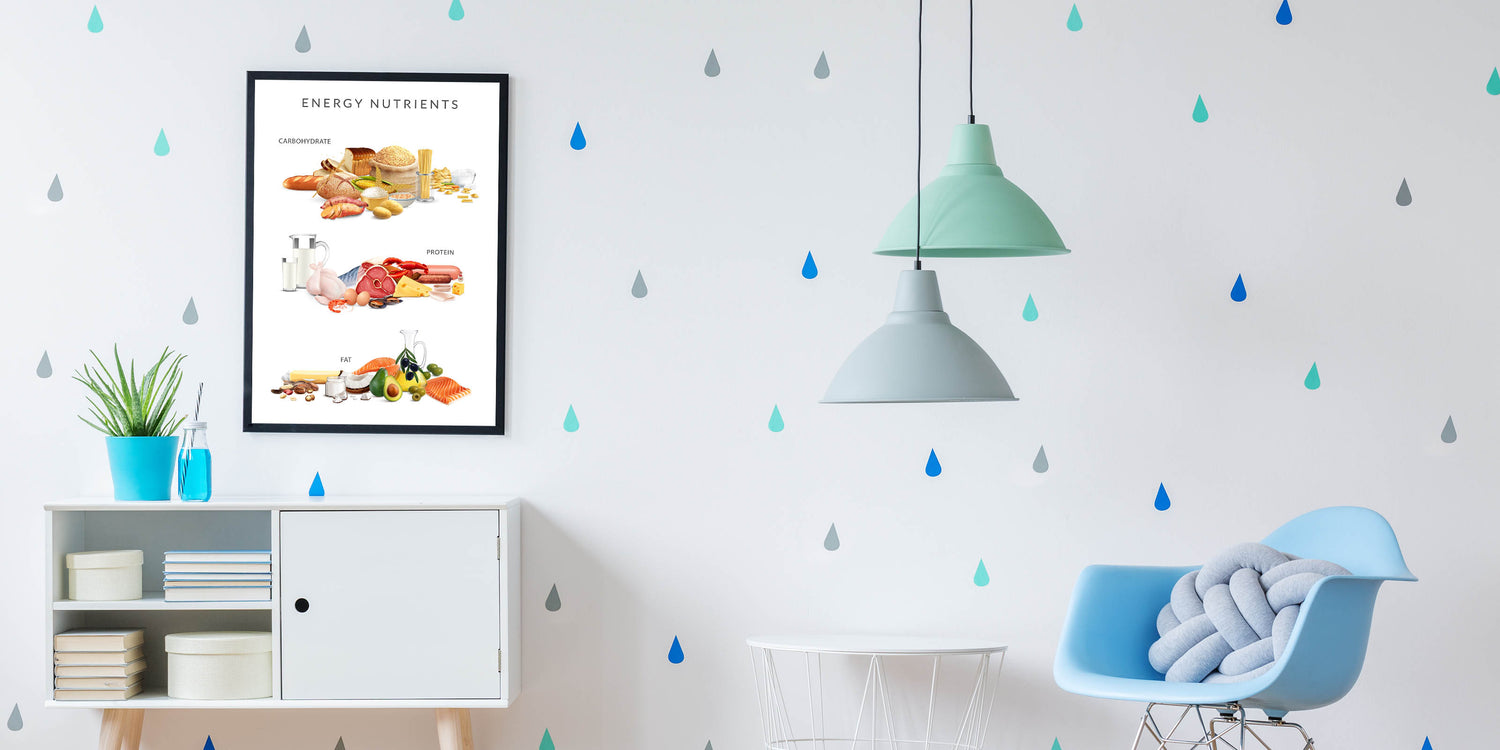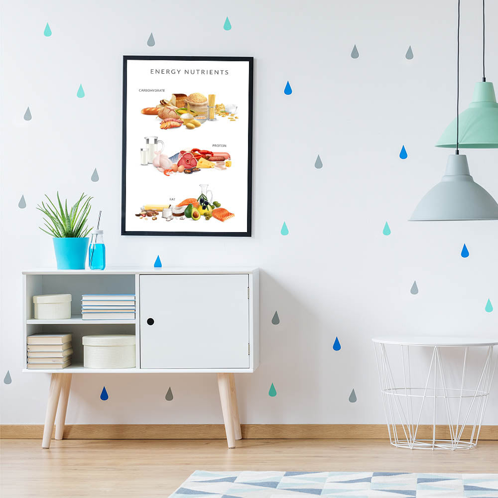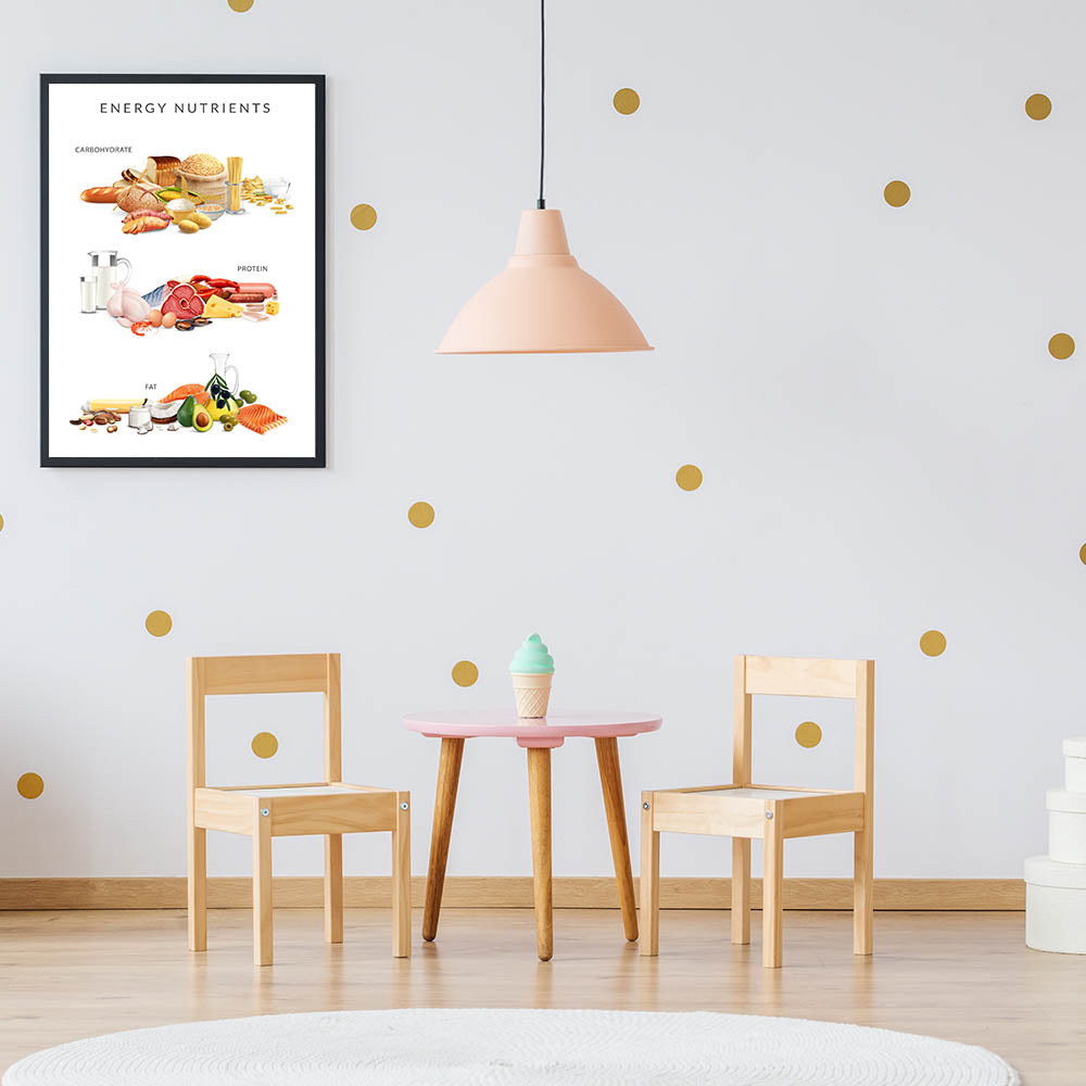 Help kids understand the importance of nutrition with this Energy Nutrients Educational Wall Art. Featuring visually appealing illustrations of carbohydrates, proteins, and fats, this children’s learning art print makes learning about food groups fun and engaging. It is perfect for kids' rooms, classrooms, and play areas, providing a colorful and informative reference for early education.
