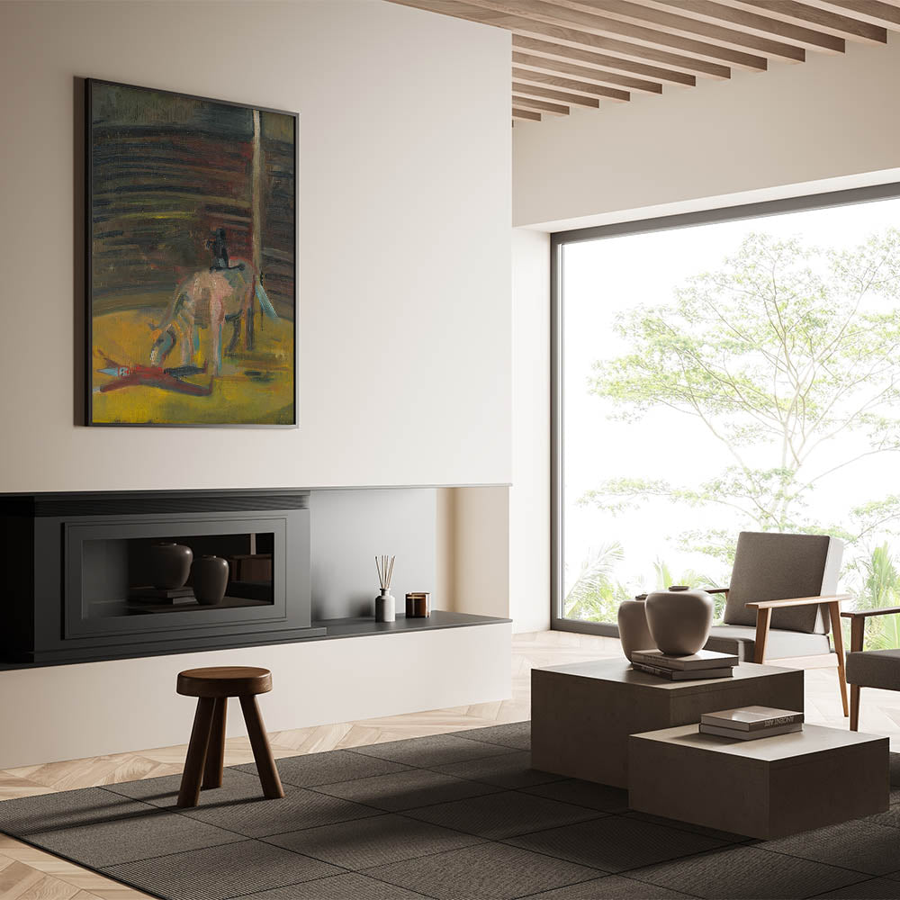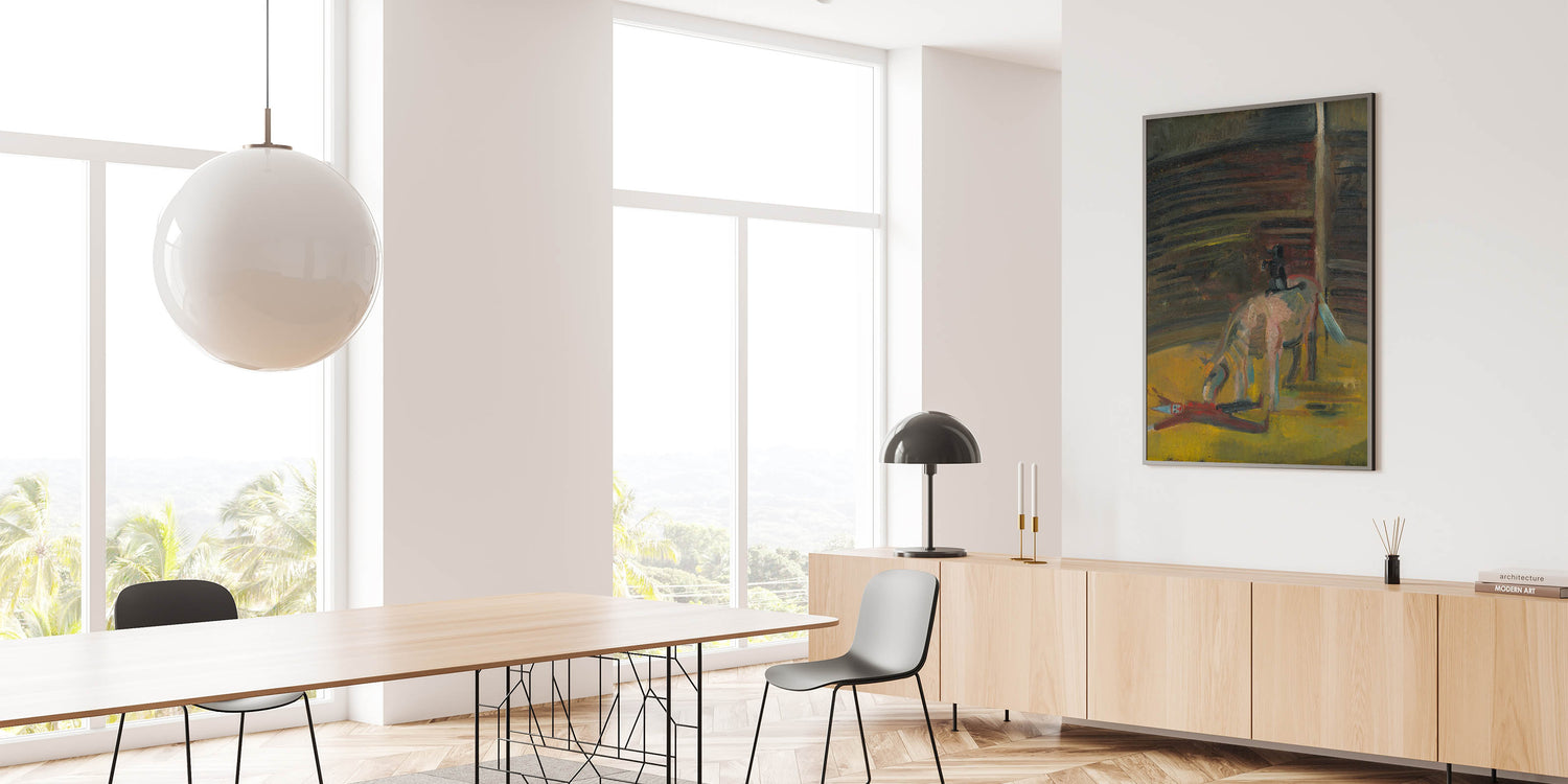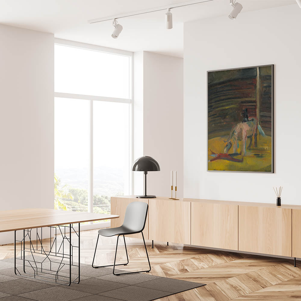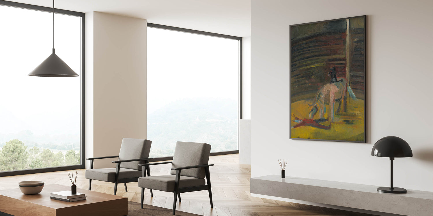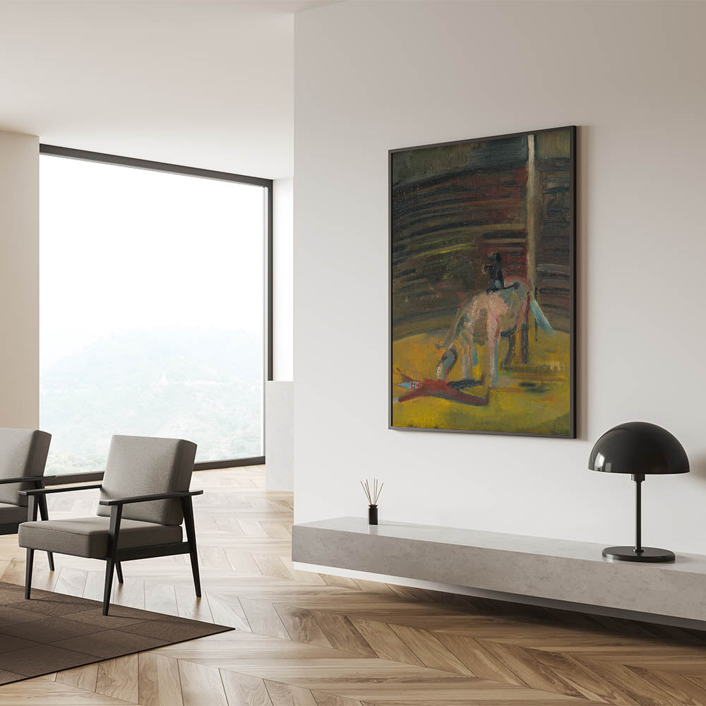 Step into the evocative world of Expressionism Wall Art with this haunting yet mesmerizing depiction of a circus motif. This Abstract Expressionism painting captures the intense atmosphere of the circus ring, featuring a horse and a prone performer rendered in bold brushstrokes and deep, earthy tones. The dramatic use of light and shadow conveys a sense of mystery and raw emotion, making it a compelling addition to any art collection.