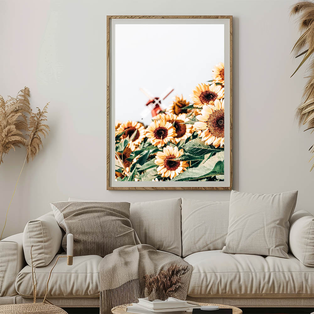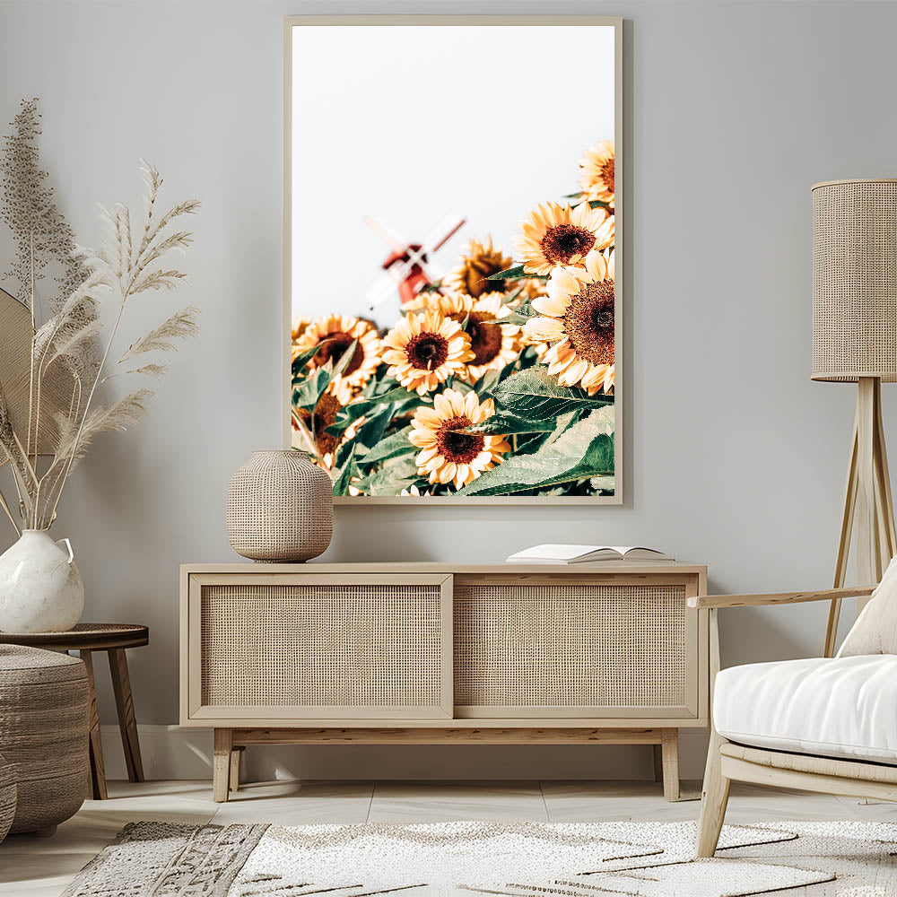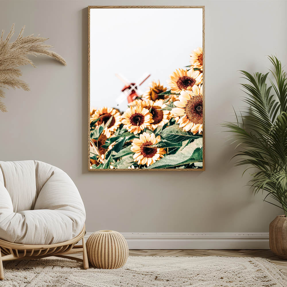 - Depicts a beautiful sunflower field with a rustic windmill in the background, ideal for adding rustic charm to any space