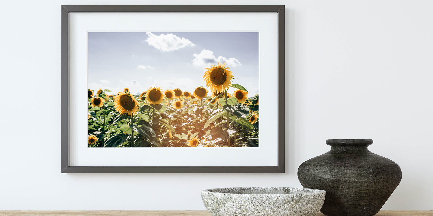 - High-resolution print capturing the bright colors and stunning textures of sunflowers in bloom