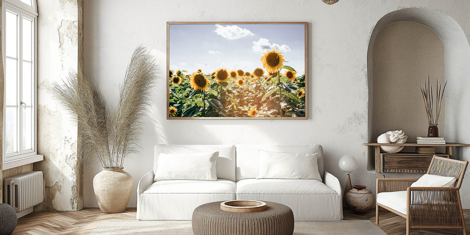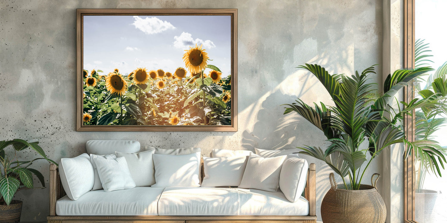 Add a touch of sunshine to your home with this beautiful farmhouse wall art featuring a field of blooming sunflowers under a bright summer sky. The vivid yellow flowers and lush green leaves stand out against the soft blue sky, creating a vibrant and cheerful scene perfect for any space. This artwork is ideal for those who love the warmth and simplicity of country living, bringing the beauty of the outdoors into your home.