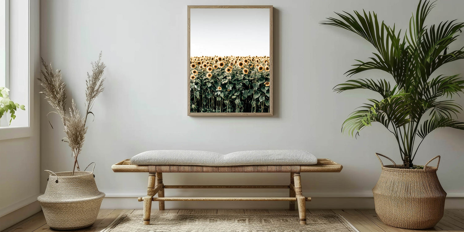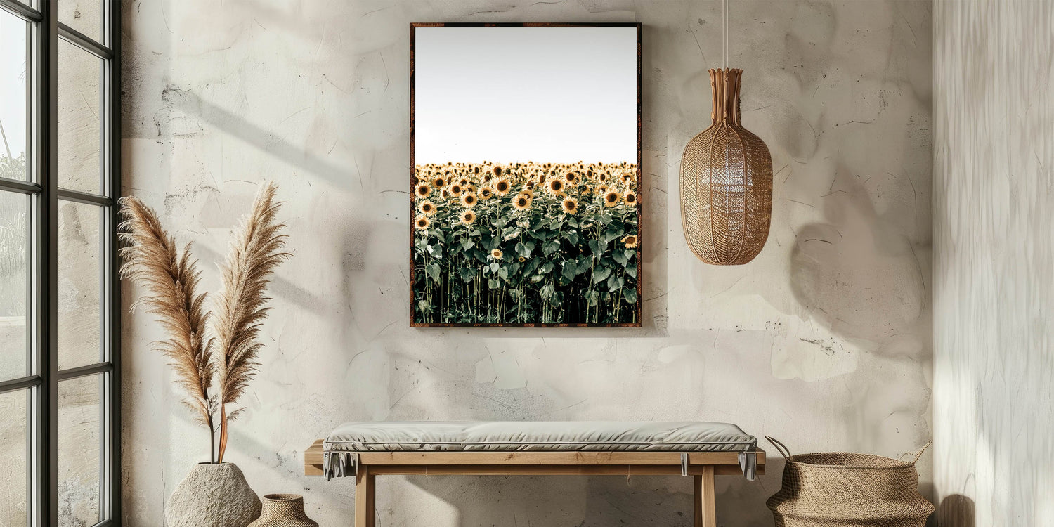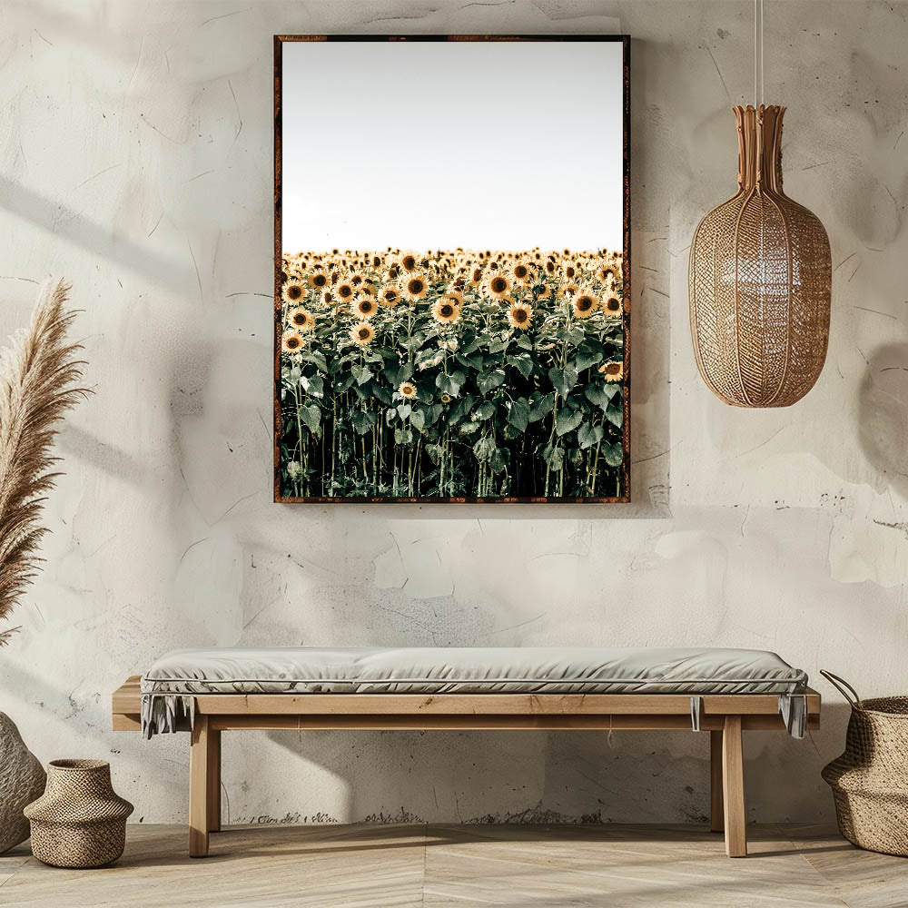 Available in a variety of formats, including stretched canvas, framed prints, and acrylic glass, this piece of art will easily complement any interior. The natural, sunny tones and bold contrast of the sunflowers capture the essence of vintage farmhouse style while adding a touch of modern elegance to your space. Whether displayed in the living room, bedroom, or entryway, this artwork is sure to bring a cheerful and inviting vibe to your home.