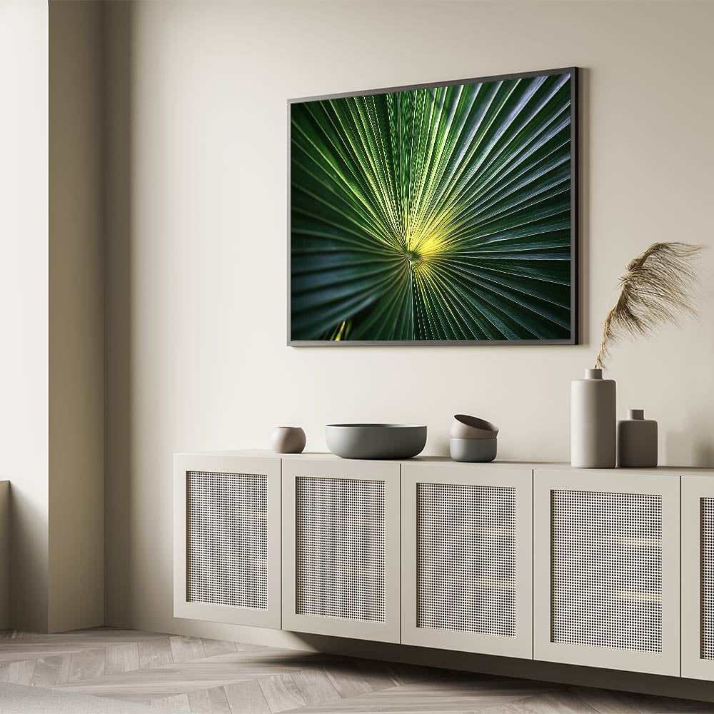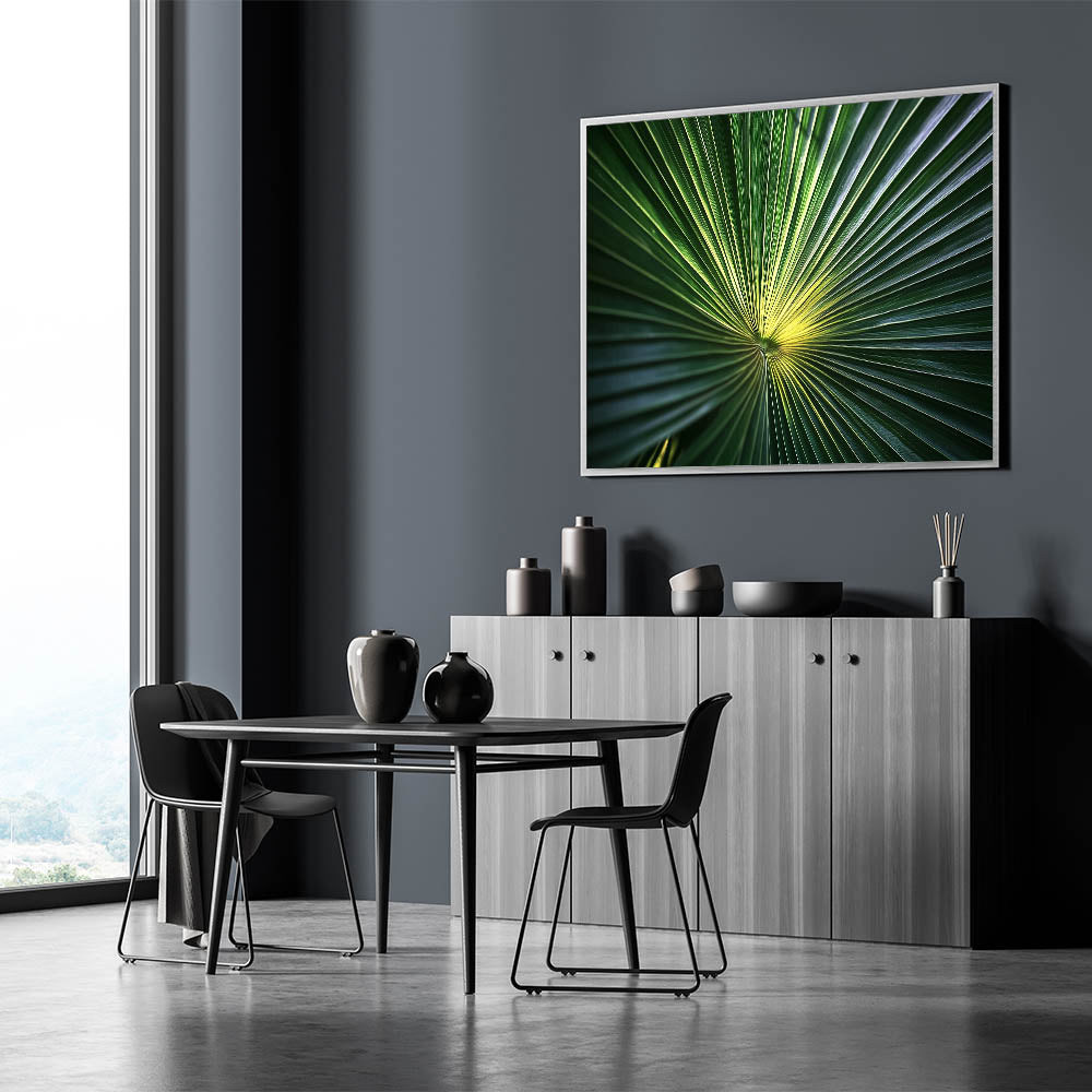 Enhance your home with this vibrant palm leaf wall art, showcasing the intricate beauty of nature. This close-up highlights the radiating veins of a palm leaf, brought to life with shades of deep green and sunlight accents. Perfect for creating a lively yet calming atmosphere, this artwork adds a modern botanical touch to any decor.