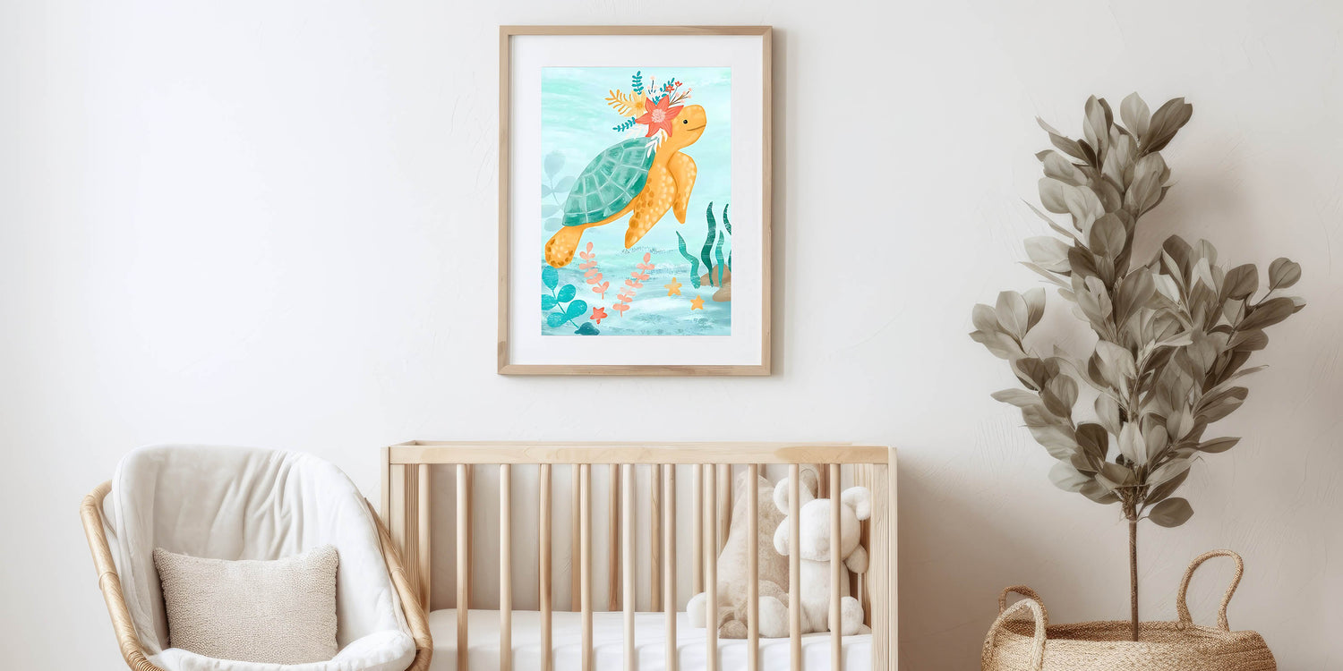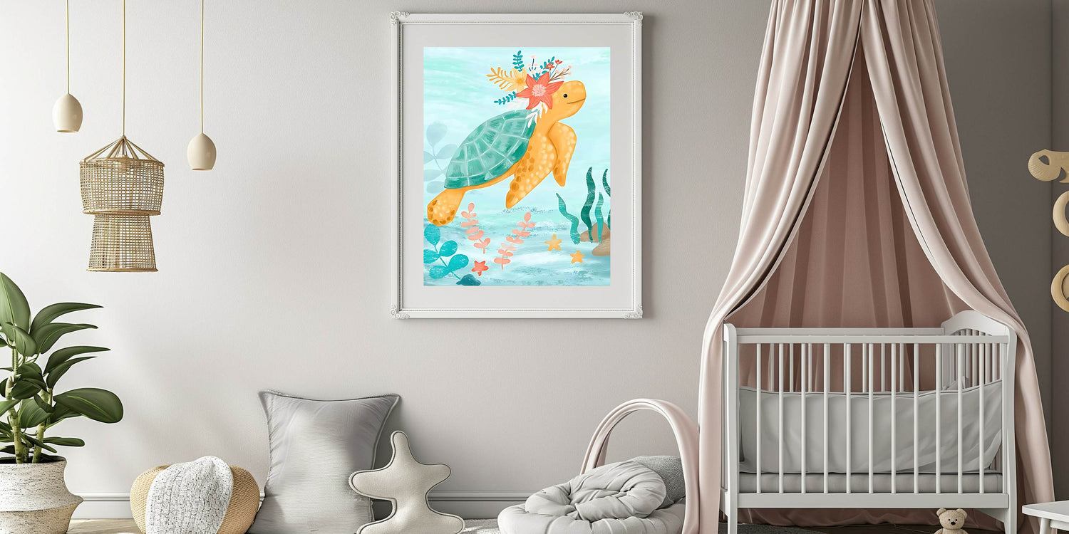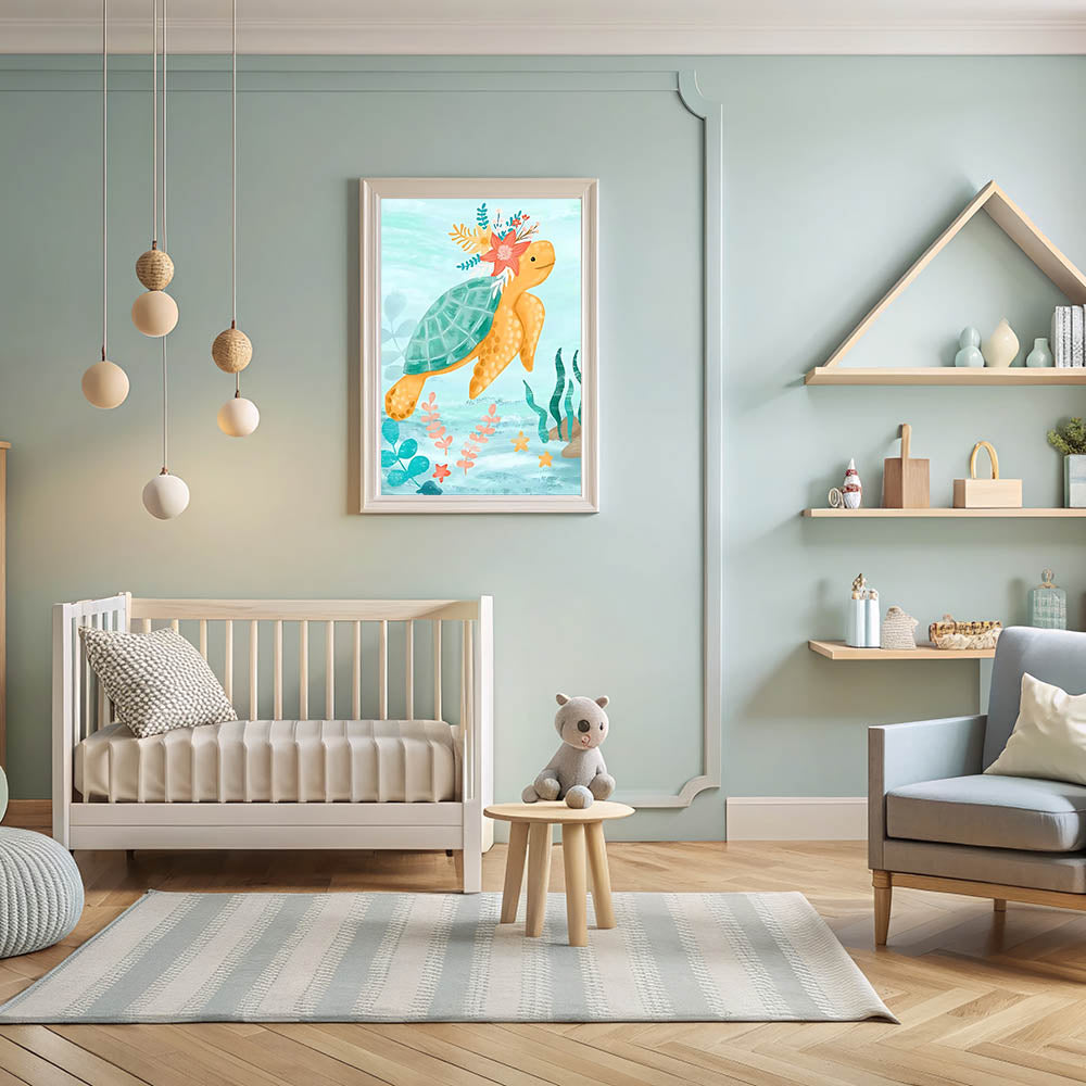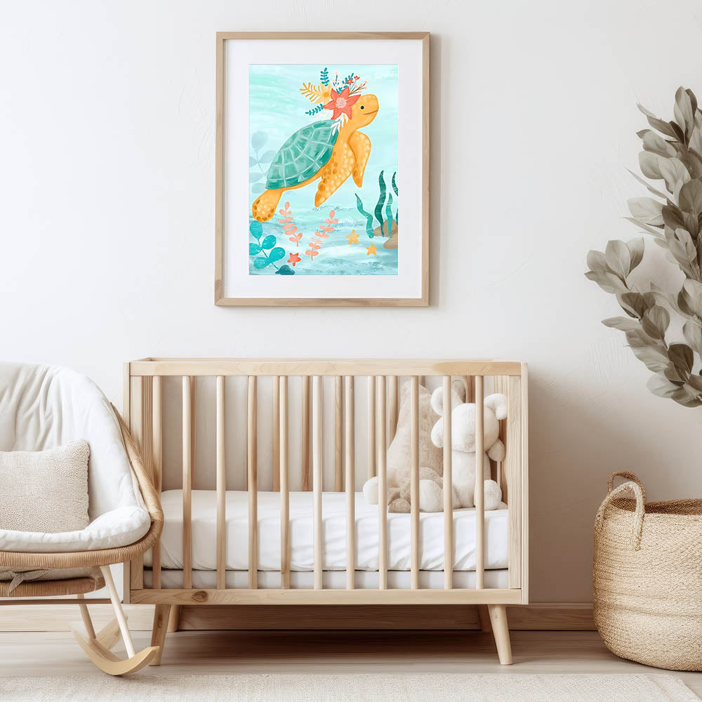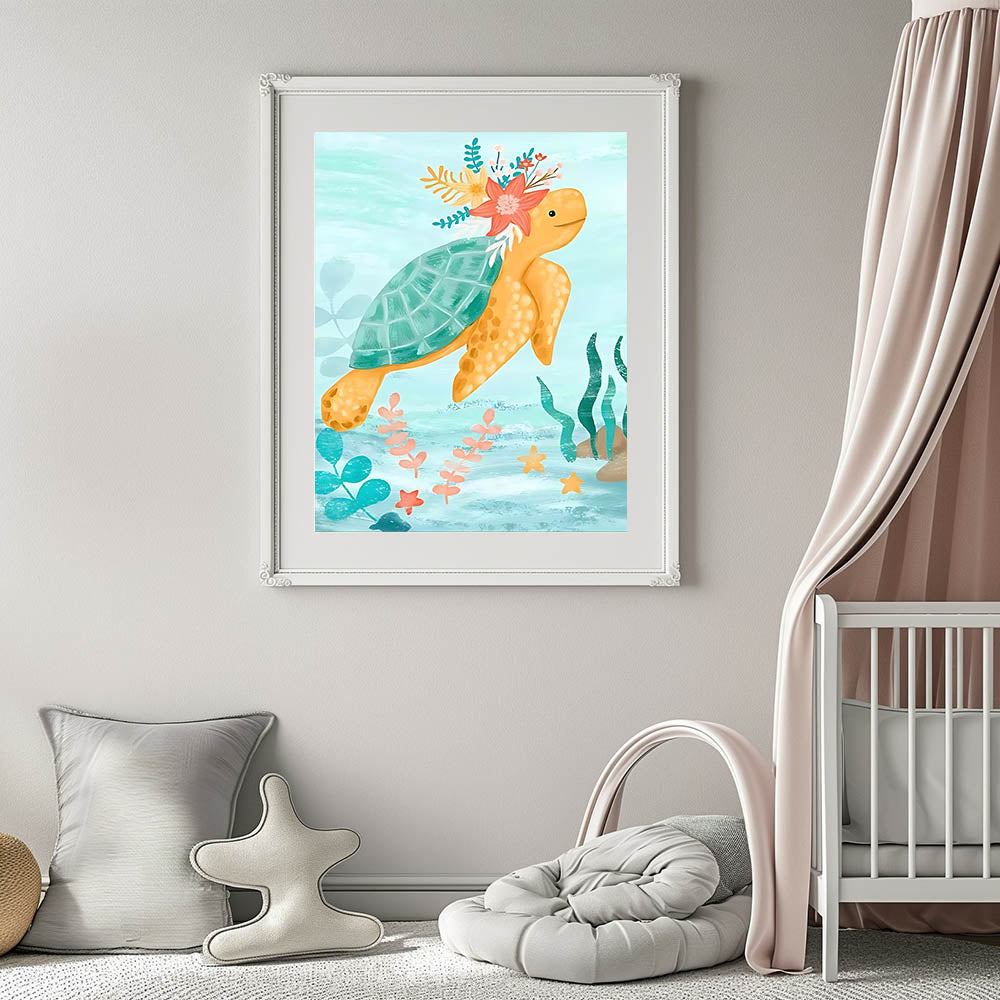 Create a dreamy ocean-inspired nursery with this floral sea turtle nursery wall art. Featuring a beautifully illustrated turtle with a floral crown, surrounded by underwater plants, this baby room decor brings a sense of tranquility and whimsy to nurseries, playrooms, and kids' bedrooms. The soft turquoise, yellow, and coral tones make it a perfect fit for a coastal nursery theme.