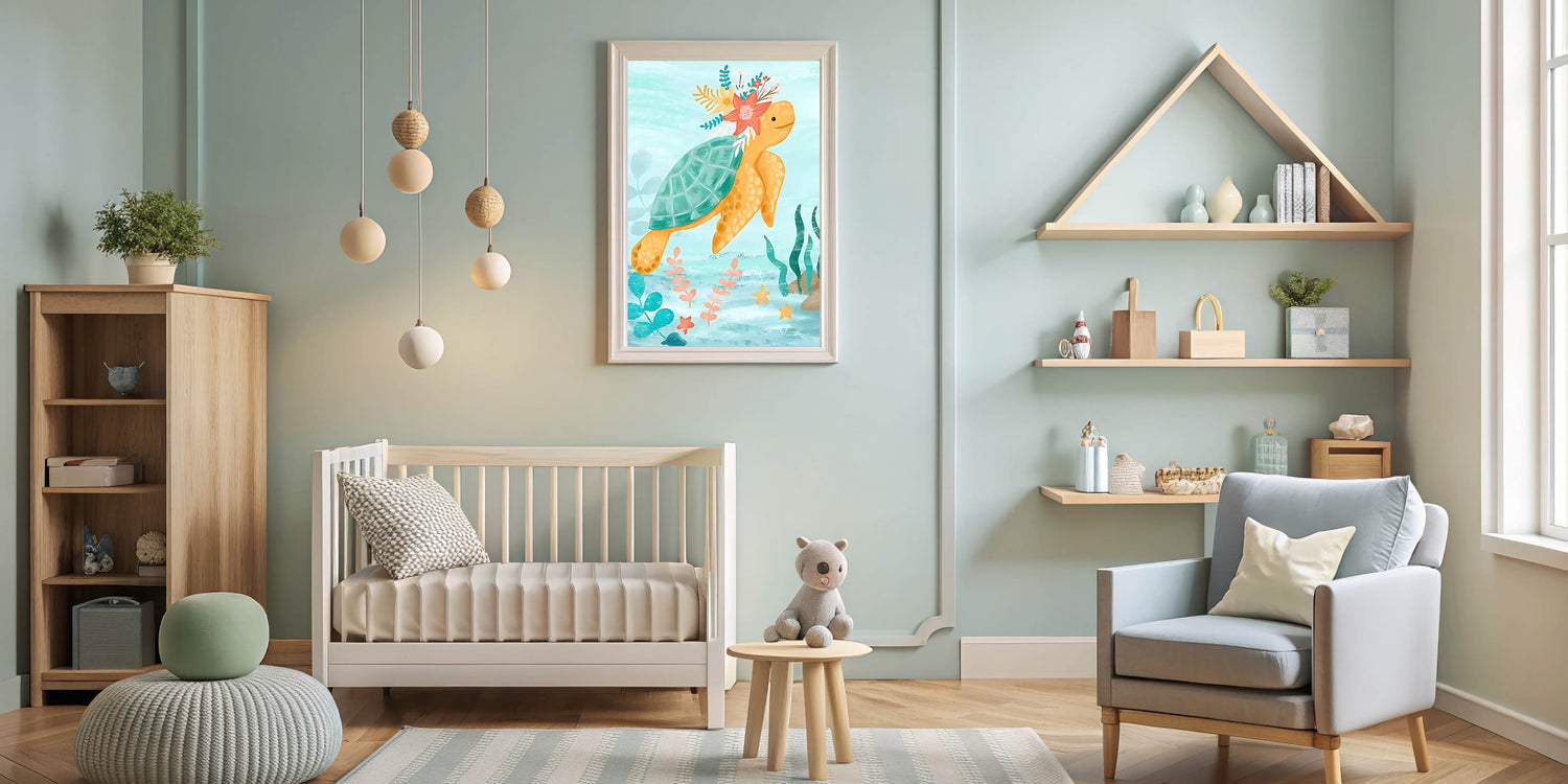 - Charming Ocean-Themed Design – A sweet and artistic turtle illustration that enhances any children’s wall art collection.