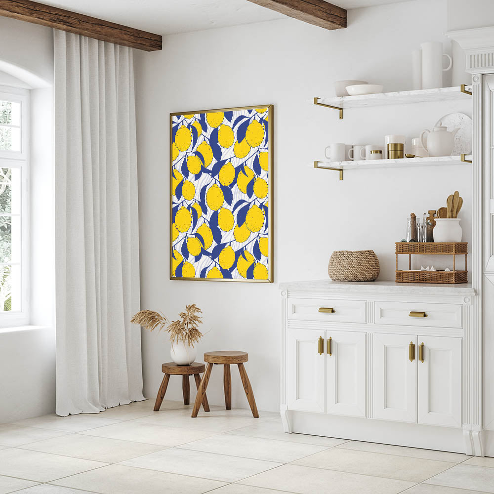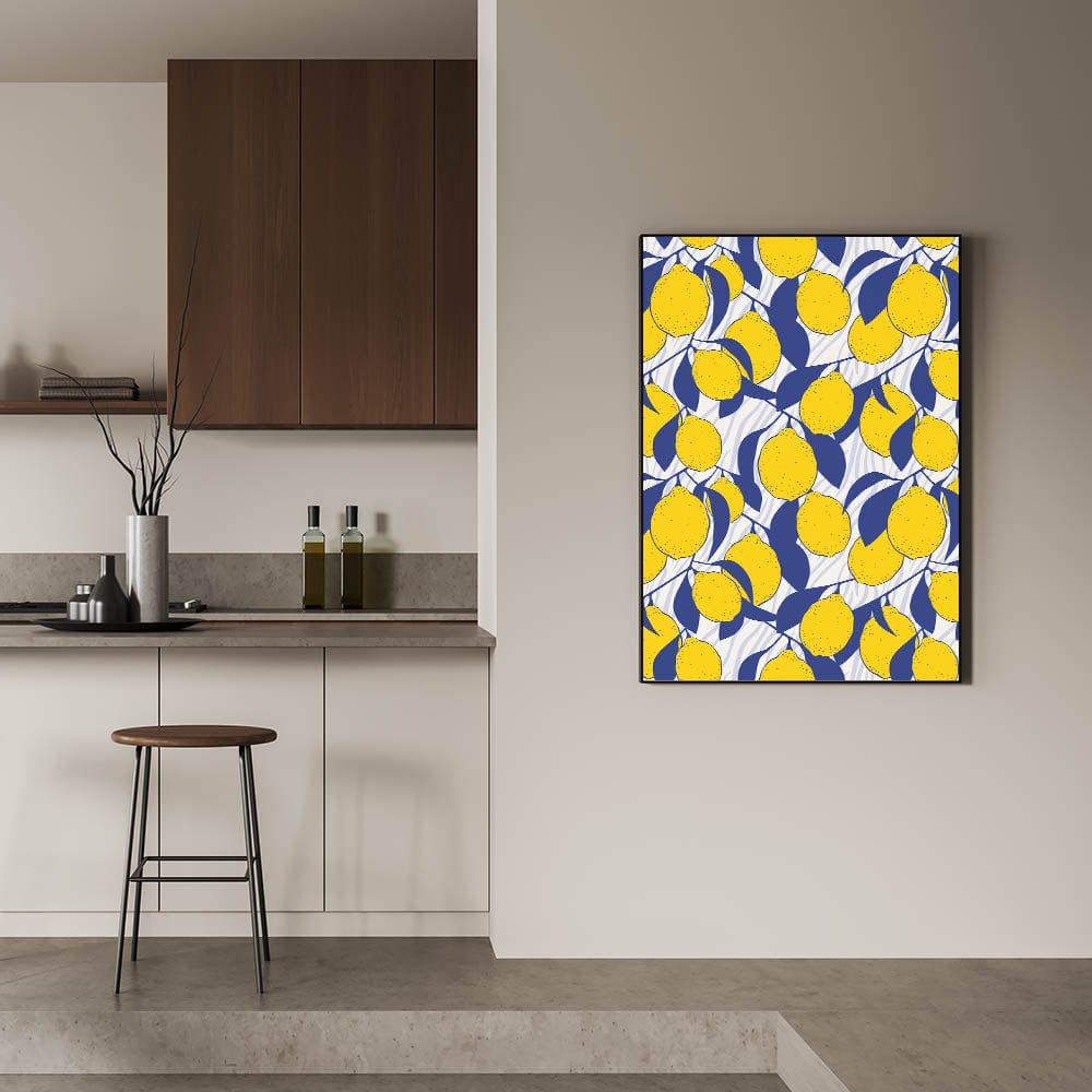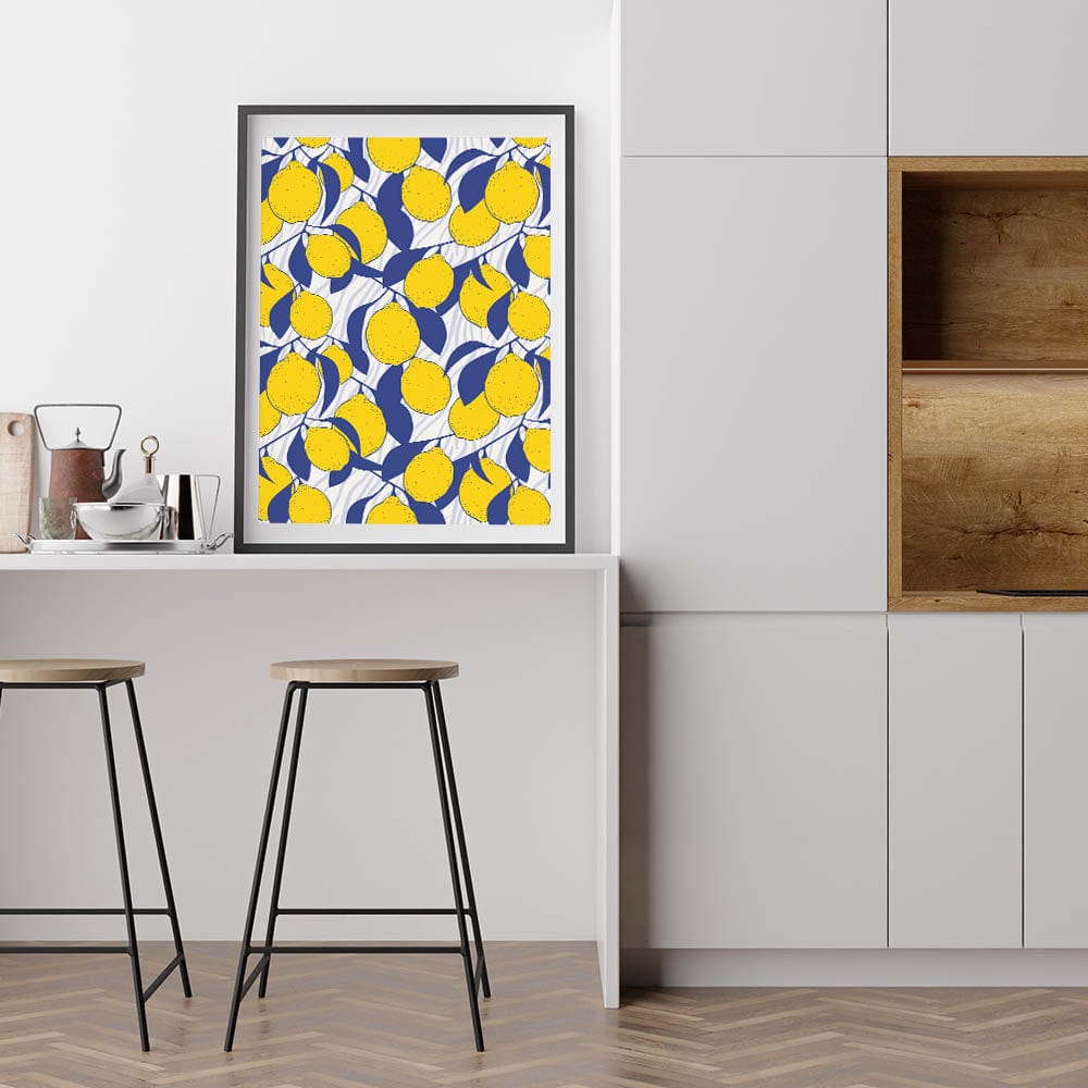 Add a zesty and vibrant touch to your kitchen with this fruit art print featuring bright yellow lemons and deep navy blue leaves. This modern fruit-themed wall art brings a fresh and artistic feel to your home, perfect for those who love bold and contemporary designs.