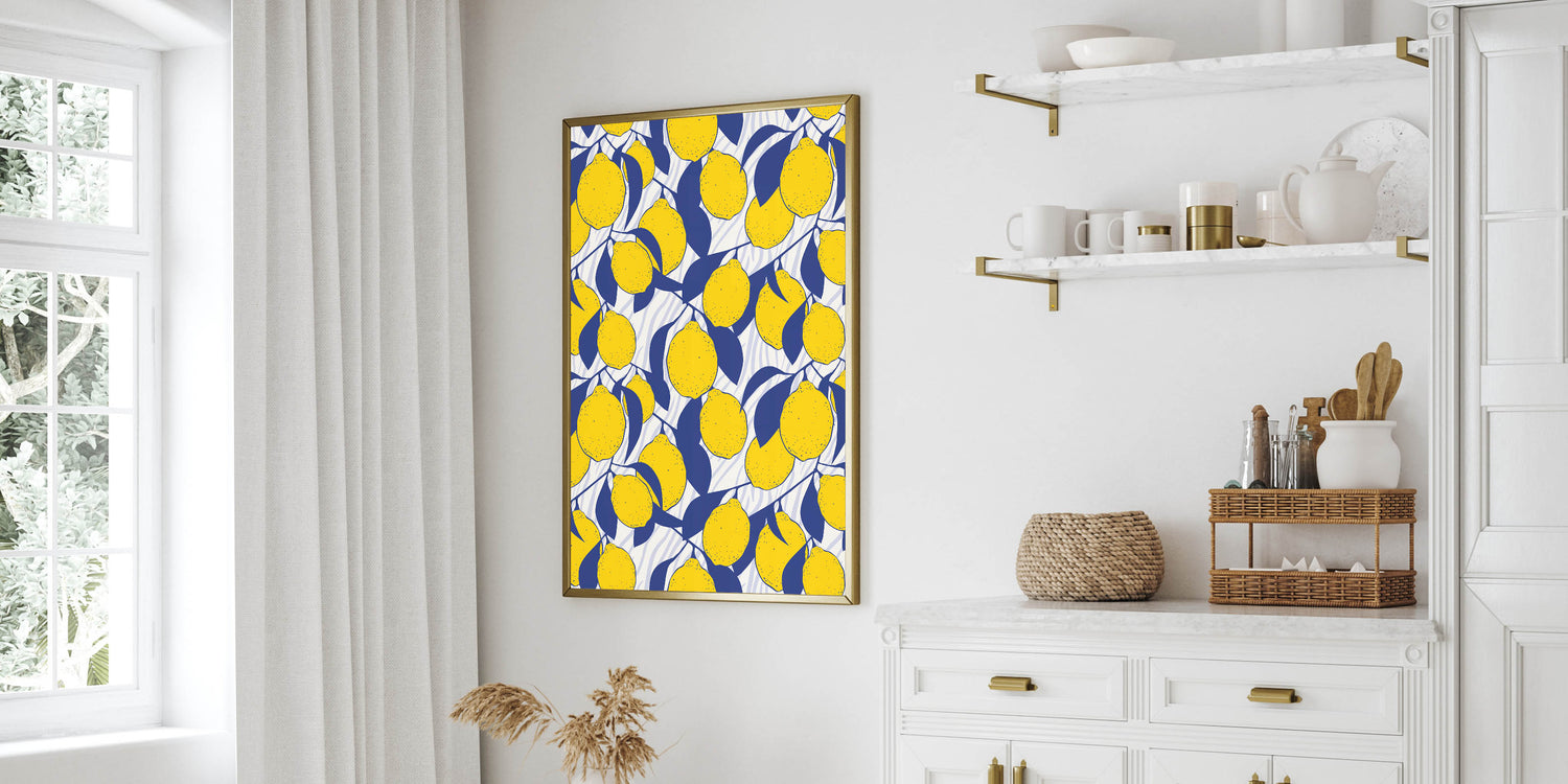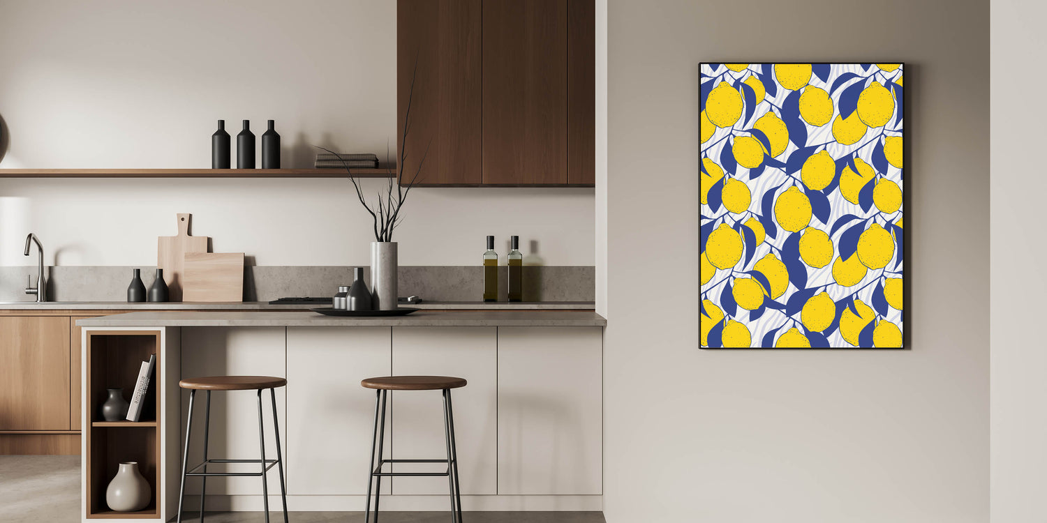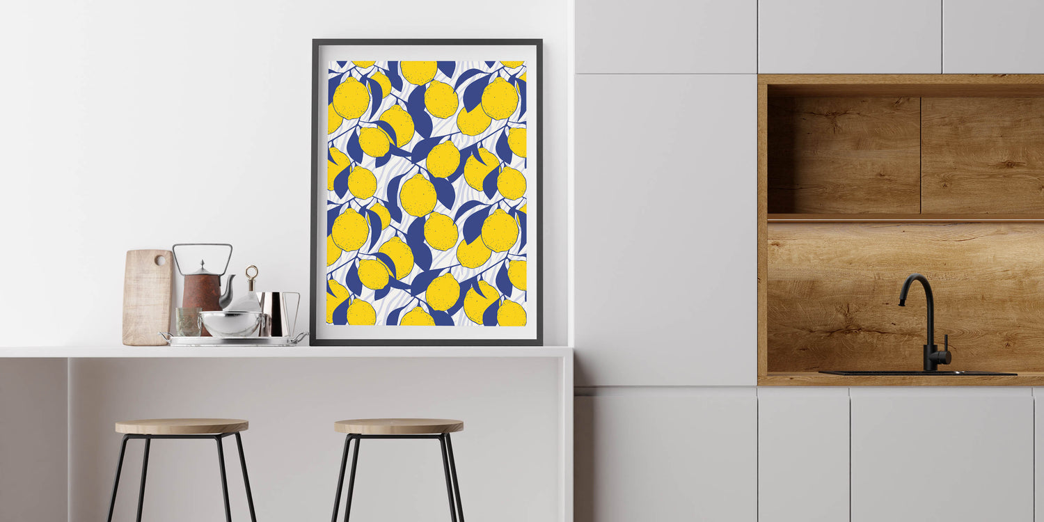Add a zesty and vibrant touch to your kitchen with this fruit art print featuring bright yellow lemons and deep navy blue leaves. This modern fruit-themed wall art brings a fresh and artistic feel to your home, perfect for those who love bold and contemporary designs.