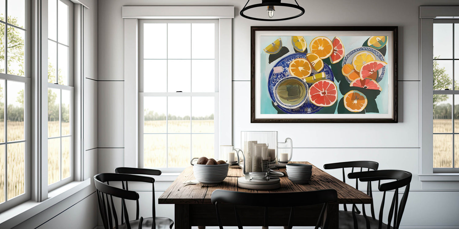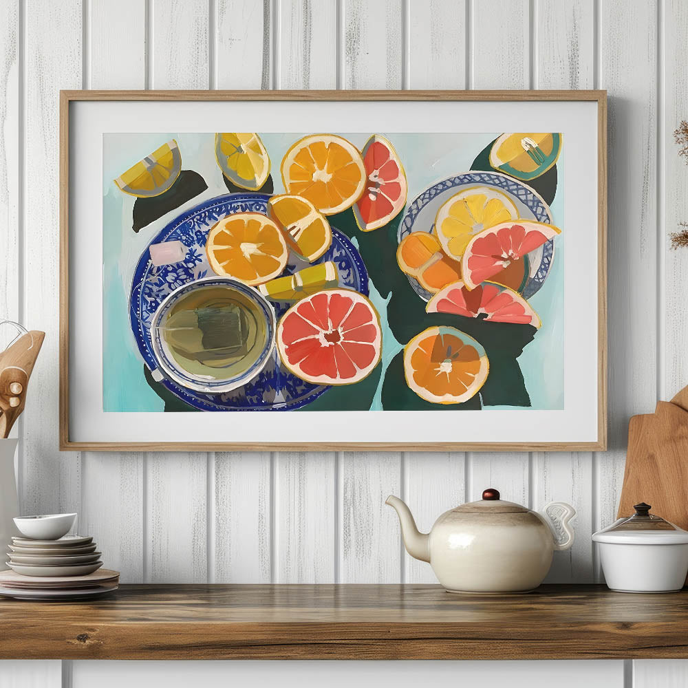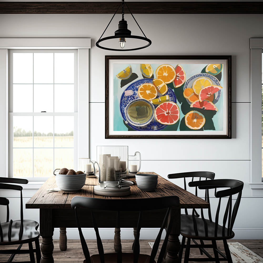 Add a burst of freshness to your space with this fruit-themed wall art, featuring a vibrant still life of sliced oranges, grapefruits, and lemons arranged on elegant blue-patterned plates. The bold brushstrokes and dynamic color palette make this fruit still life art an eye-catching piece for any modern kitchen, dining area, or cafe setting.