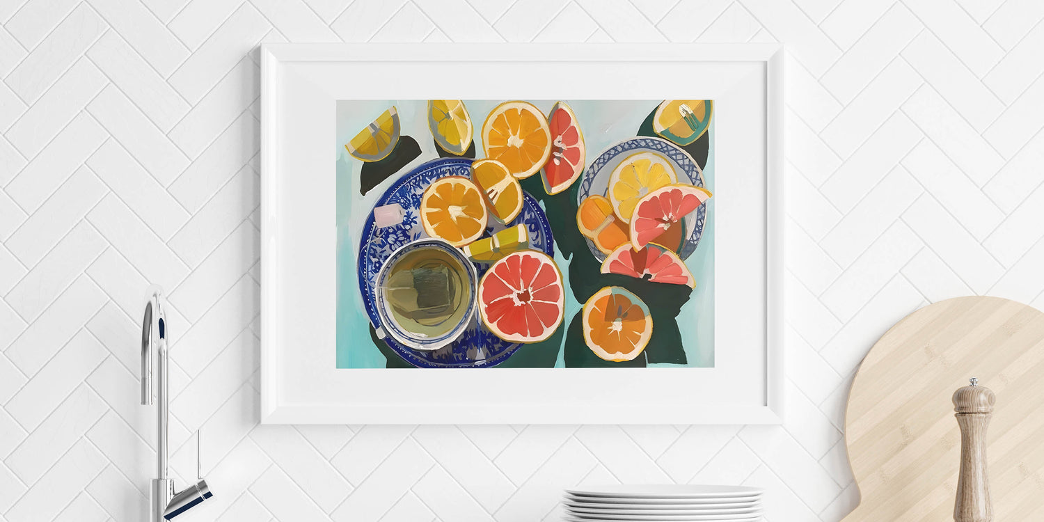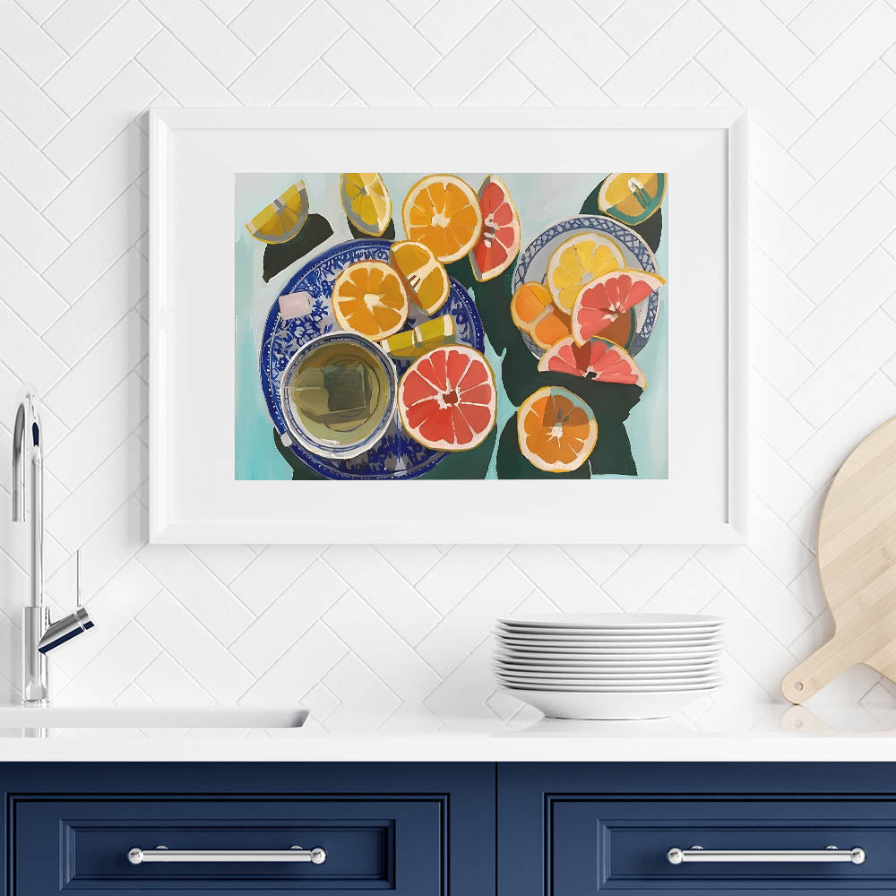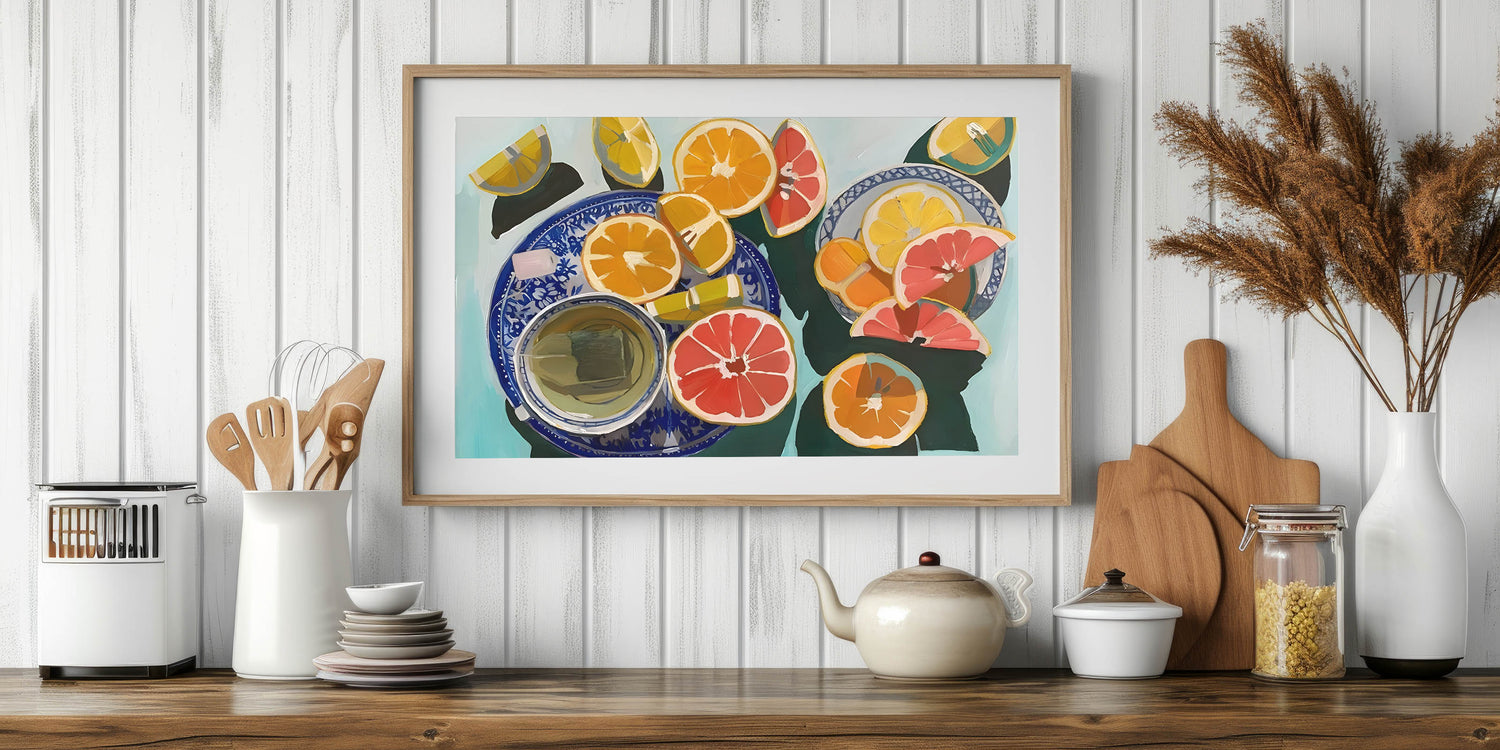 Add a burst of freshness to your space with this fruit-themed wall art, featuring a vibrant still life of sliced oranges, grapefruits, and lemons arranged on elegant blue-patterned plates. The bold brushstrokes and dynamic color palette make this fruit still life art an eye-catching piece for any modern kitchen, dining area, or cafe setting.
