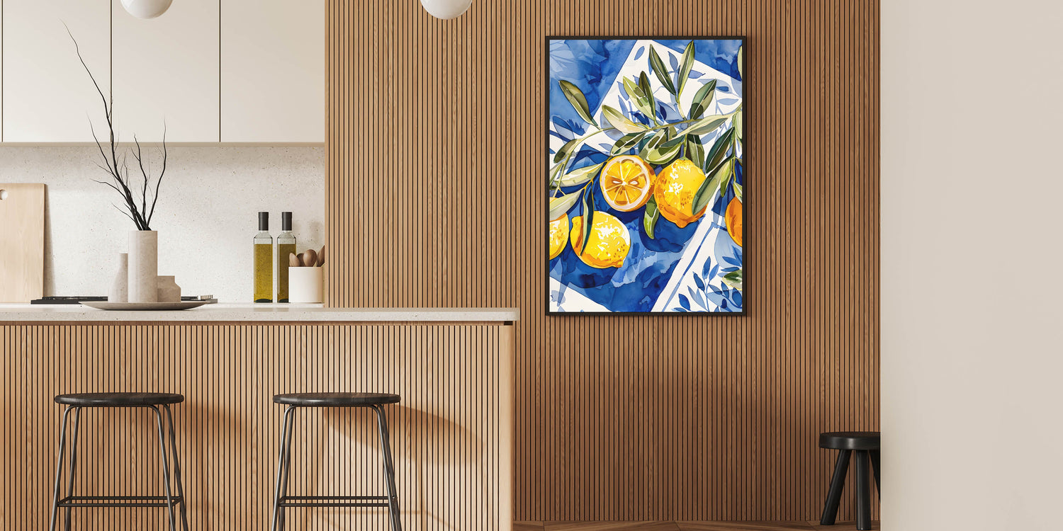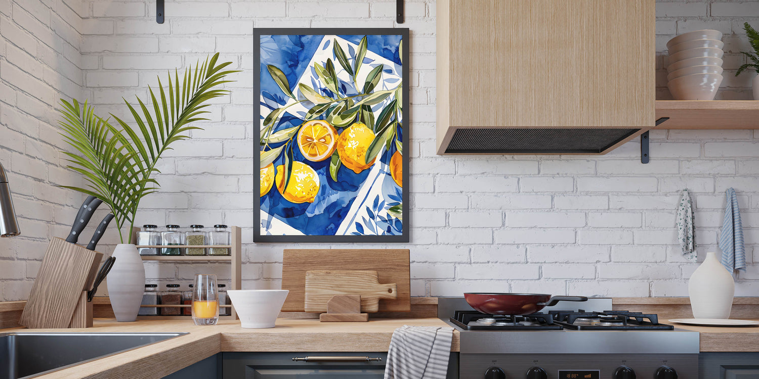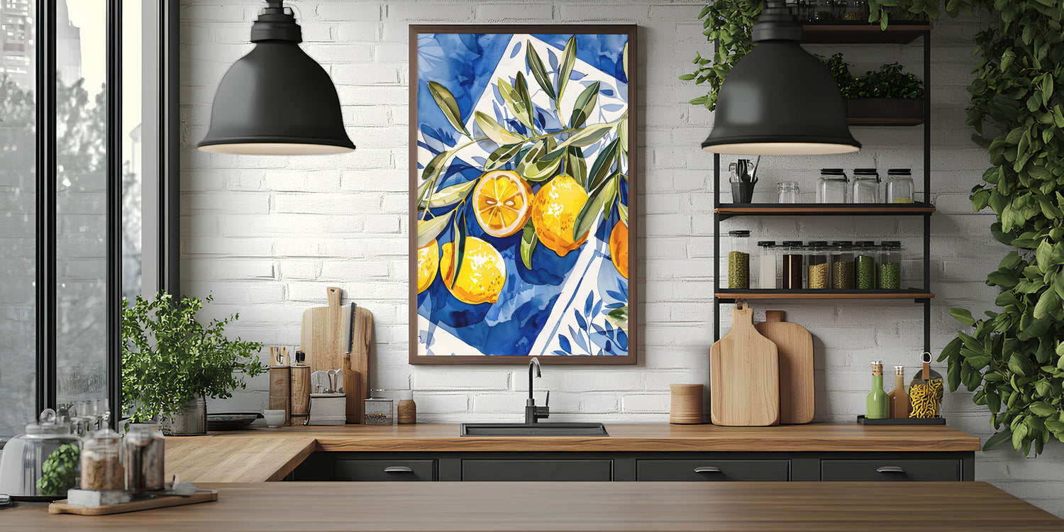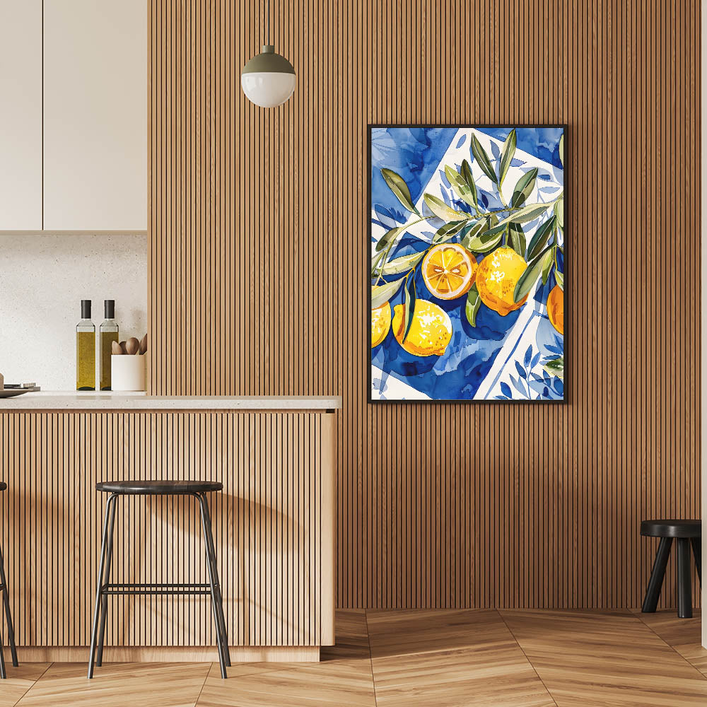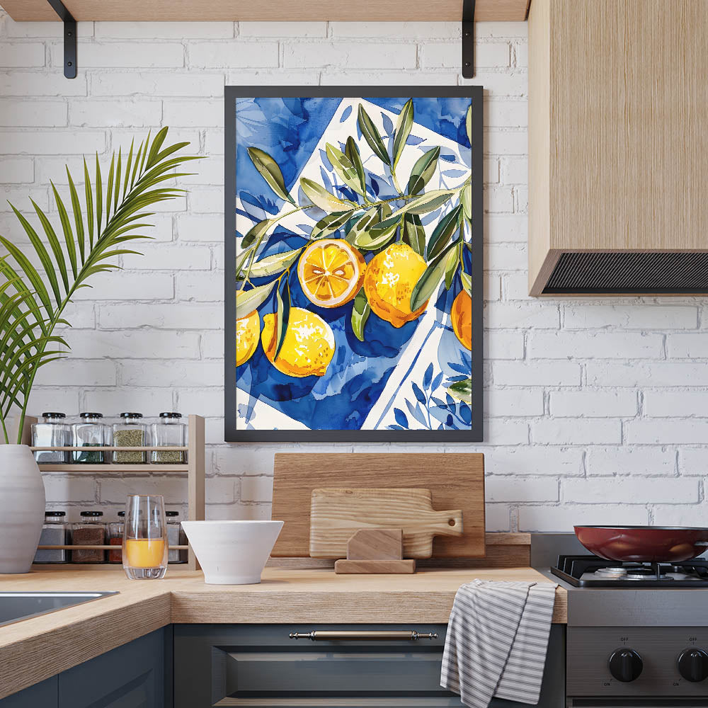 Transform your space with this fruit-themed wall art, featuring a stunning Mediterranean-inspired still life of ripe lemons on a blue-patterned background. The bright yellow hues contrast beautifully against the rich indigo tones, making this fruit watercolor art a statement piece for kitchens, dining rooms, or cafe interiors.