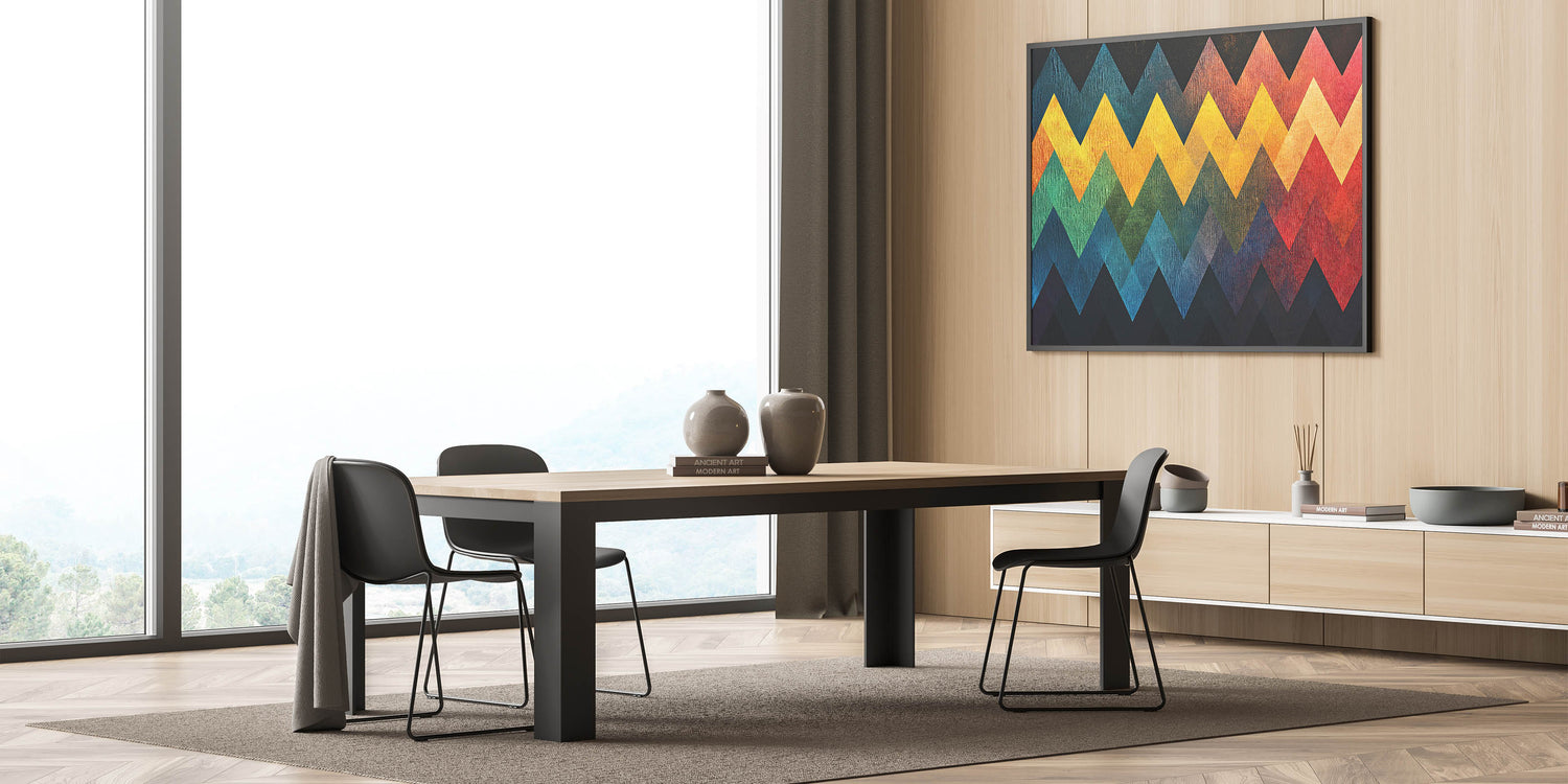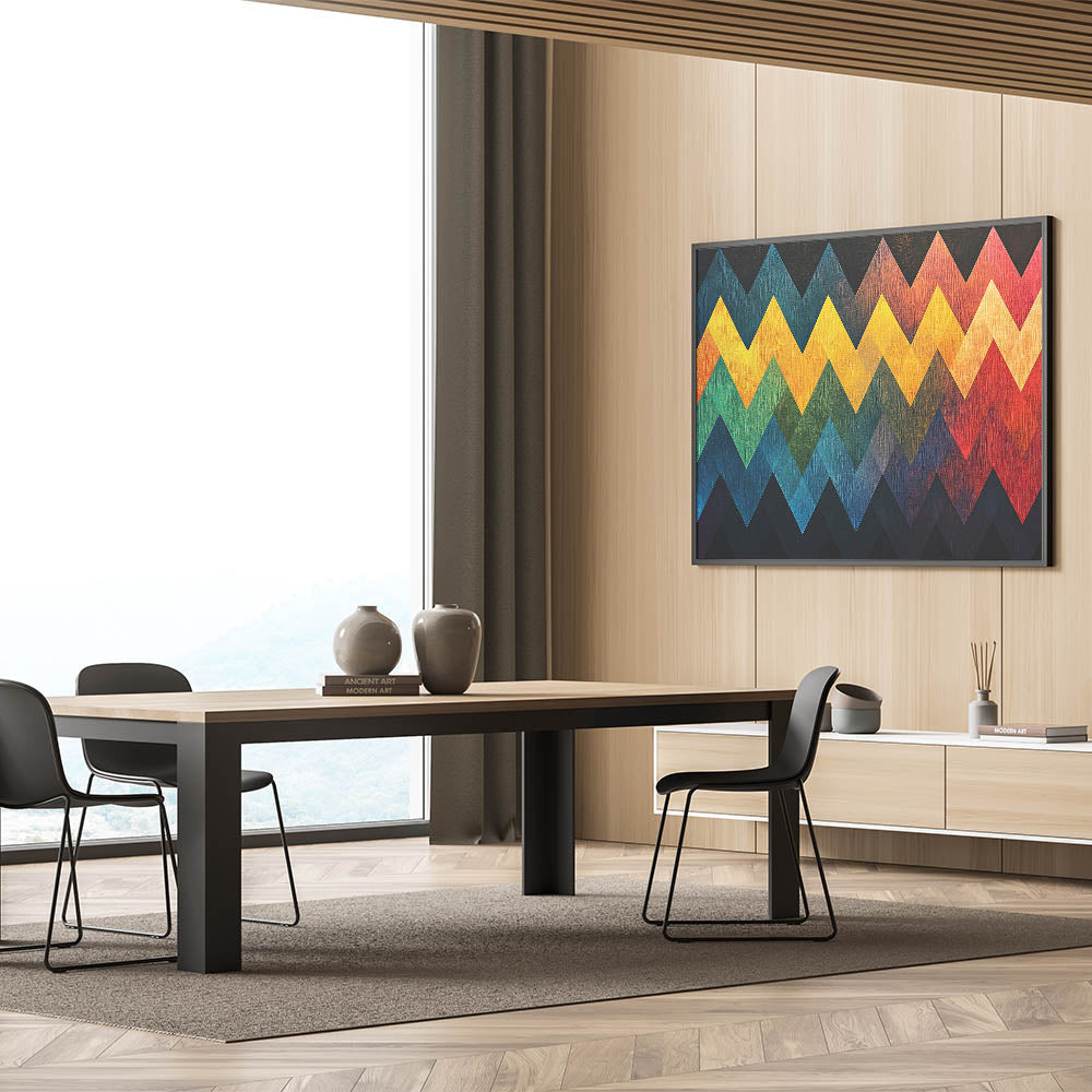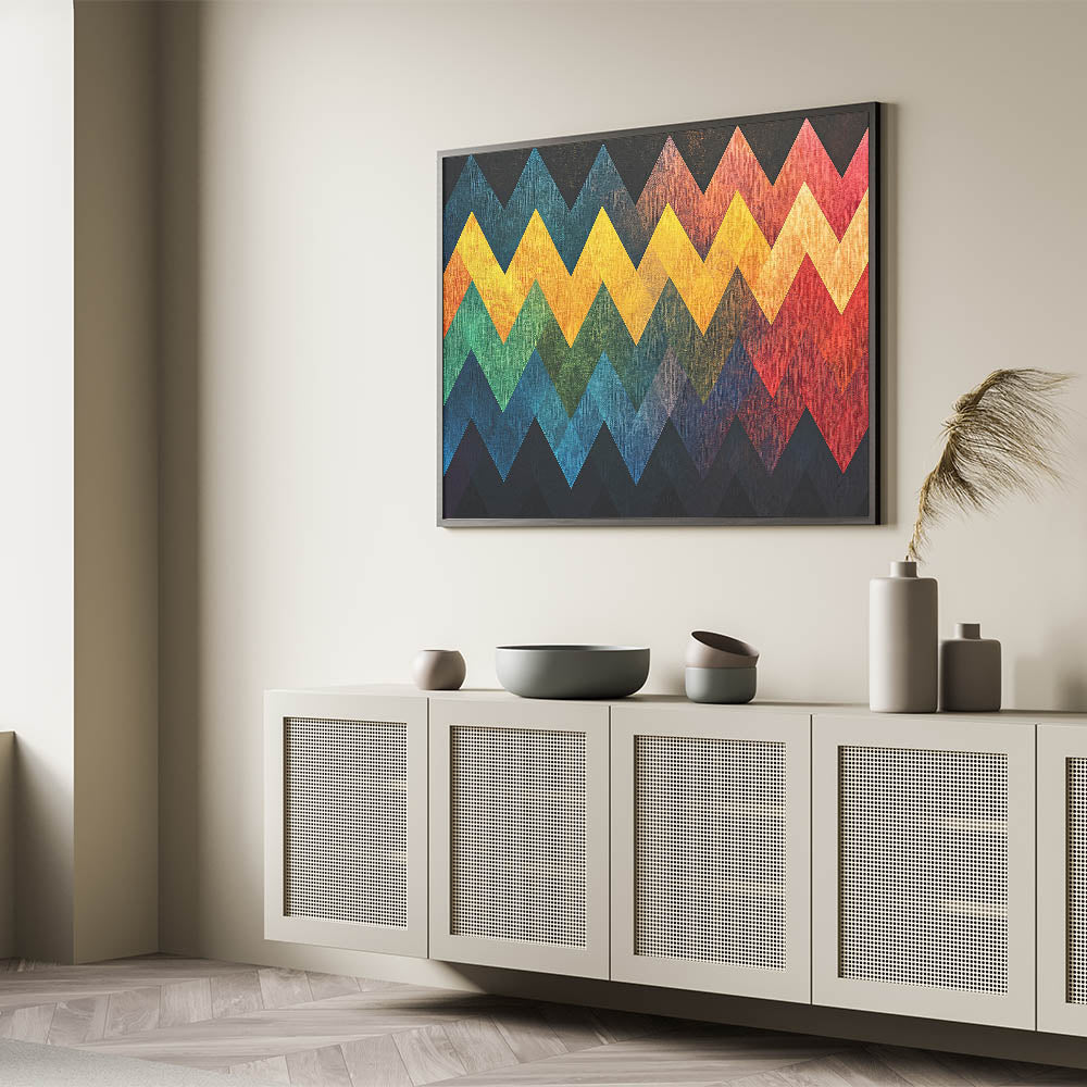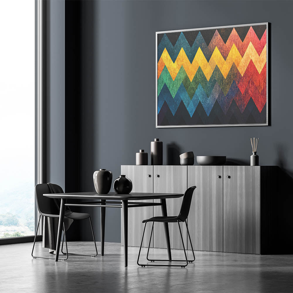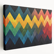 Add bold rhythm to your space with this bold abstract wall art from our High-Contrast Abstracts collection. This design showcases a repeating chevron pattern in a vibrant gradient of blues, greens, yellows, oranges, and reds. The textured, overlapping layers create depth and movement, making it an instant focal point.