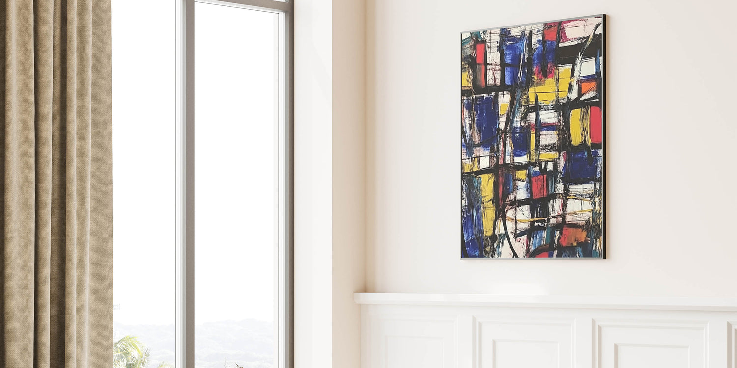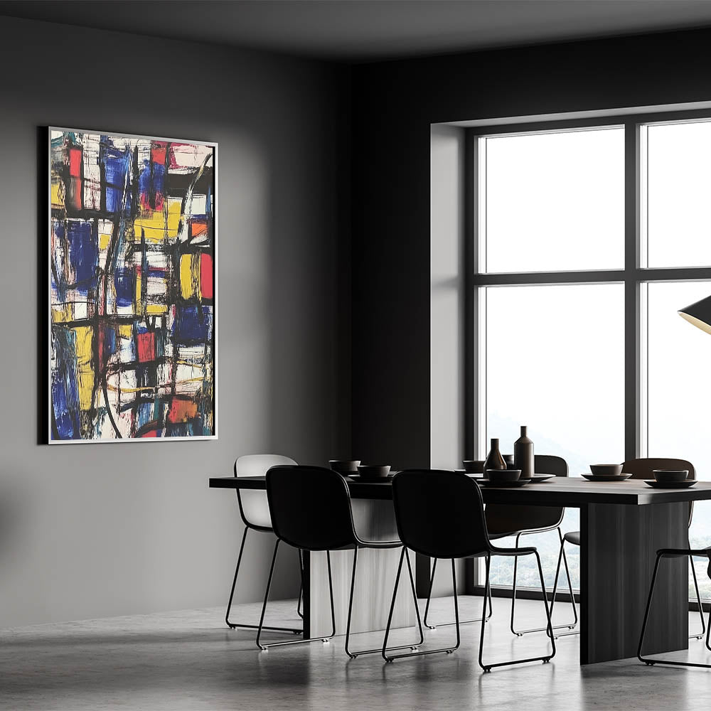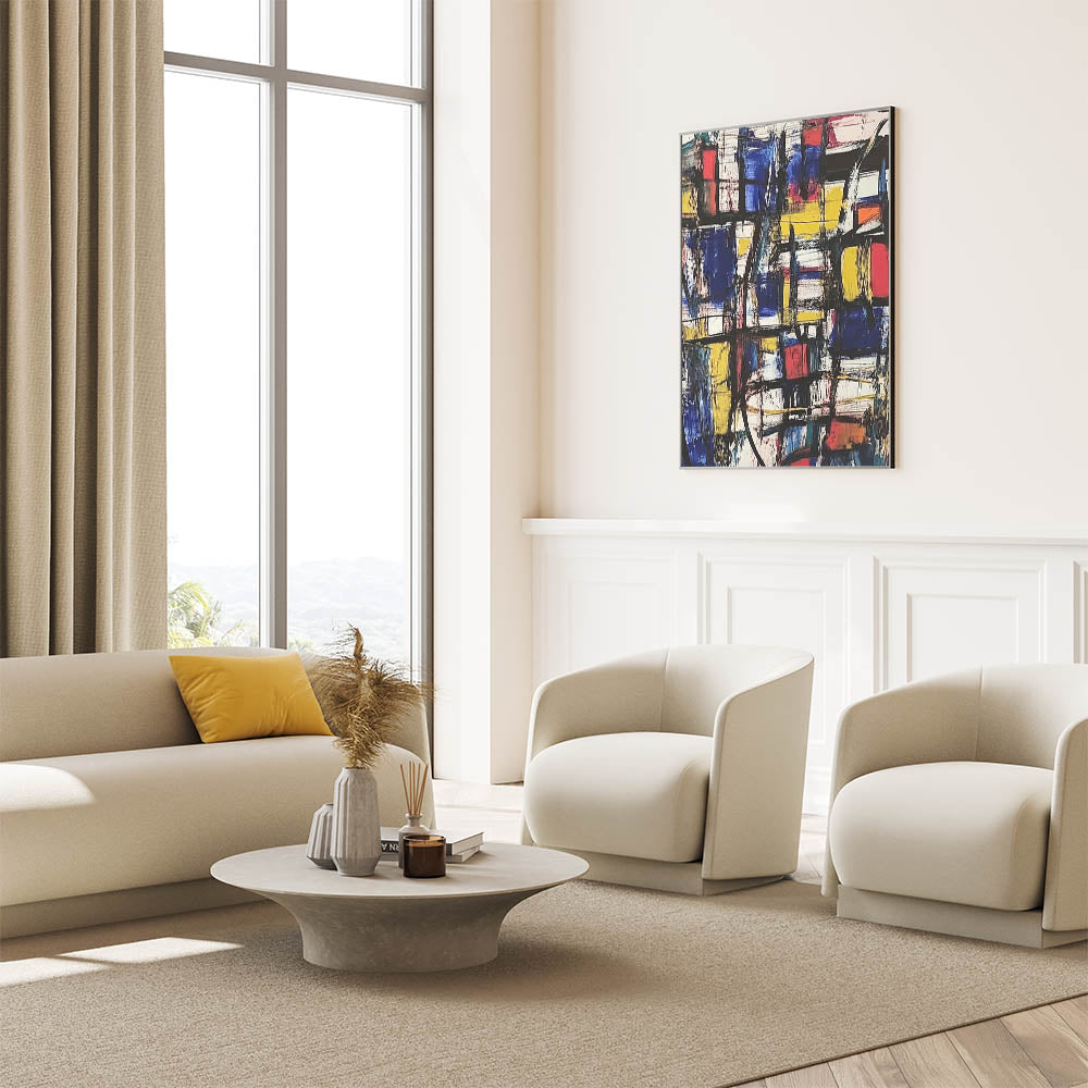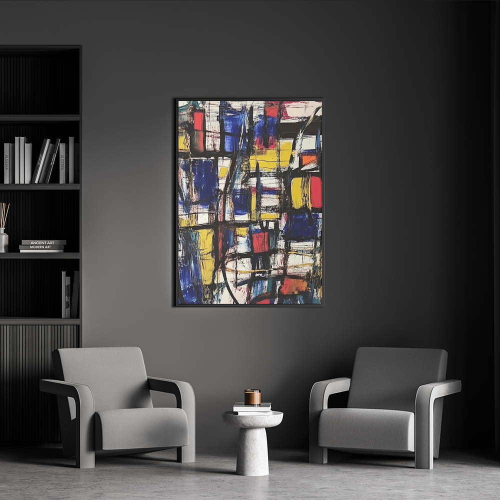 Make a striking statement with this Abstract Expressionist Art for Home Decor. Featuring a powerful mix of royal blue, yellow, red, and black, this Original Abstract Expressionist Painting blends bold geometric shapes with expressive brushstrokes, creating a vibrant and energetic composition. This Expressionist Canvas Wall Art is the perfect fusion of structure and freeform artistry.