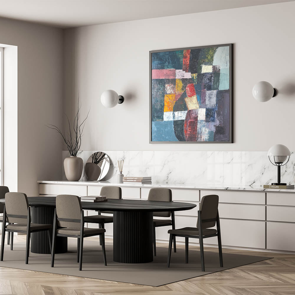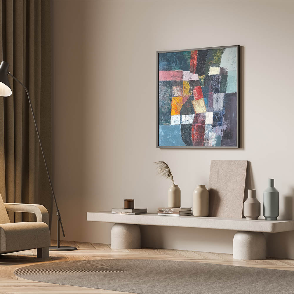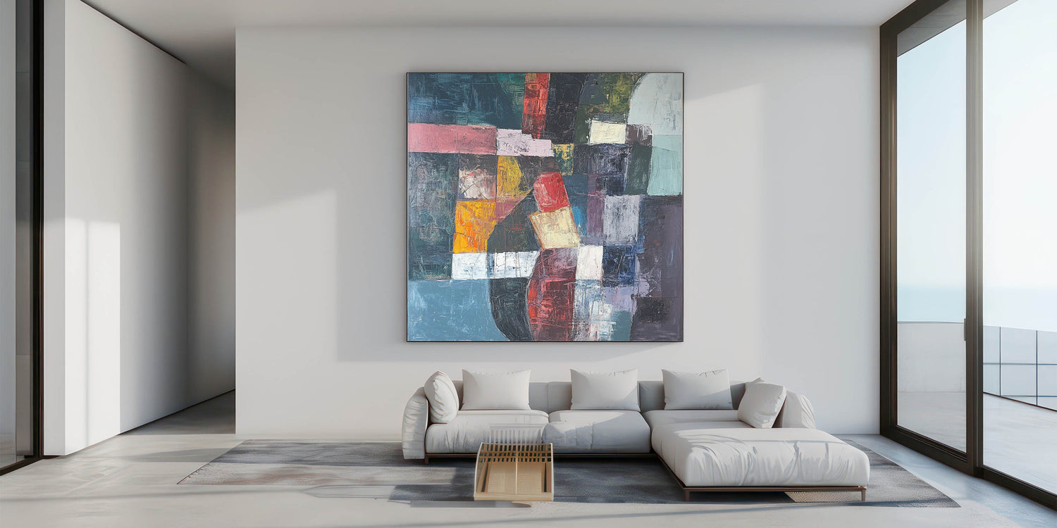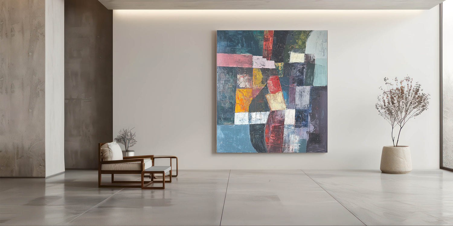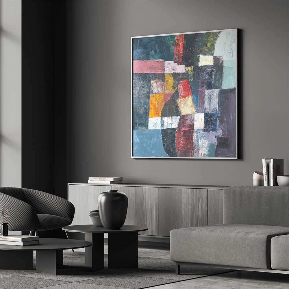 Enhance your space with the structured beauty of this Abstract Expressionist Art for Home Decor. Featuring a compelling blend of dark blue, red, yellow, and deep green, this Original Abstract Expressionist Painting combines geometric forms with expressive textures. The bold yet balanced composition of this Expressionist Canvas Wall Art makes it a captivating focal point for any modern space.