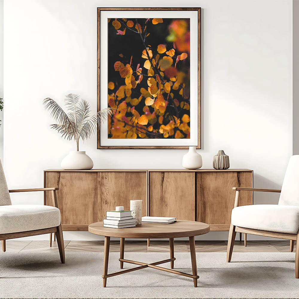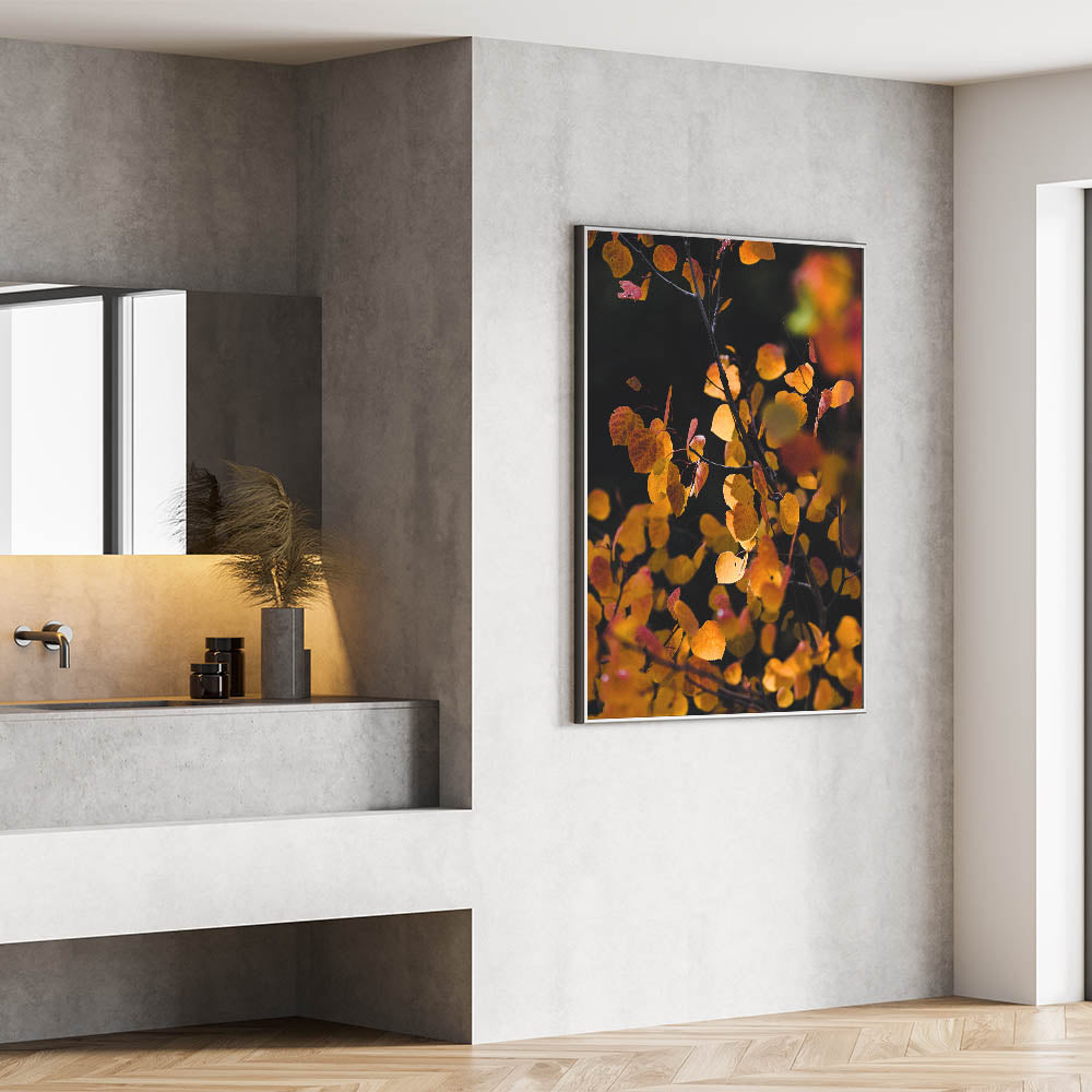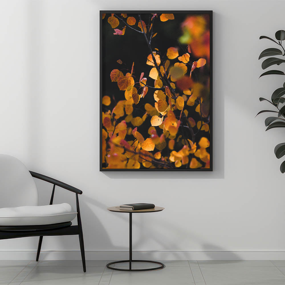 Embrace the breathtaking beauty of autumn with this fall wall art featuring golden and amber leaves against a soft, dark background. The delicate details of each leaf and the warm autumn tones create a serene and cozy atmosphere, making it a perfect seasonal addition to any space. This autumn wall art effortlessly blends with modern, rustic, or nature-inspired interiors.