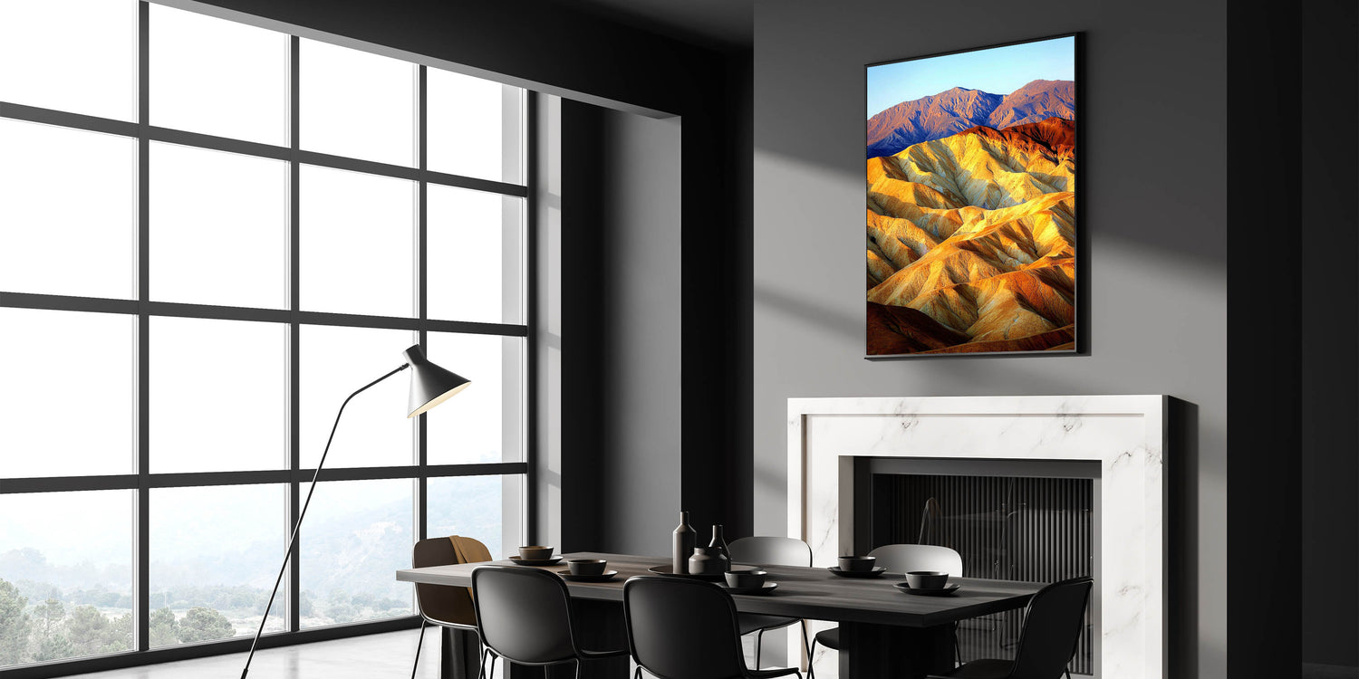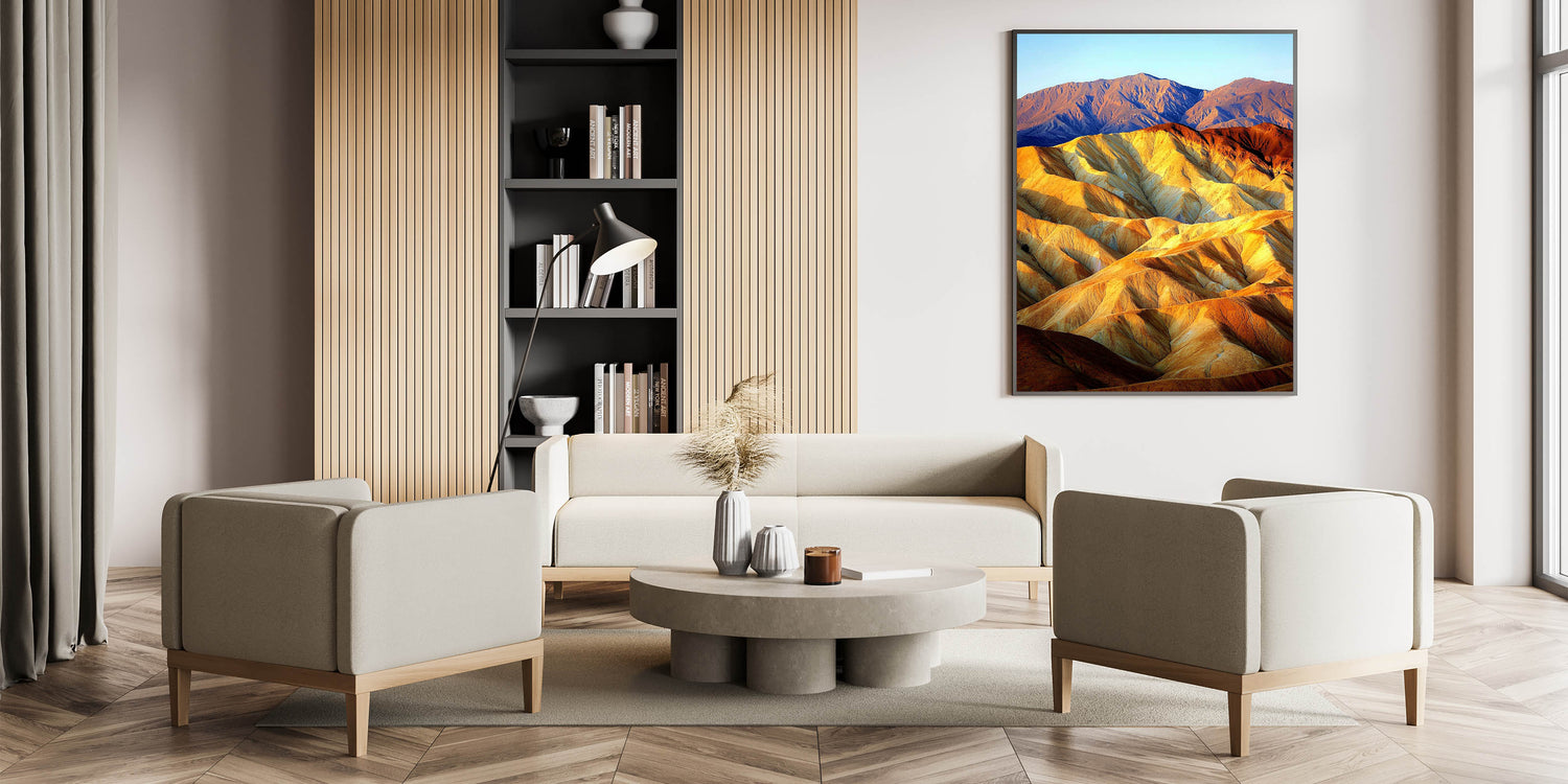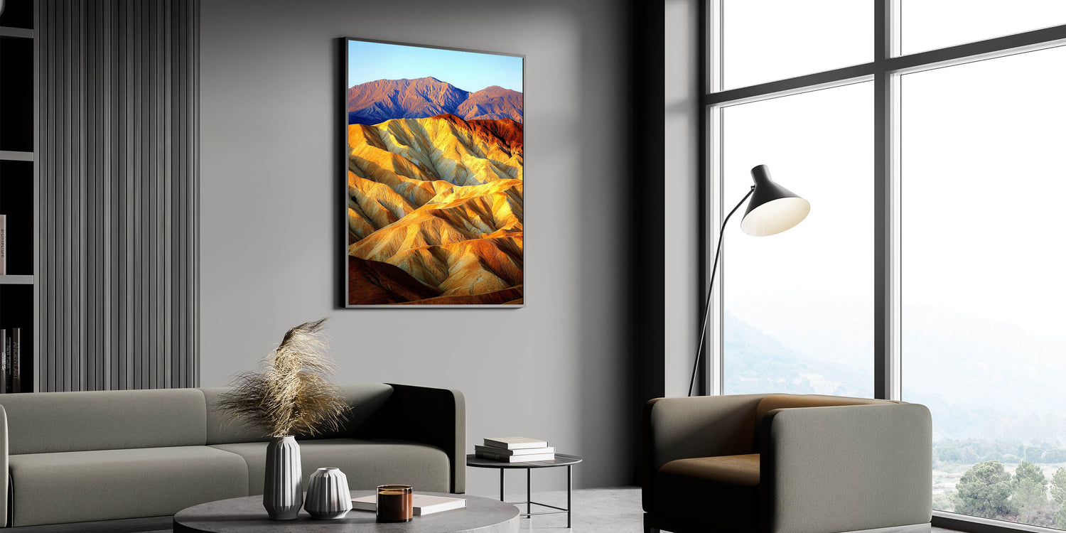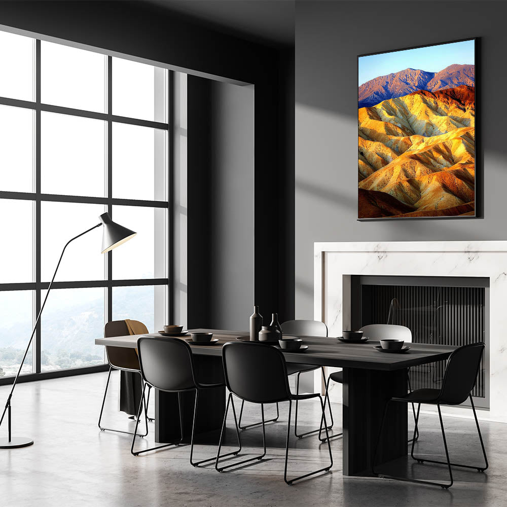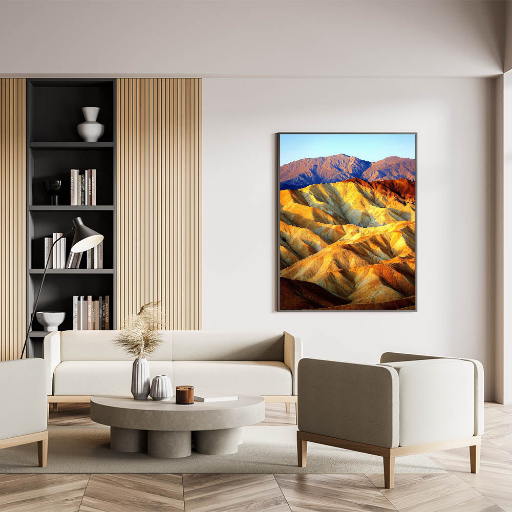 Transform your space with the striking beauty of this golden desert peaks wall art. Featuring the vibrant interplay of sunlight and shadow over rugged ridges, this artwork highlights the dramatic contours and textures of a breathtaking desert landscape. The backdrop of deep blue and rust-colored mountains adds depth and contrast, creating an unforgettable visual experience.