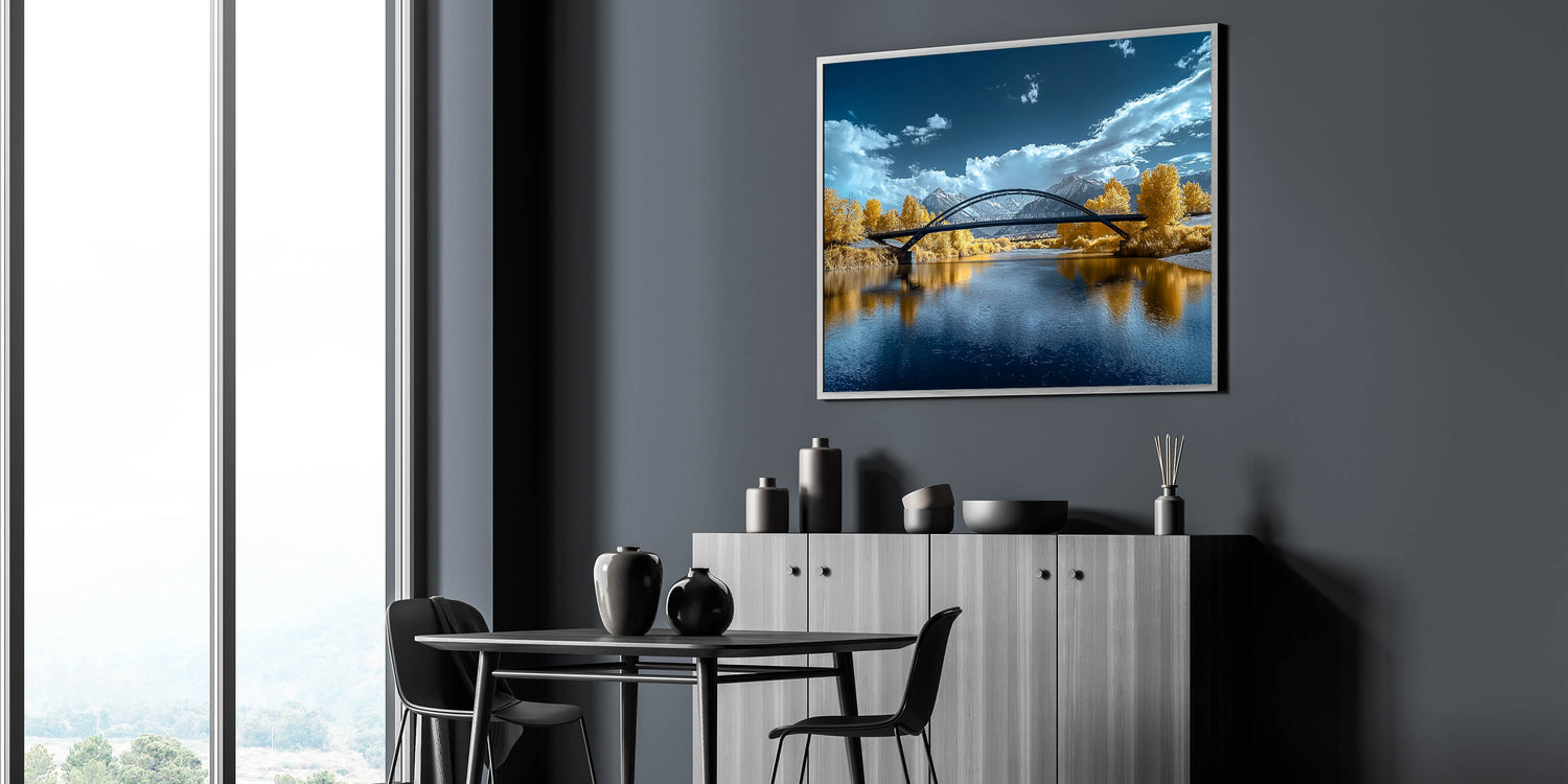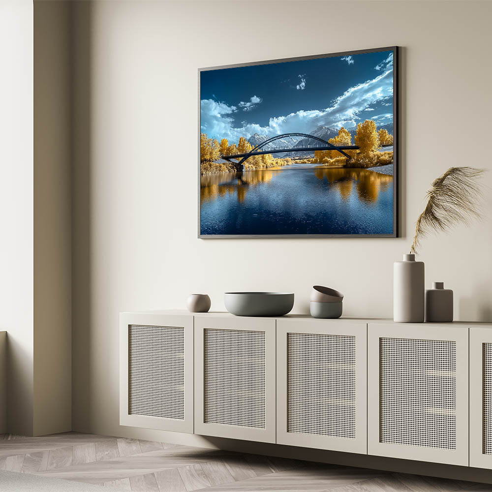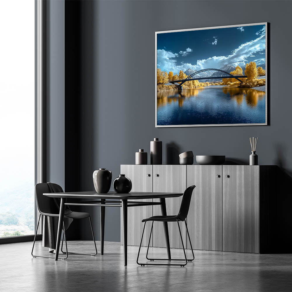 Add a touch of elegance to your space with this "Golden Horizon" modern bridge photography print. This captivating artwork features a sleek, arched bridge spanning a tranquil river. The stunning golden hues of the surrounding foliage contrast beautifully with the vibrant blue tones of the water and sky, creating a scene of serene beauty. The snow-capped mountains in the distance and dynamic clouds complete the landscape, offering depth and sophistication to this unique piece.