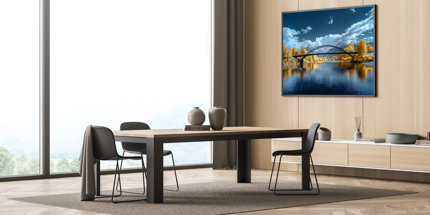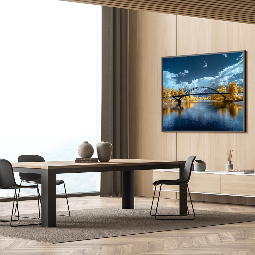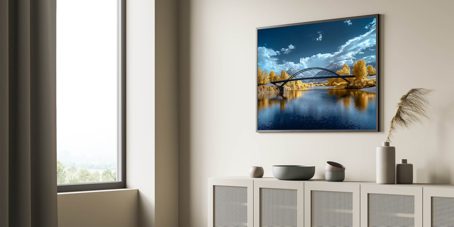 Add a touch of elegance to your space with this "Golden Horizon" modern bridge photography print. This captivating artwork features a sleek, arched bridge spanning a tranquil river. The stunning golden hues of the surrounding foliage contrast beautifully with the vibrant blue tones of the water and sky, creating a scene of serene beauty. The snow-capped mountains in the distance and dynamic clouds complete the landscape, offering depth and sophistication to this unique piece.