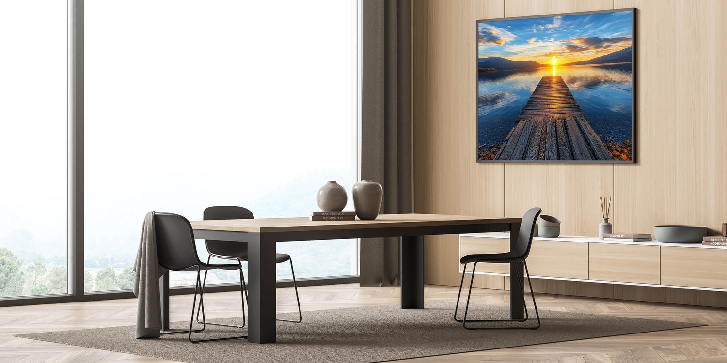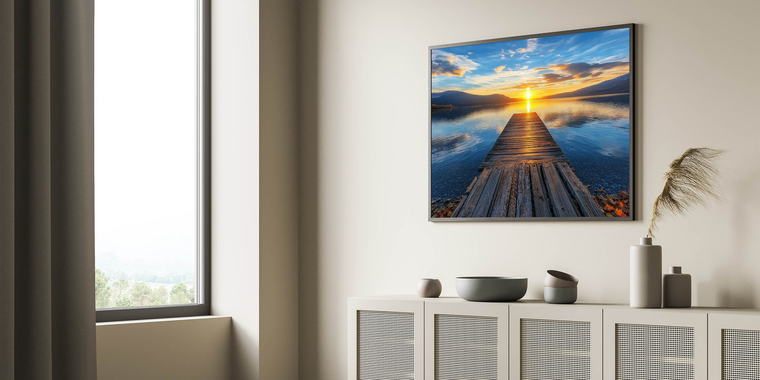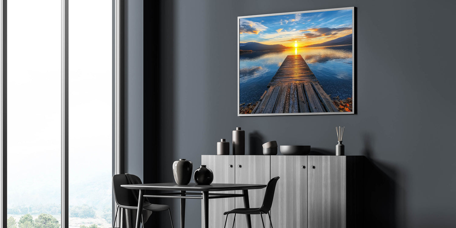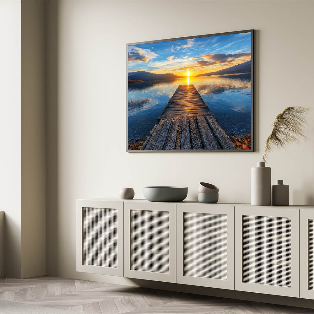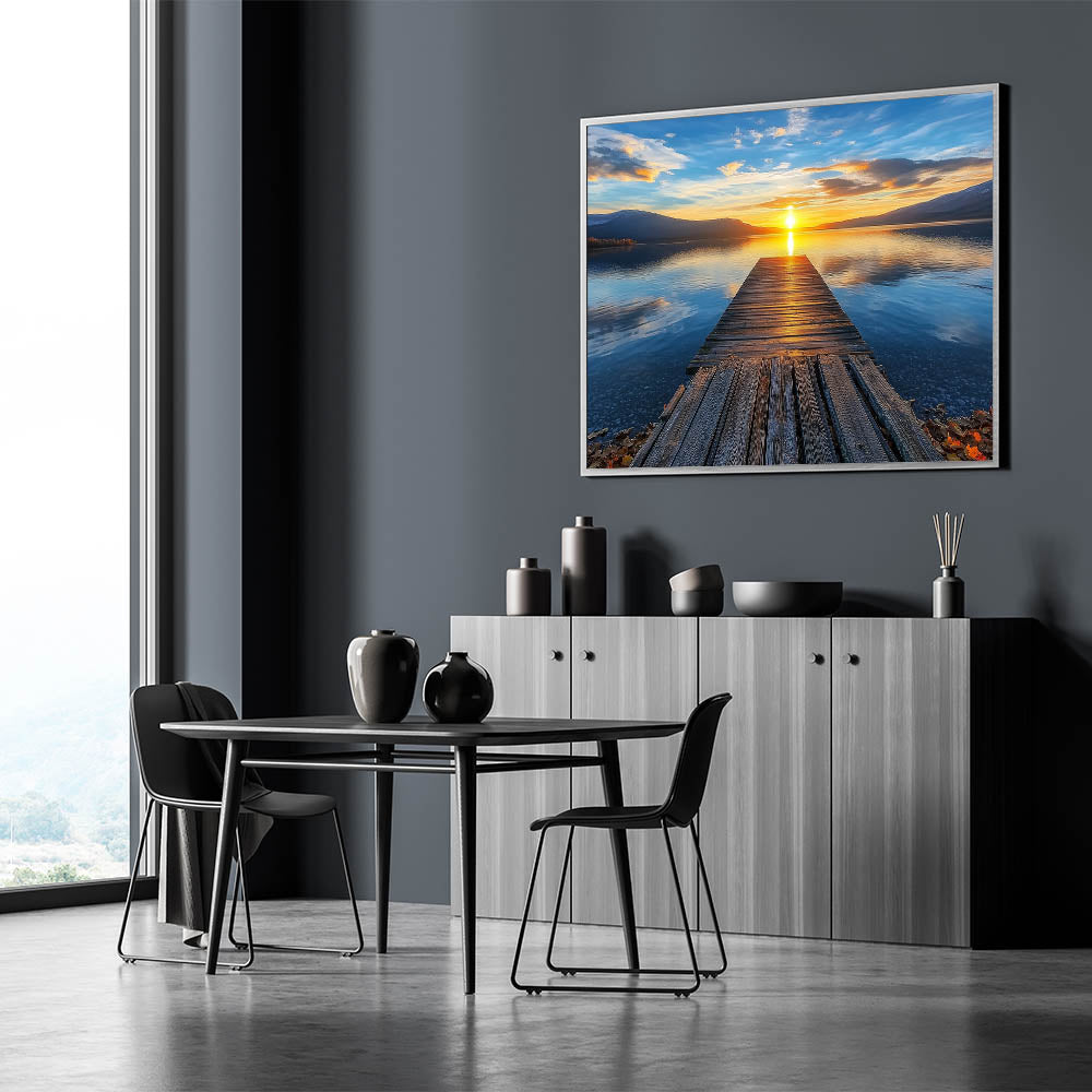 Immerse yourself in the captivating allure of this Golden Horizon bridge print. Featuring a rustic wooden pier stretching into the serene expanse of a glistening lake, this artwork captures the breathtaking moment of a golden sunset. The rich interplay of blue and orange tones creates a calming yet vibrant composition, perfect for any living room, bedroom, or workspace. This scenic landscape art is ideal for adding a serene and elegant atmosphere to your decor.