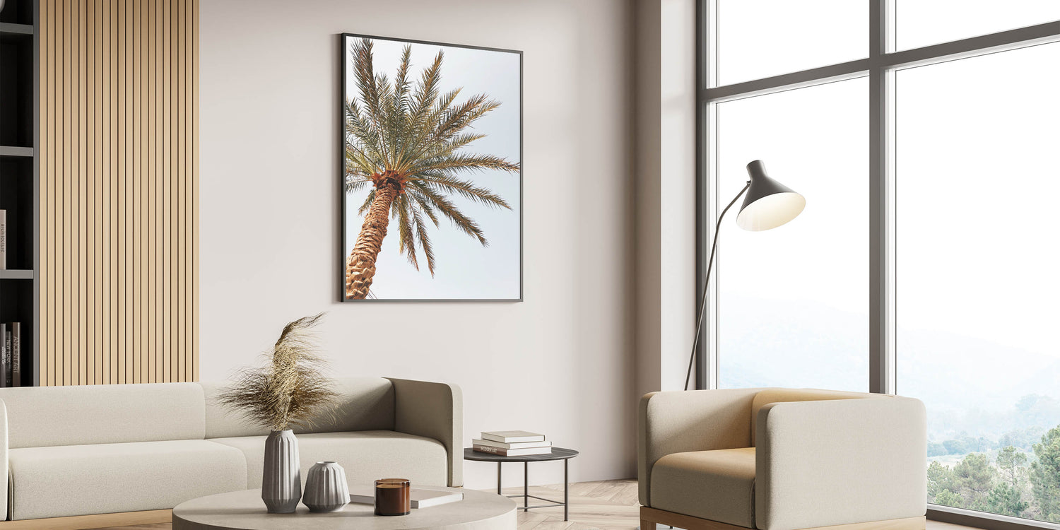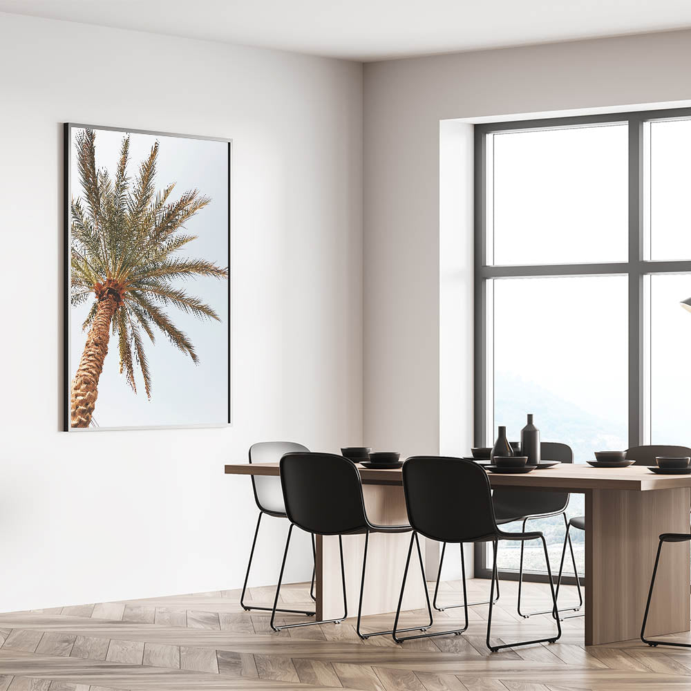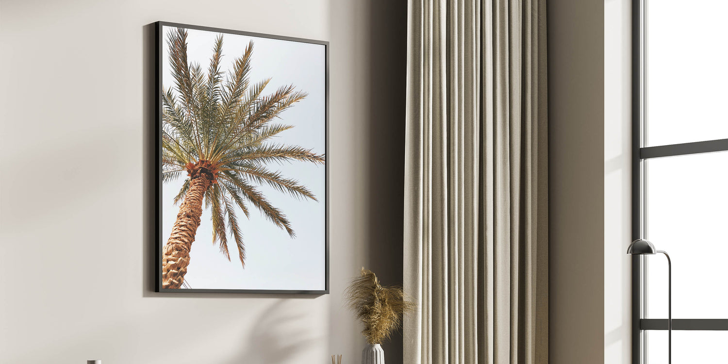 Immerse yourself in the warm tropical vibes of this summer wall art, featuring a stunning close-up of a golden-hued palm tree reaching toward the sky. The rich textures of the tree trunk and the delicate fronds swaying in the breeze make this summer canvas art a perfect addition to modern, minimalist, or coastal-inspired interiors. Whether displayed in a beach house or contemporary home, this tropical wall art brings the essence of summer indoors.