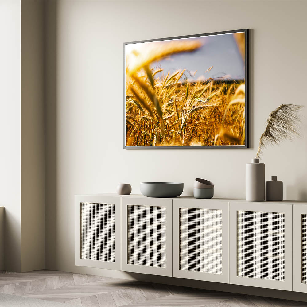 - Depicts a golden wheat field basking in sunlight, creating a warm and inviting atmosphere