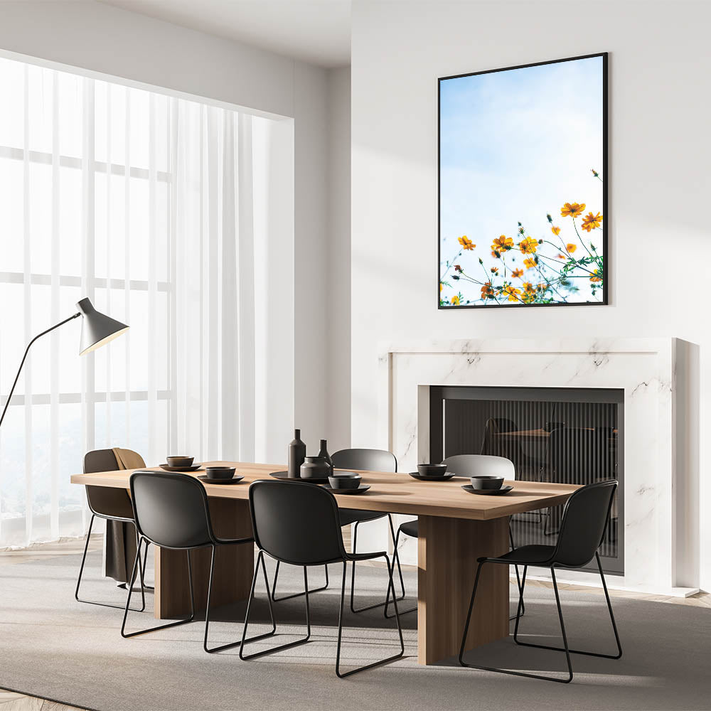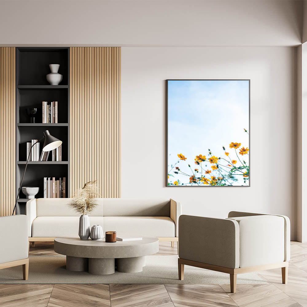 Embrace the warmth and vibrancy of spring with this golden wildflower spring wall art, featuring delicate yellow flowers stretching towards a bright blue sky. The soft natural light enhances the golden petals, creating a refreshing and uplifting composition that embodies the essence of spring. This spring canvas art is a perfect choice for floral lovers and those looking to brighten their space with nature’s beauty.