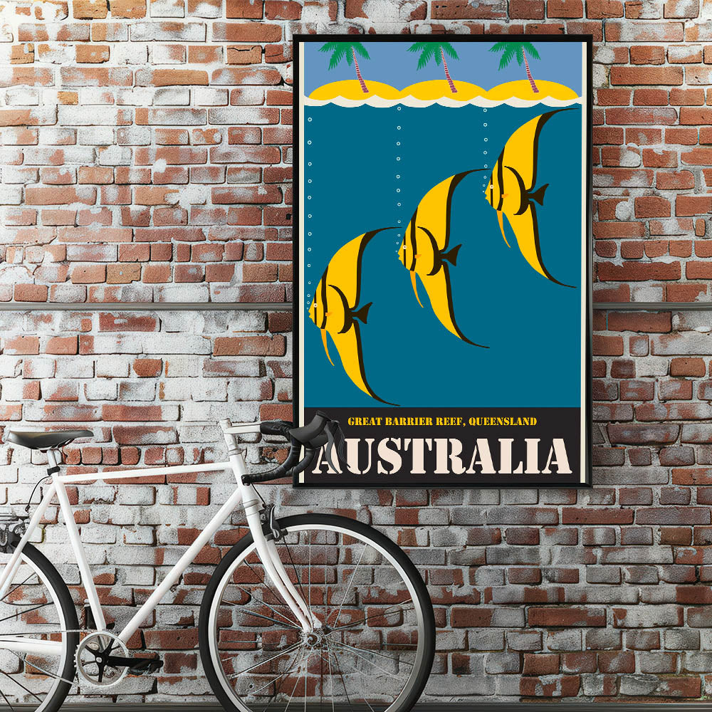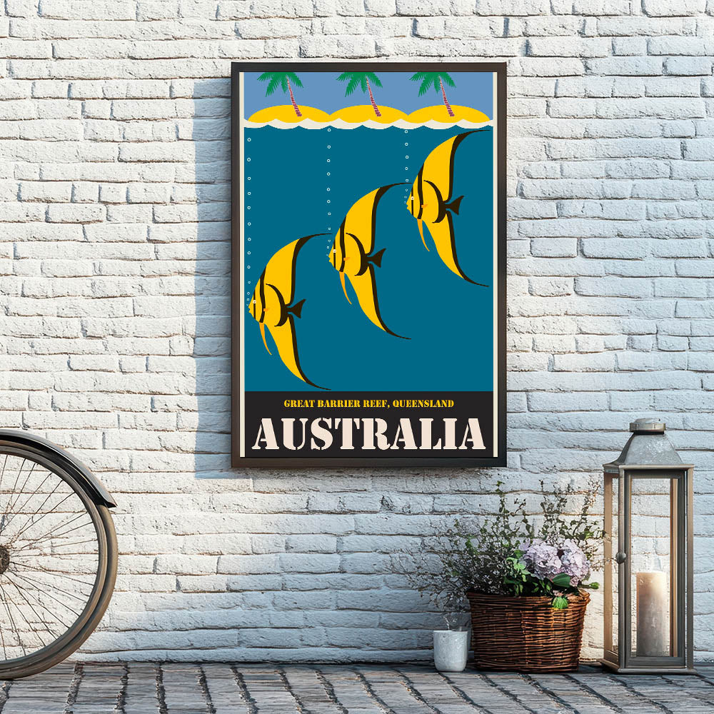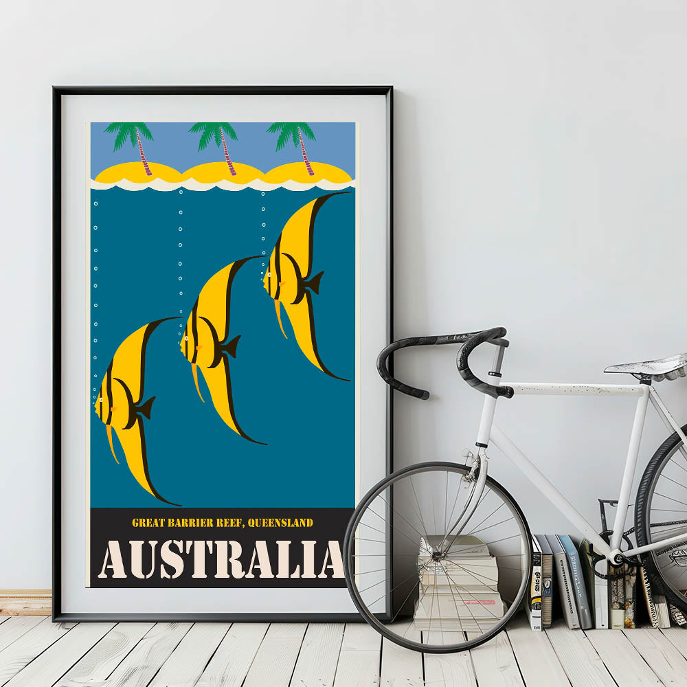 Dive into the vibrant beauty of Australia’s Great Barrier Reef with this retro-inspired travel poster. Featuring a colorful underwater scene with yellow-striped fish and swaying palm trees on a tropical island, this piece perfectly captures the essence of Queensland's stunning marine life. The bold blue background and playful design evoke the beauty and fun of Australia’s most famous natural wonder, making it an ideal addition to any coastal or travel-themed decor.