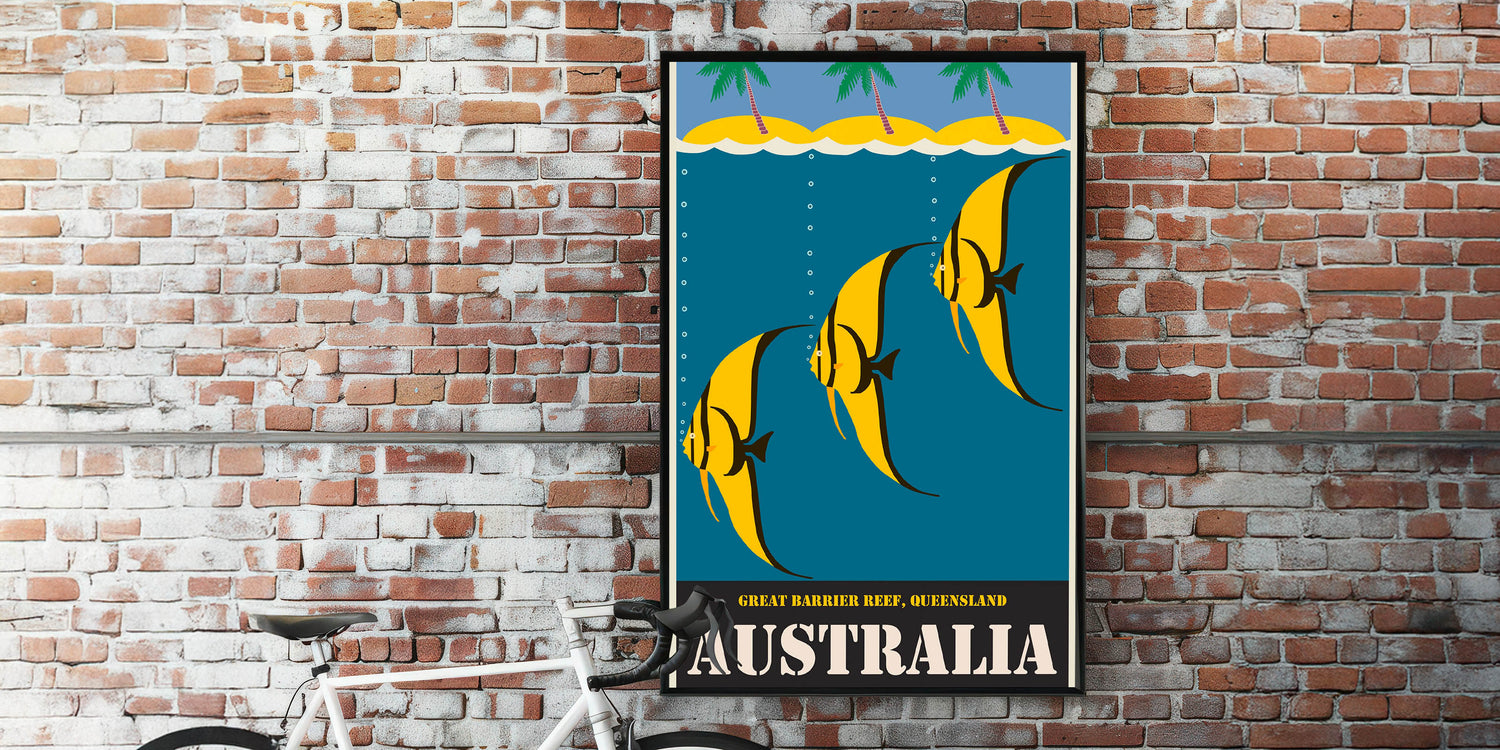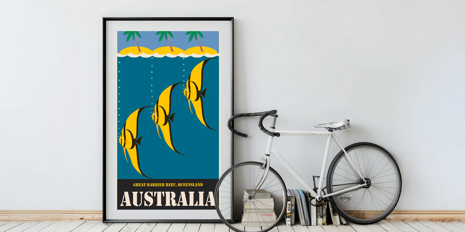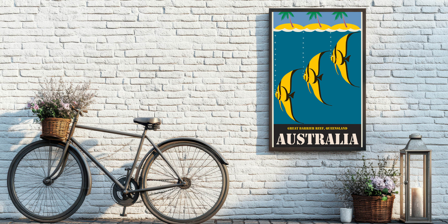 Dive into the vibrant beauty of Australia’s Great Barrier Reef with this retro-inspired travel poster. Featuring a colorful underwater scene with yellow-striped fish and swaying palm trees on a tropical island, this piece perfectly captures the essence of Queensland's stunning marine life. The bold blue background and playful design evoke the beauty and fun of Australia’s most famous natural wonder, making it an ideal addition to any coastal or travel-themed decor.