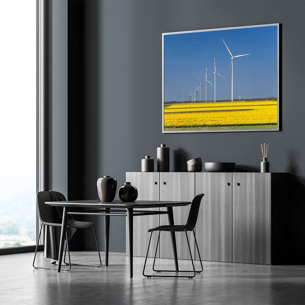 Embrace the balance of nature and modern innovation with this striking wall art showcasing Holland’s iconic yellow tulip fields and wind turbines. This artwork captures the harmony between the natural beauty of blooming tulips and the sleek, modern design of wind turbines against a clear blue sky. Ideal for nature lovers and those who appreciate eco-friendly landscapes, this piece adds a fresh, modern touch to any space.
