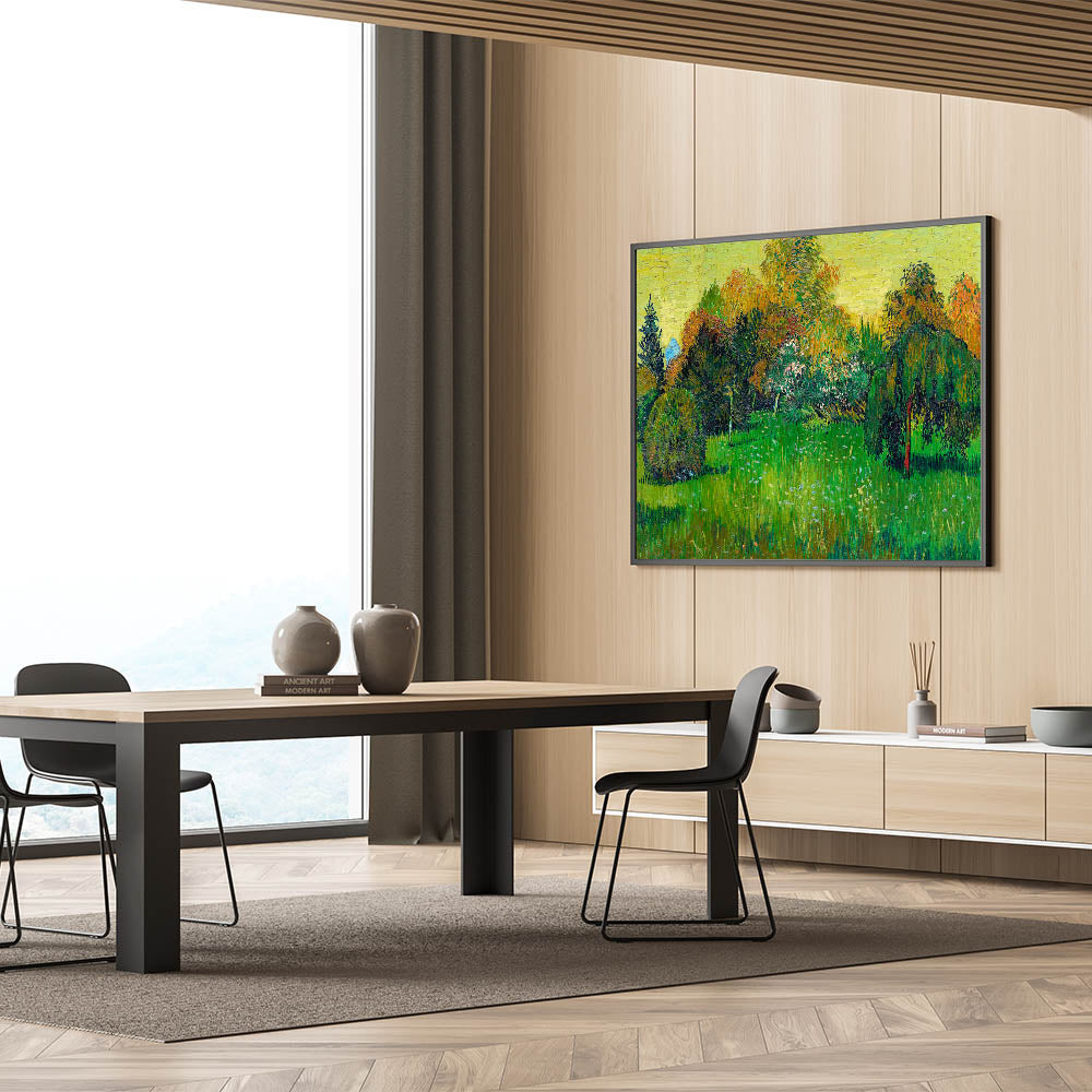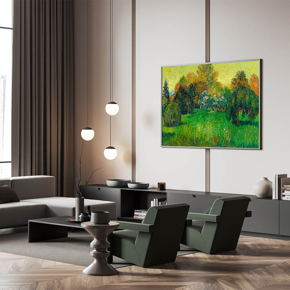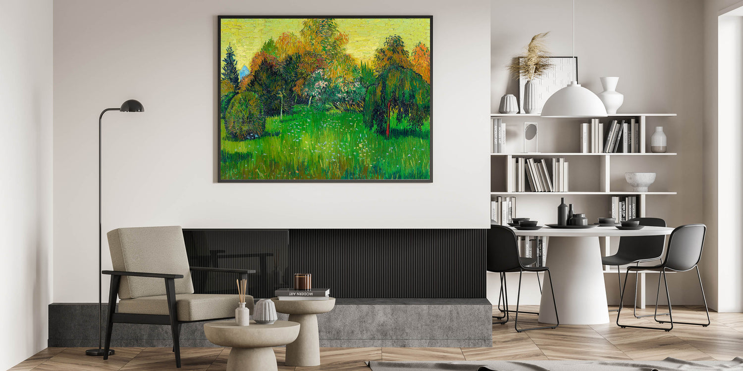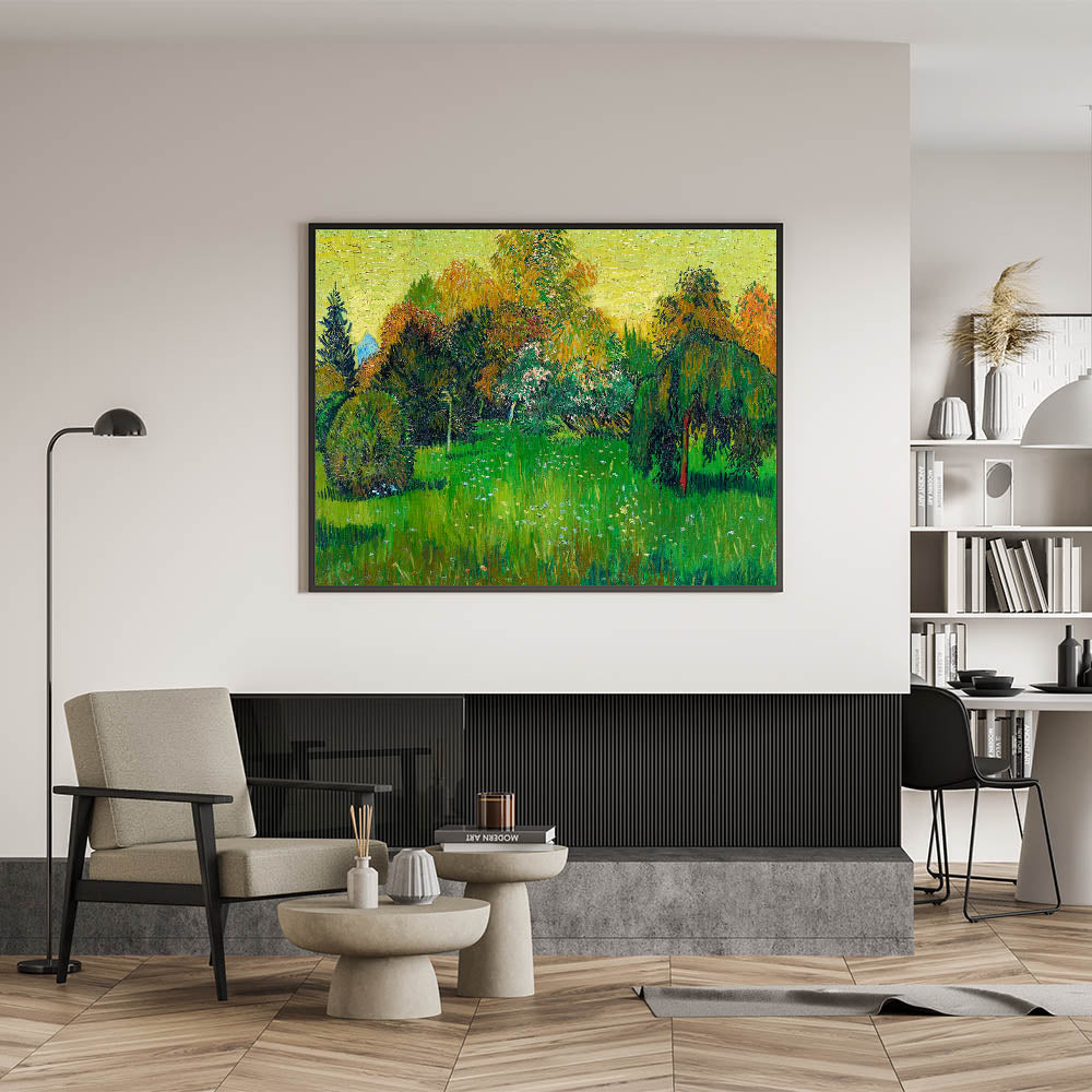 Bring the beauty of Impressionist landscapes into your home with Vincent van Gogh's "The Poet's Garden." This stunning painting captures the vibrant interplay of light and color, showcasing lush greenery and the warm hues of autumn foliage. Van Gogh’s signature brushwork and striking use of color evoke a sense of emotion and connection to nature, making it a timeless masterpiece.