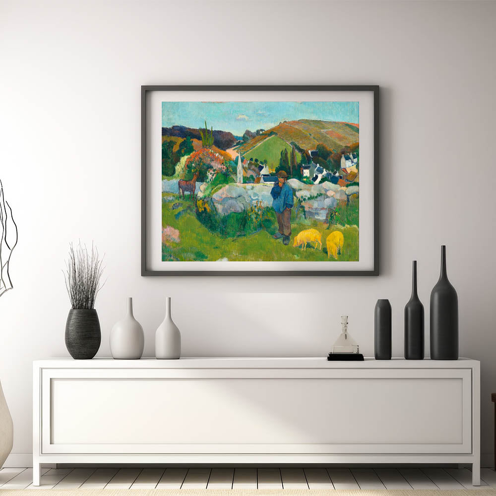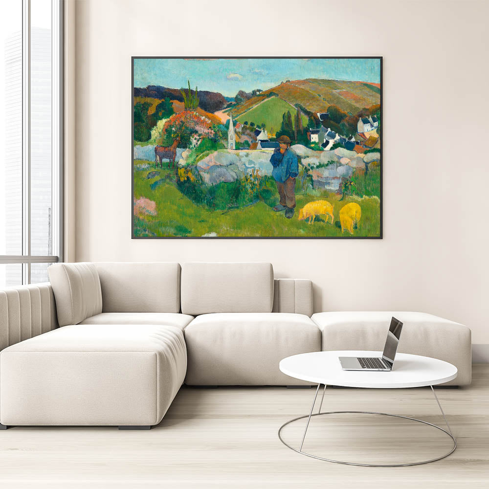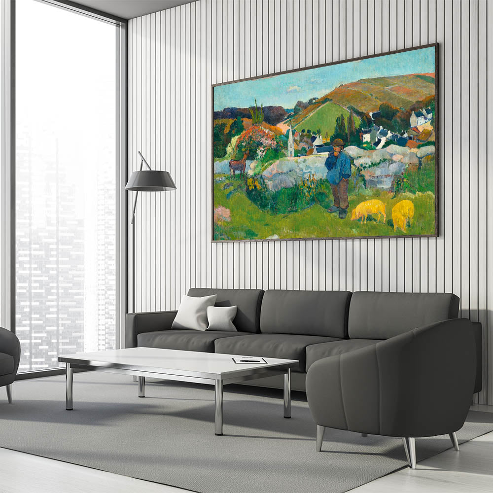 Transform your space with Paul Gauguin’s "The Swineherd," a masterful Impressionist painting created in 1888. This vibrant artwork captures a pastoral scene in Brittany, featuring a contemplative swineherd amidst lush greenery, rolling hills, and vibrant village life. Gauguin’s bold colors and fluid forms evoke a sense of simplicity and harmony with nature, making this piece a timeless addition to any collection.
