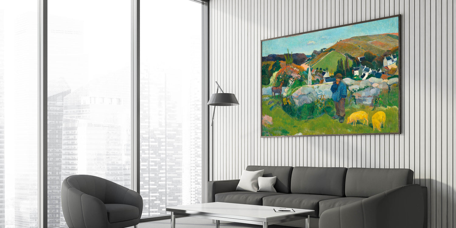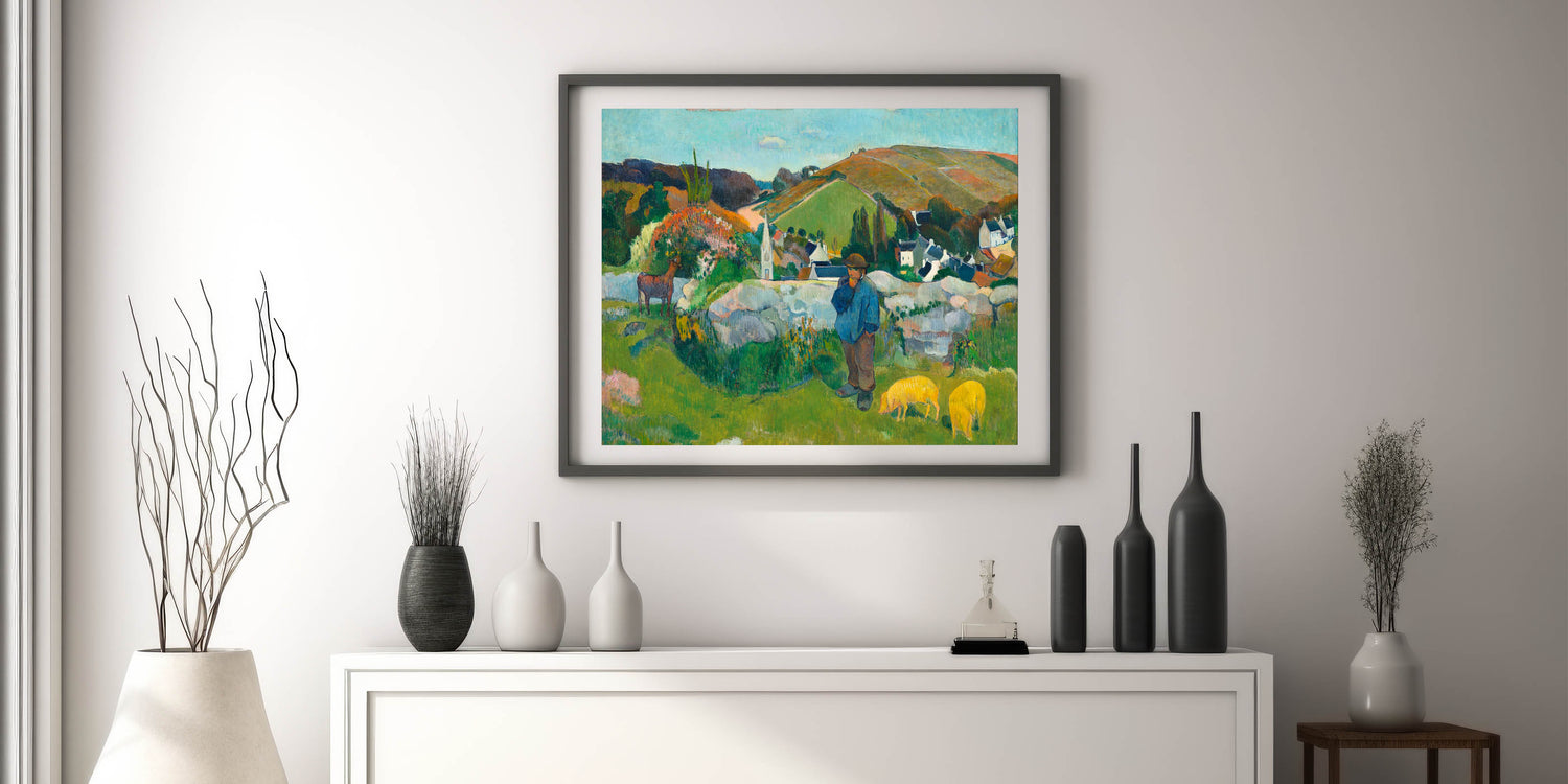 "The Swineherd" invites viewers into a world of rural charm and vibrant natural beauty. This painting is a testament to Gauguin’s ability to blend color and form, making it a standout centerpiece in any décor.