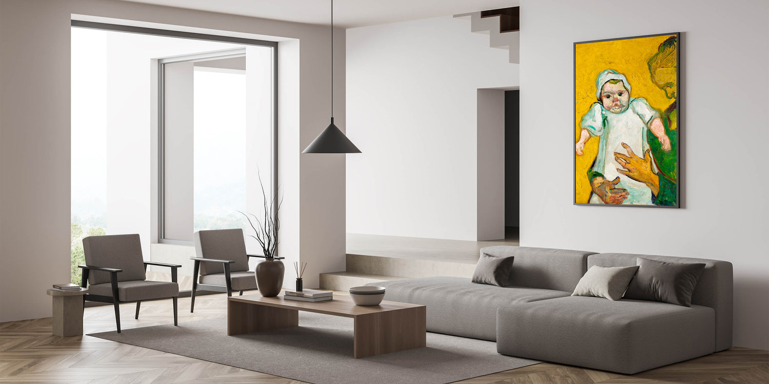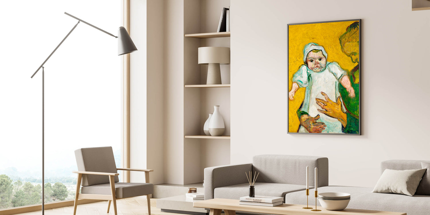 Introduce the warmth and intimacy of Impressionism into your home with "Madame Roulin and Her Baby" by Vincent van Gogh. This vibrant portrait captures the bond between mother and child, set against a striking yellow background. Van Gogh’s expressive brushstrokes and unique color choices make this artwork an eye-catching and emotional addition to any decor.