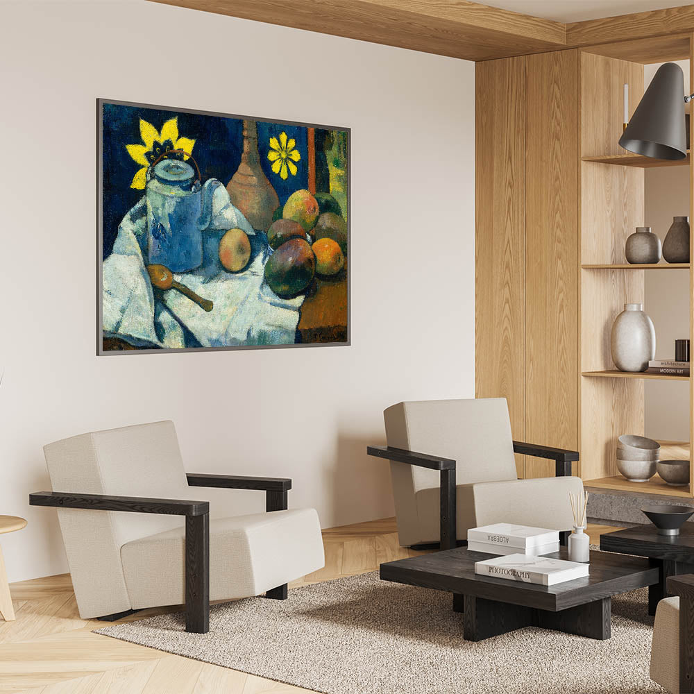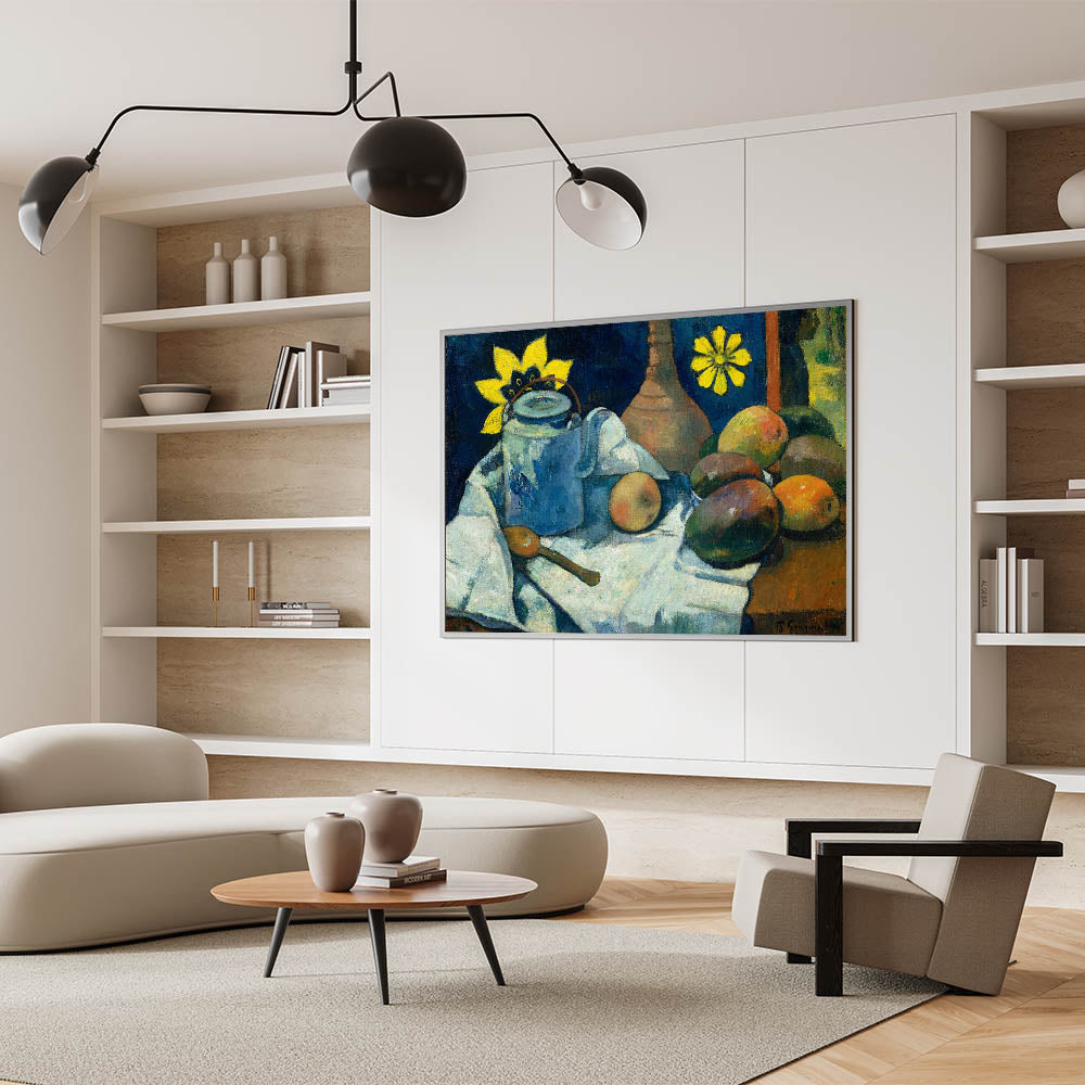 - Design: A vibrant still life with a teapot, fruit, and flowers, showcasing Gauguin’s expressive Impressionist style.