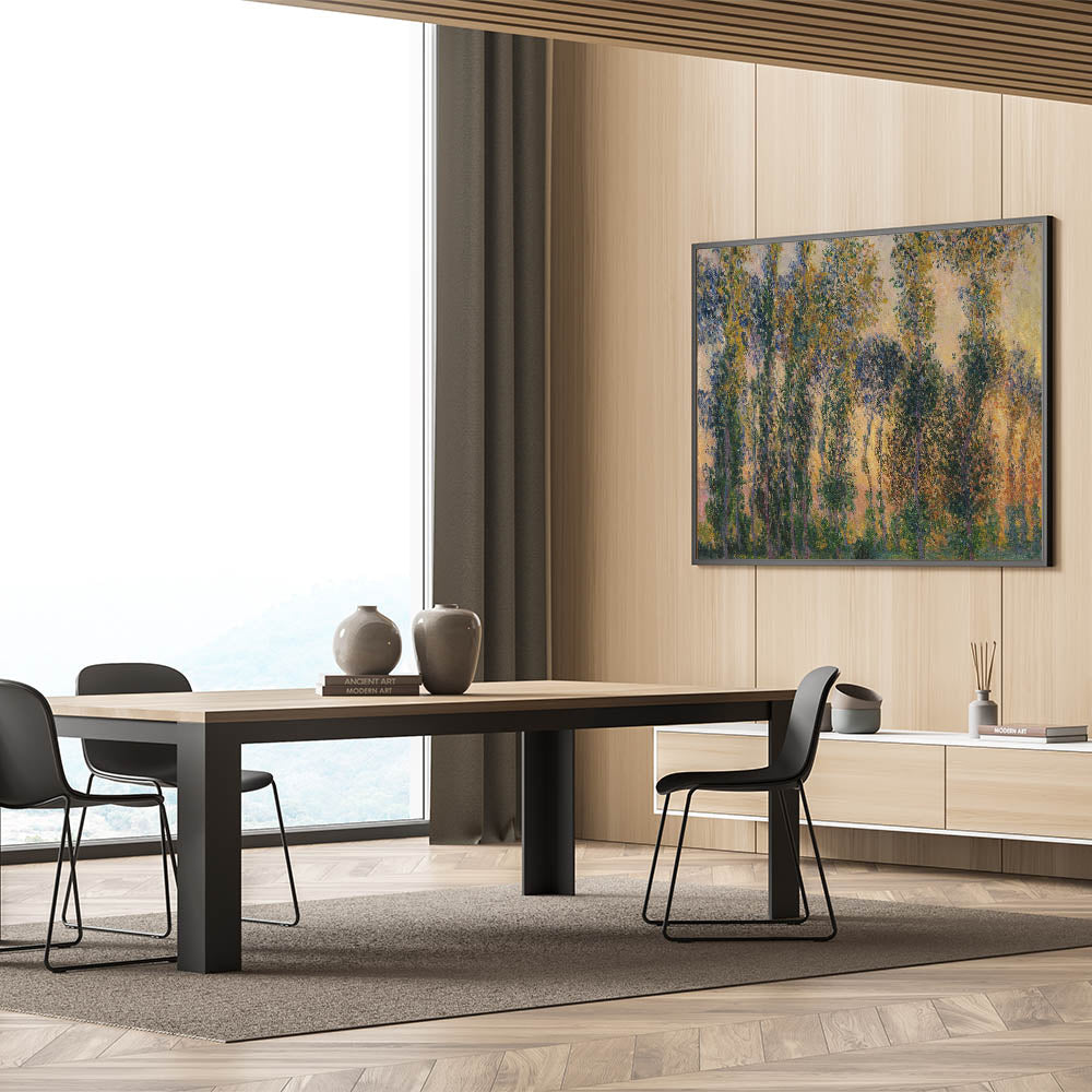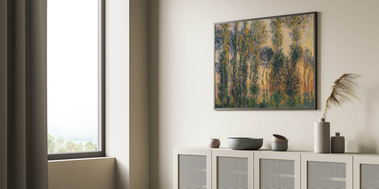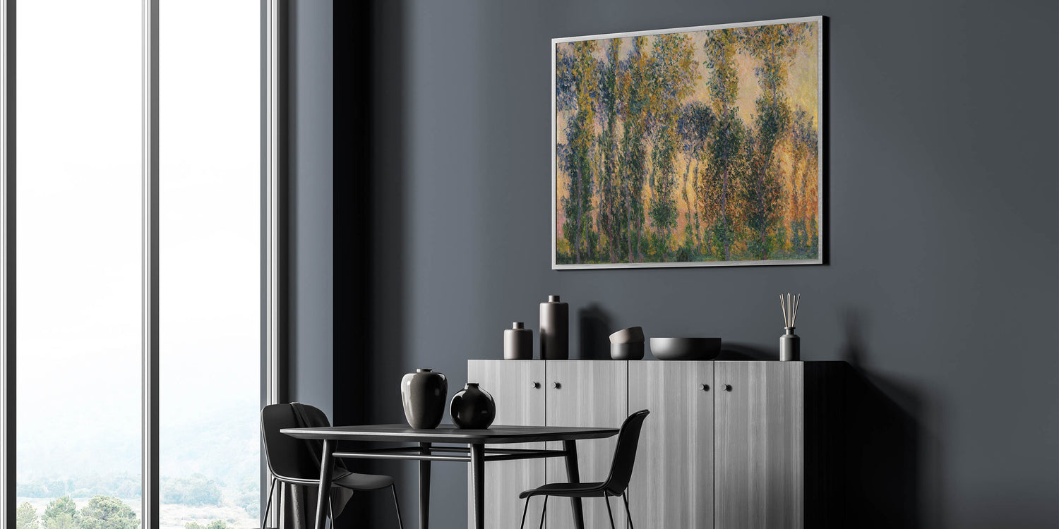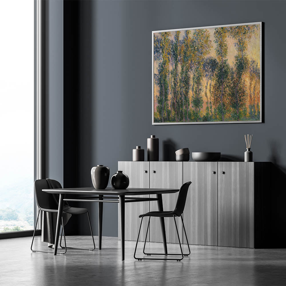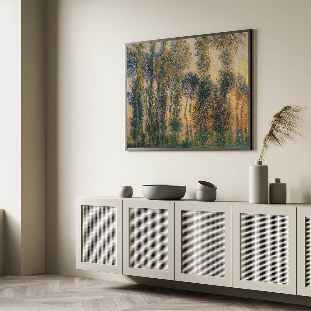 Capture the golden glow of morning with this Impressionist wall art inspired by Claude Monet's Poplars at Giverny, Sunrise. This painting depicts a line of tall poplar trees bathed in warm, early sunlight, with colors blending harmoniously to create a serene atmosphere. Monet’s brushstrokes bring the landscape to life, offering a beautiful play of light and shadow that adds depth to any room.