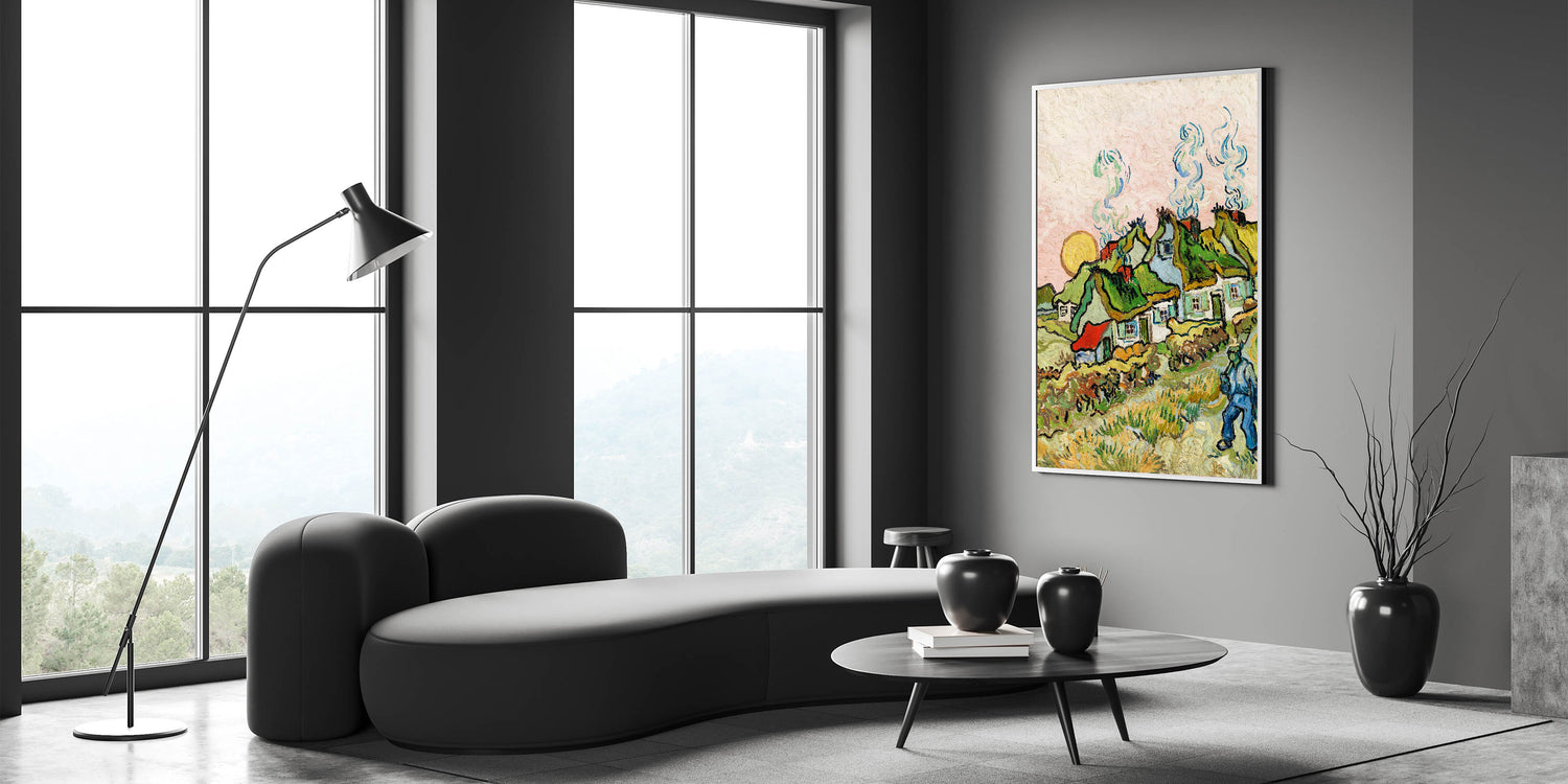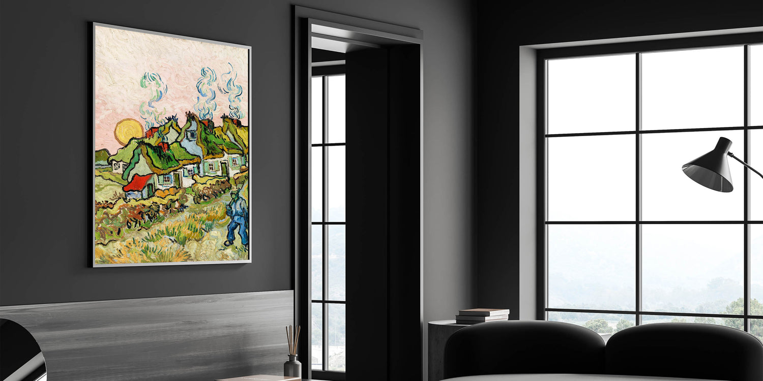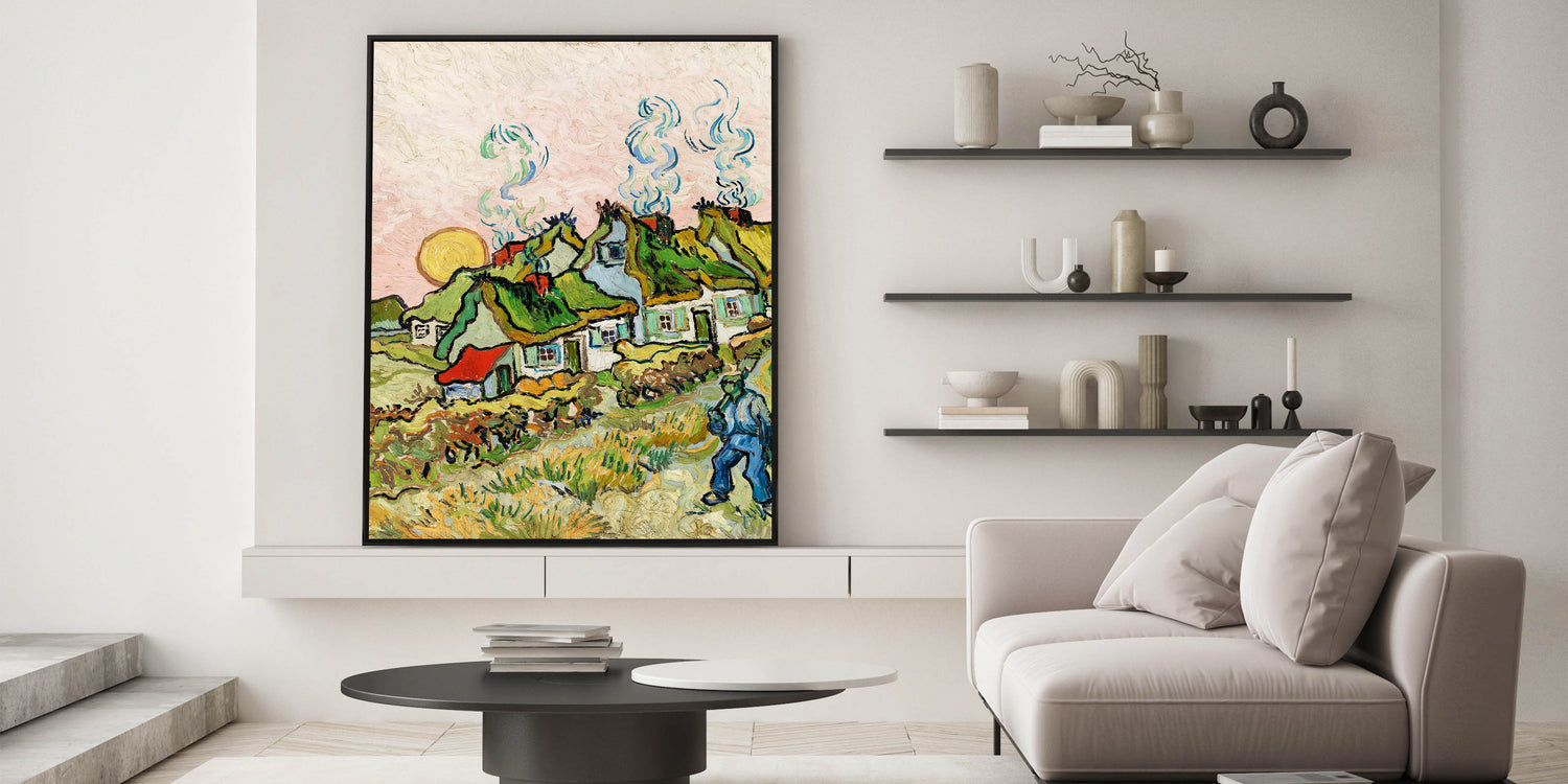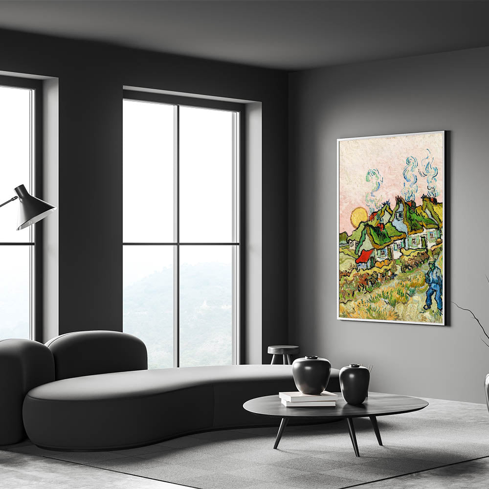 Bring the unique, expressive style of Vincent Van Gogh into your home with "Houses and Figure." This colorful artwork depicts a row of thatched cottages under a bright, swirling sky, with a lone figure walking along a path. Van Gogh's signature brushwork and bold use of greens, yellows, and reds capture the energy and warmth of rural life, making this print an ideal choice for those who appreciate Impressionist landscapes.